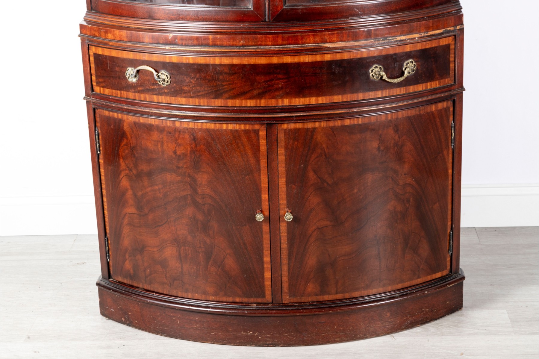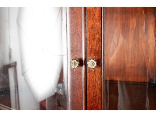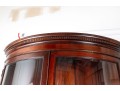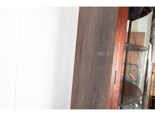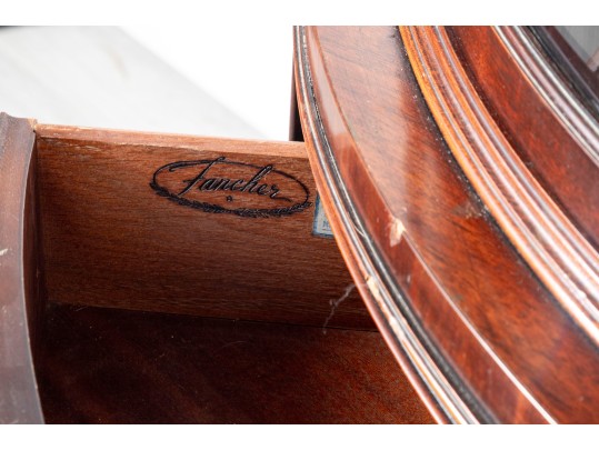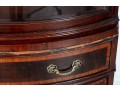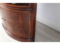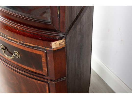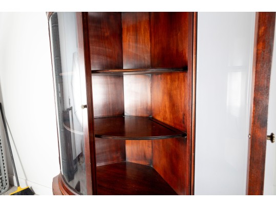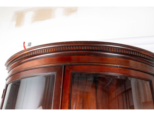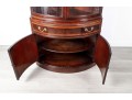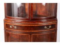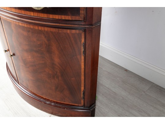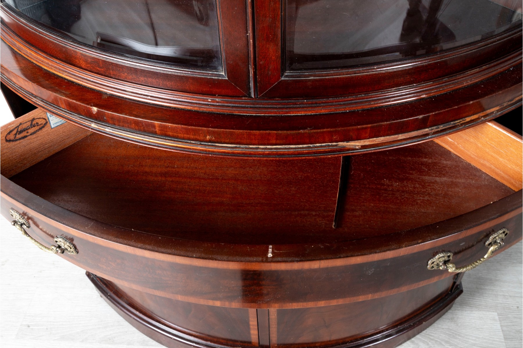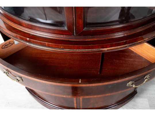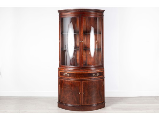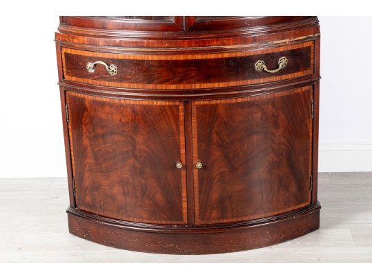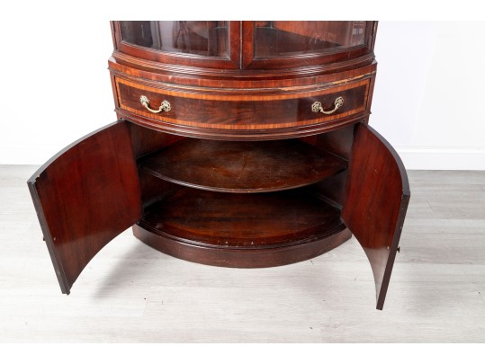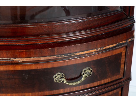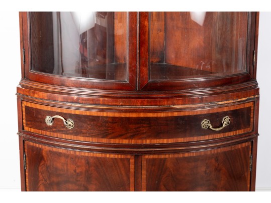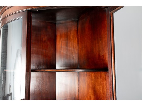 A stately mahogany corner cabinet produced by Fancher Furniture, vintage in the style of federal with bow-front, convex glass display hutch set over a single dovetailed drawers and an additional two-door cabinet space.