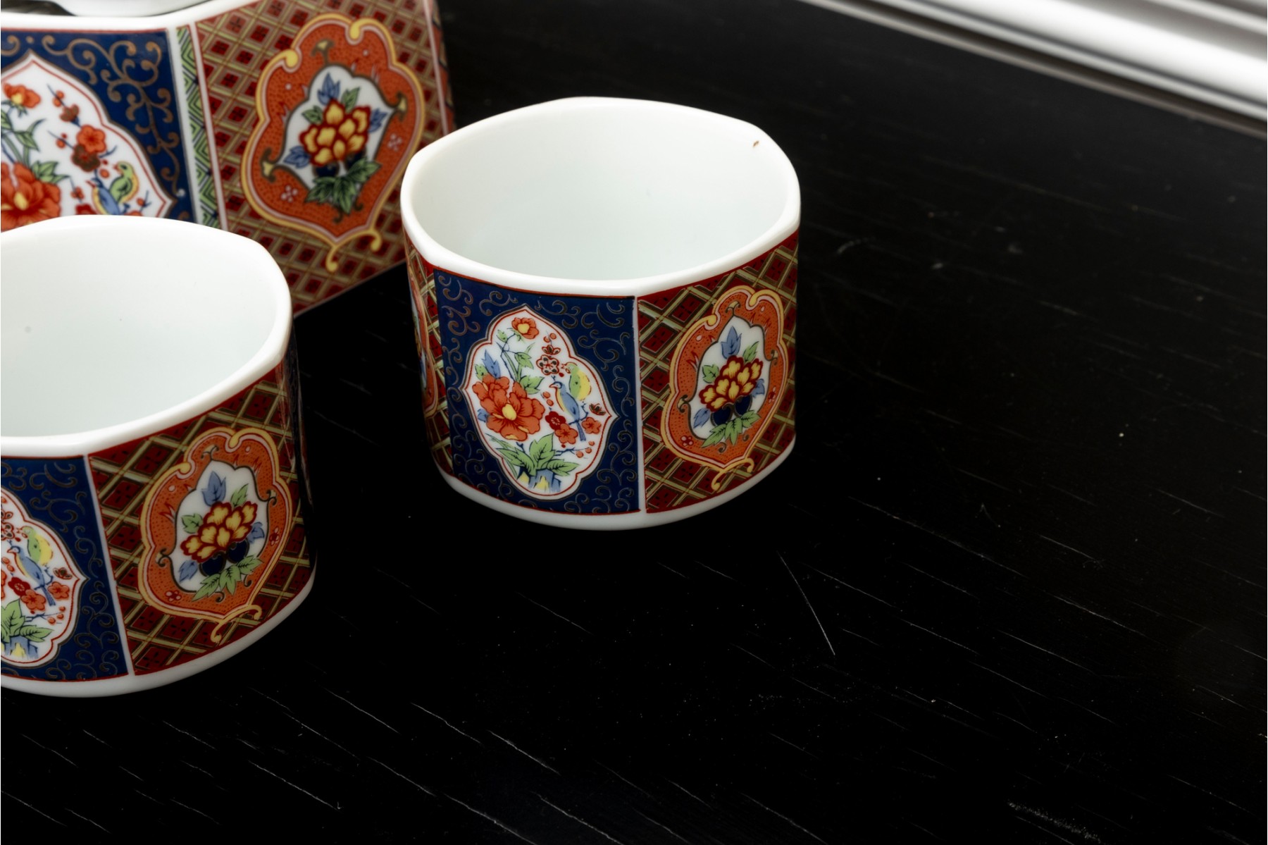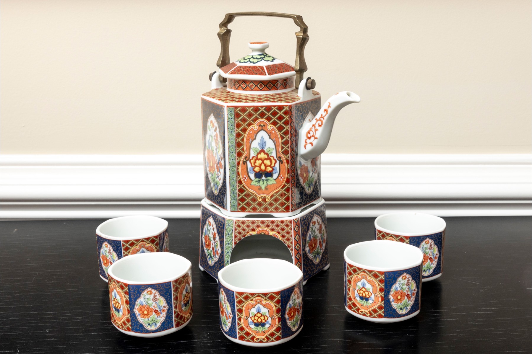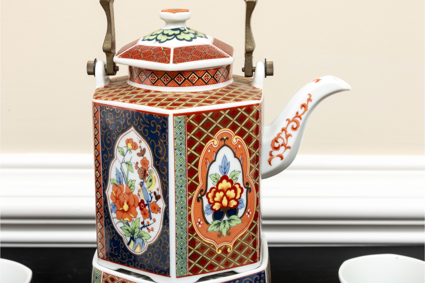 A beautiful Dophin Fine China porcelain tea service complete with samovar, burner, and five cups all adorned in Imari style patterns rich in floral motifs.