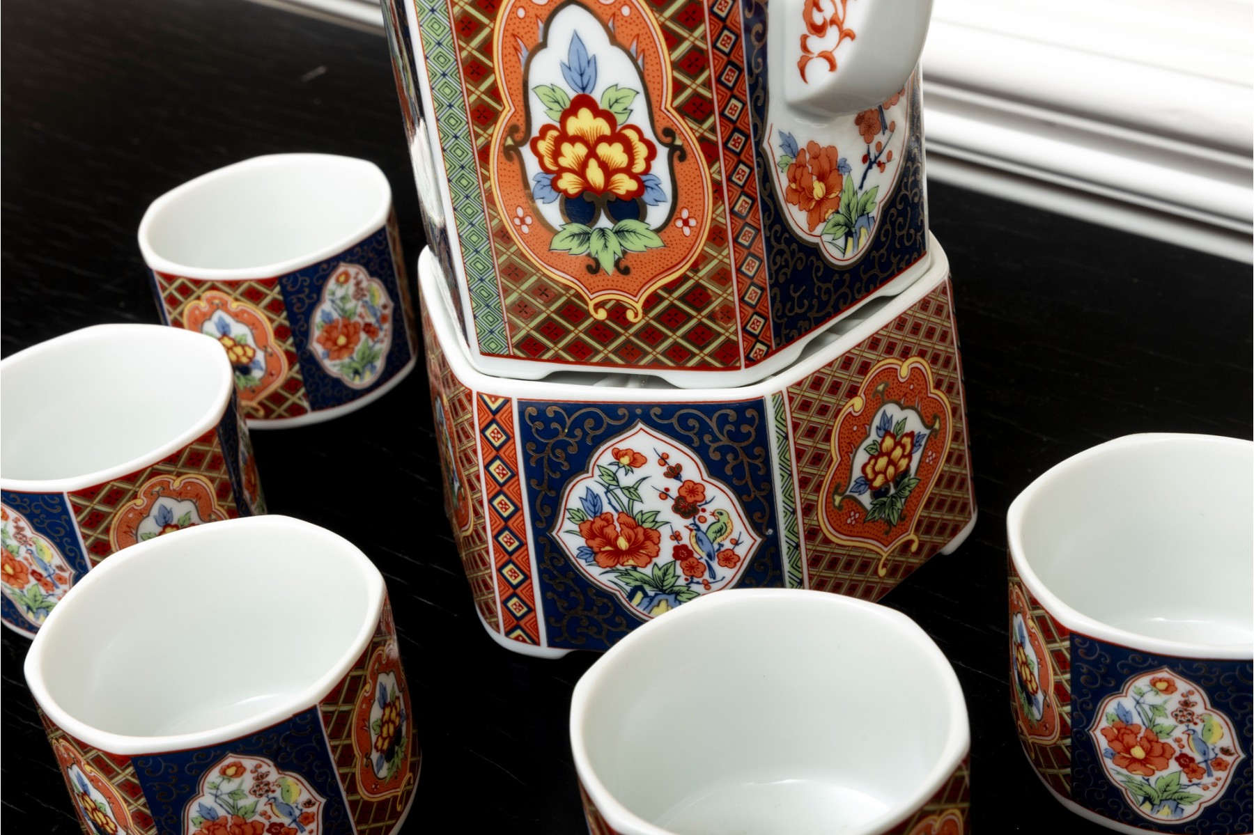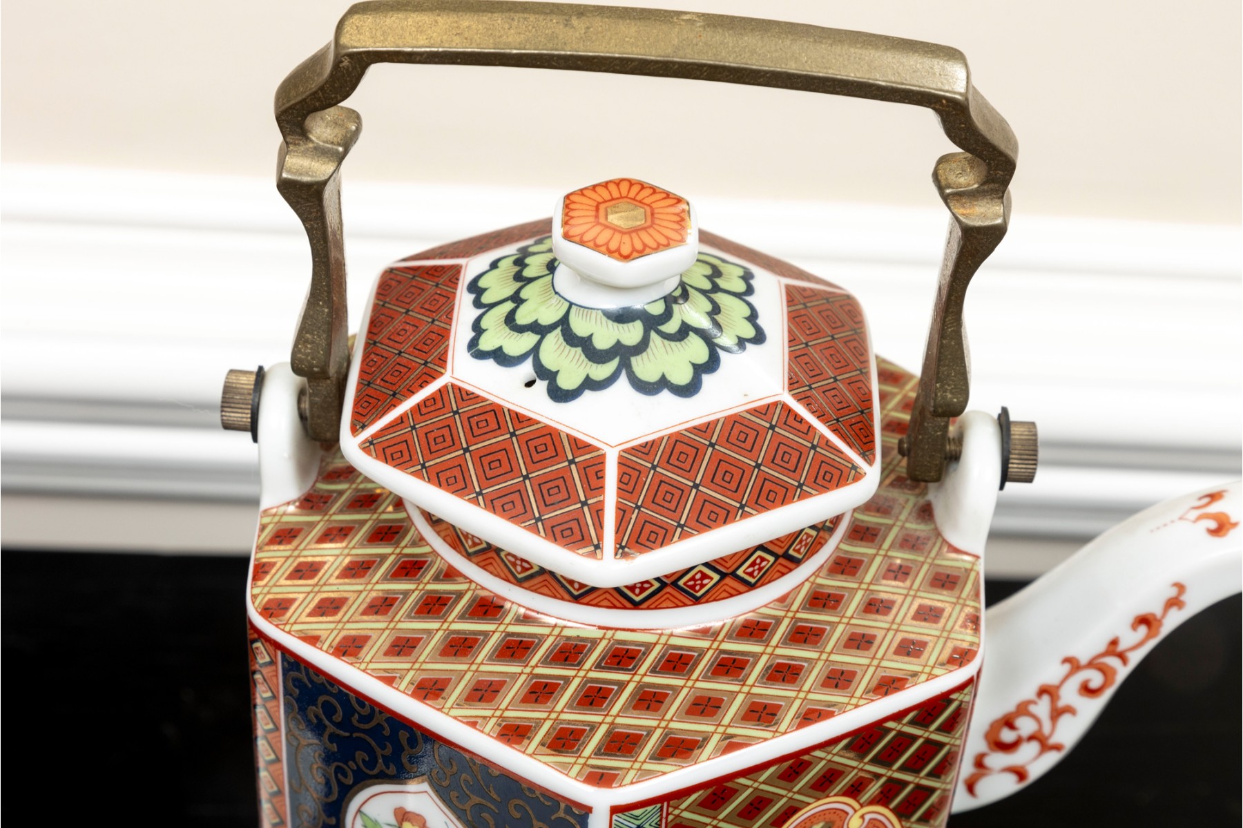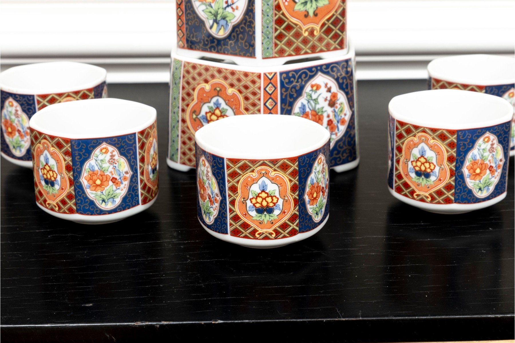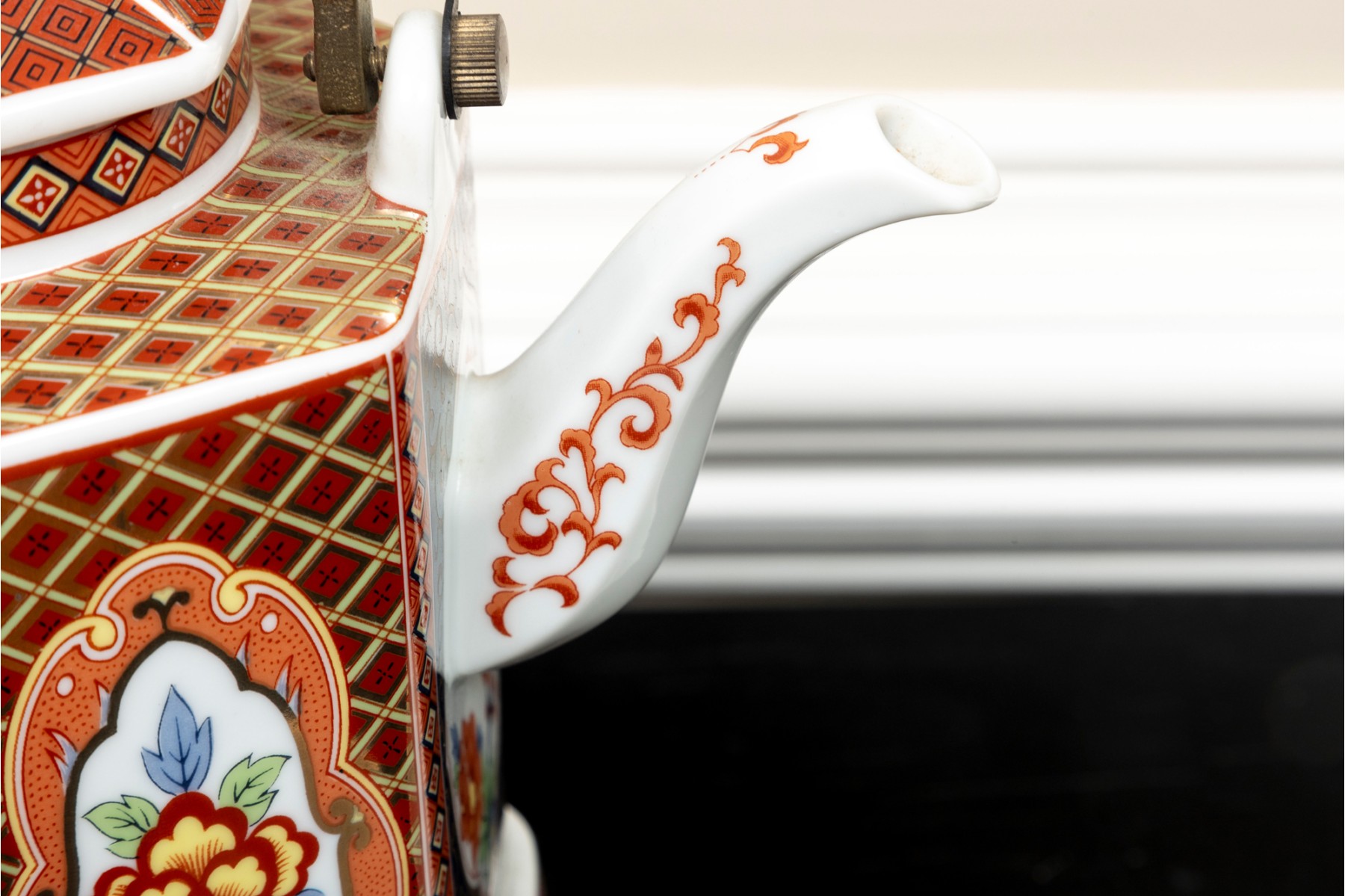A beautiful Dophin Fine China porcelain tea service complete with samovar, burner, and five cups all adorned in Imari style patterns rich in floral motifs.