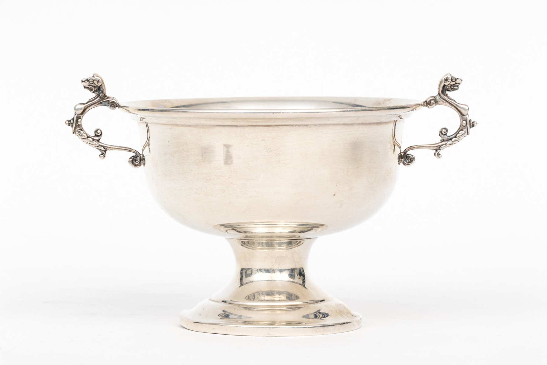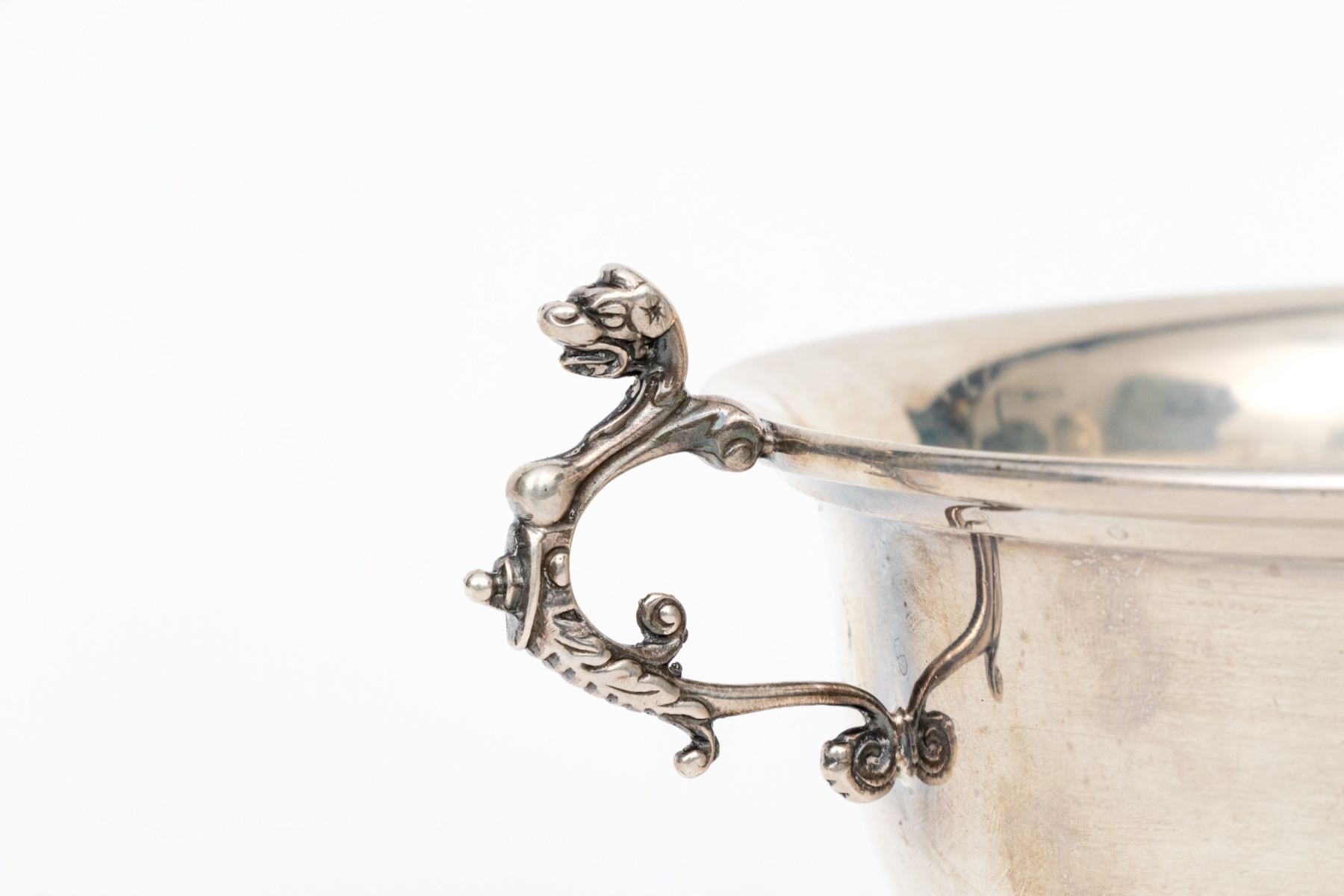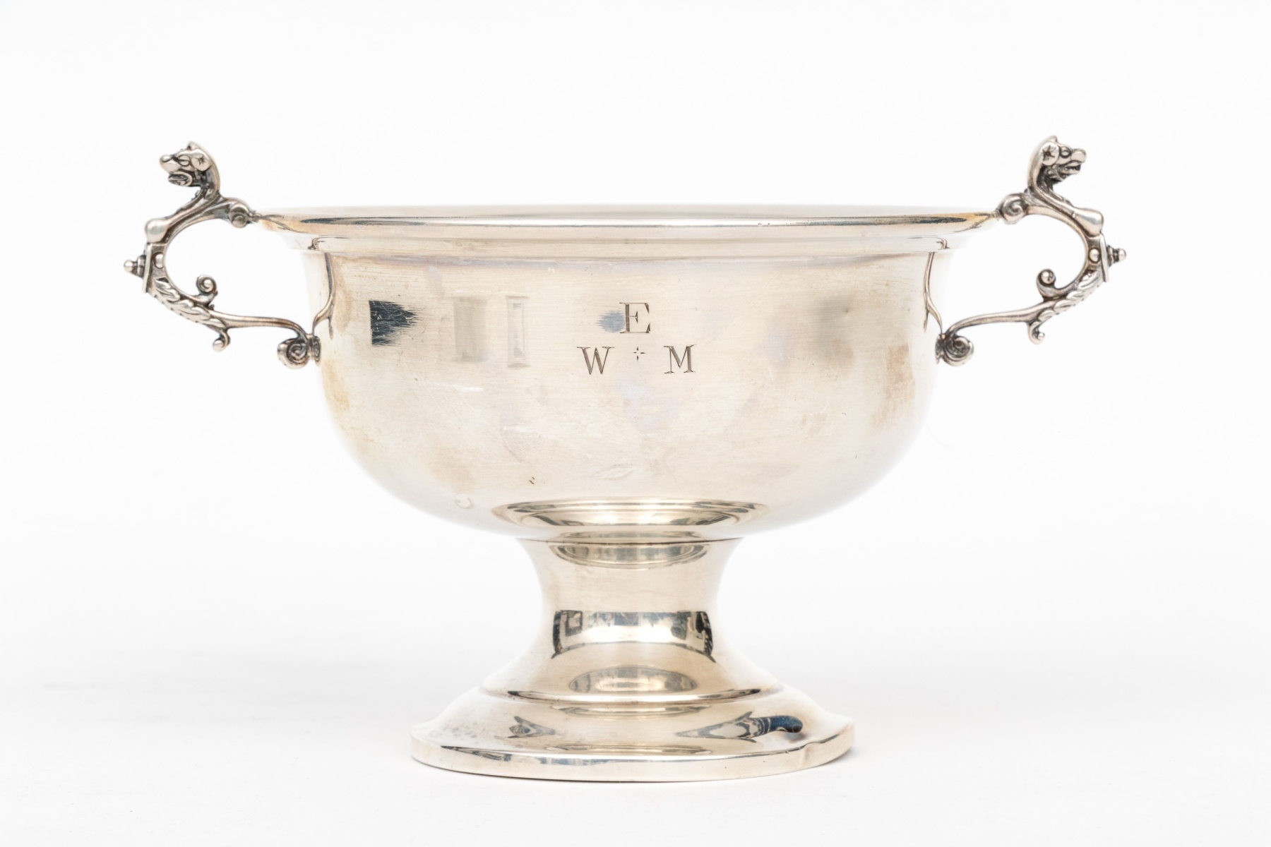 A deep footed bowl with twin scrolled dragon headed handles. Monogrammed.