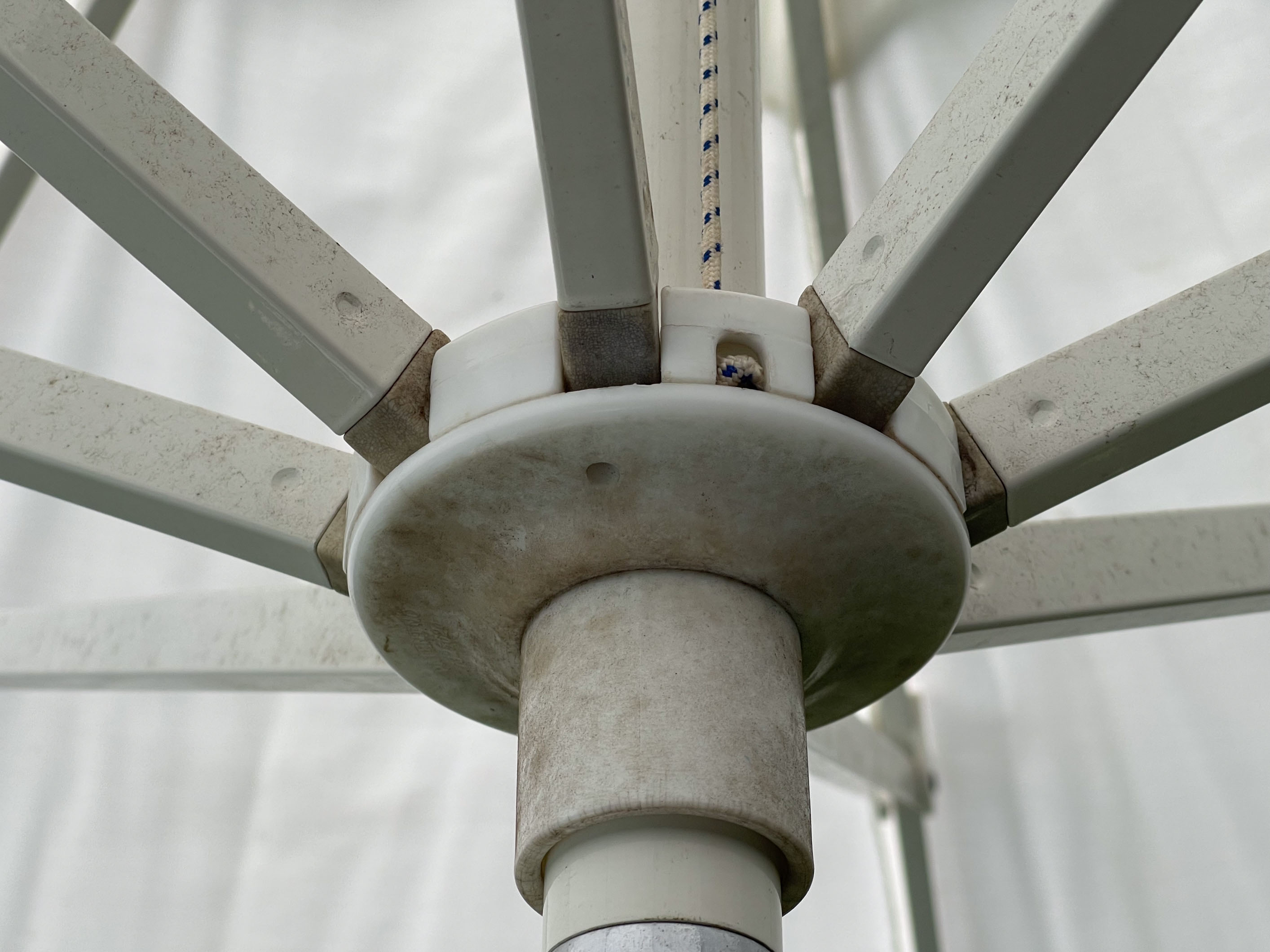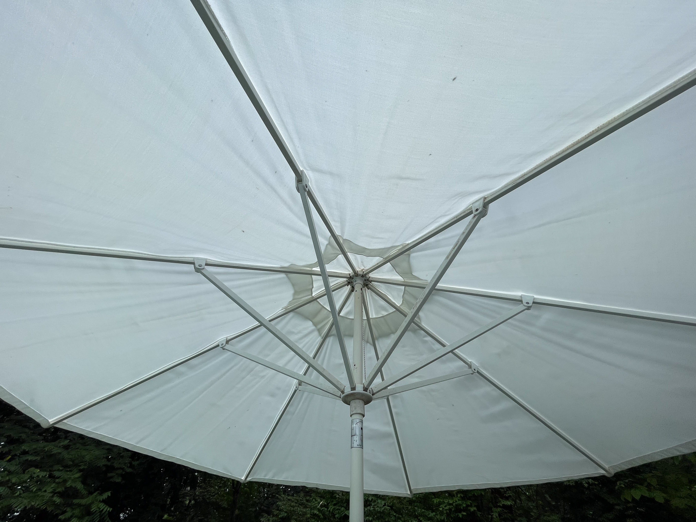 Weathered, exposed; umbrella fabric frayed at edges, see images as part of description.