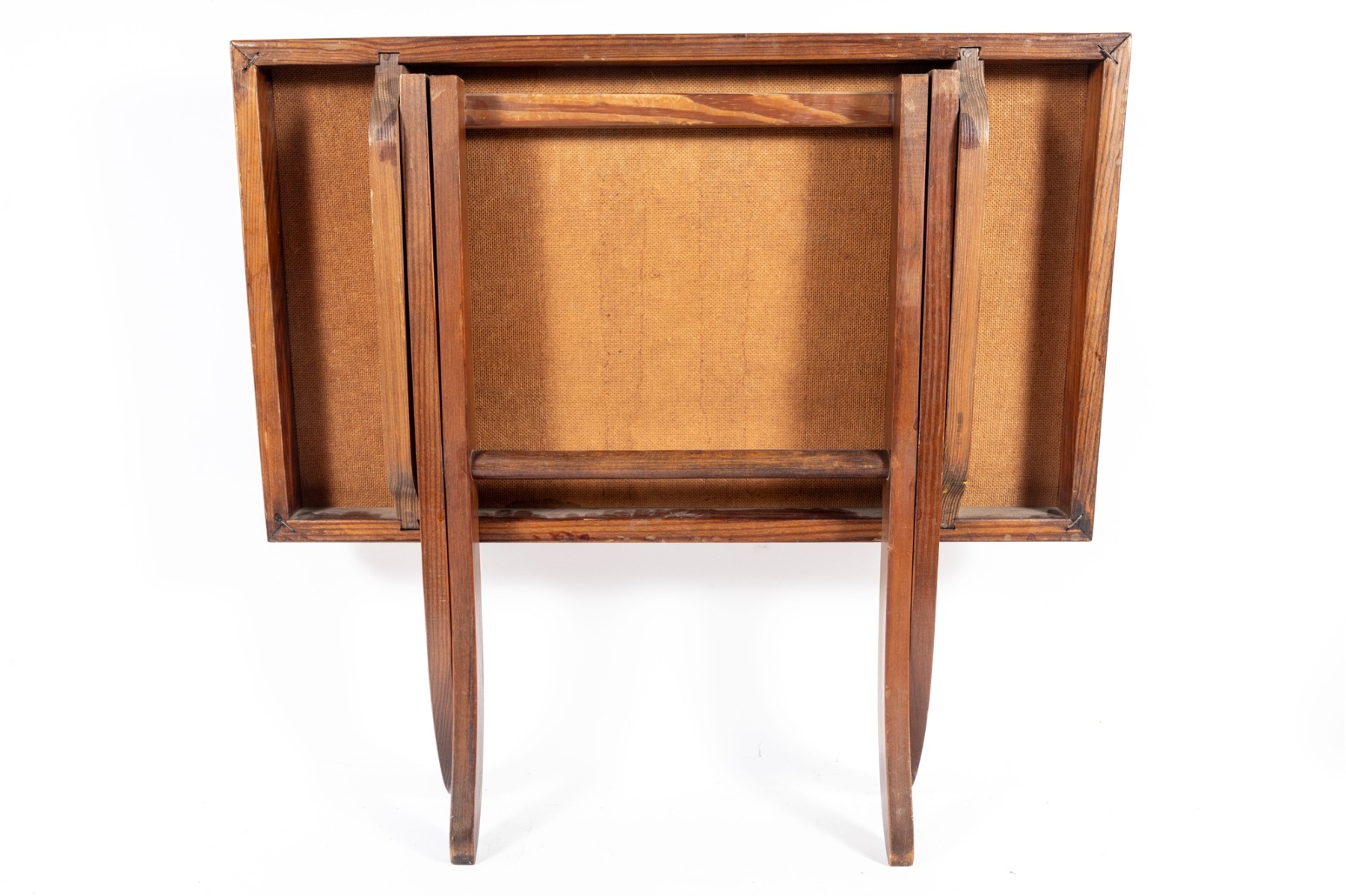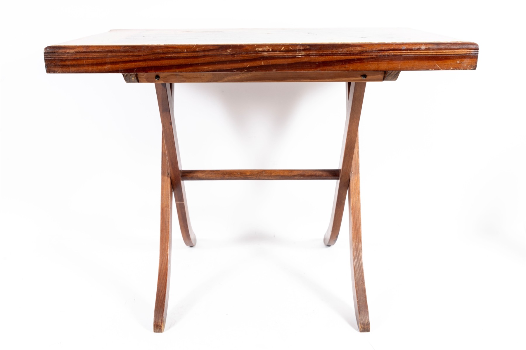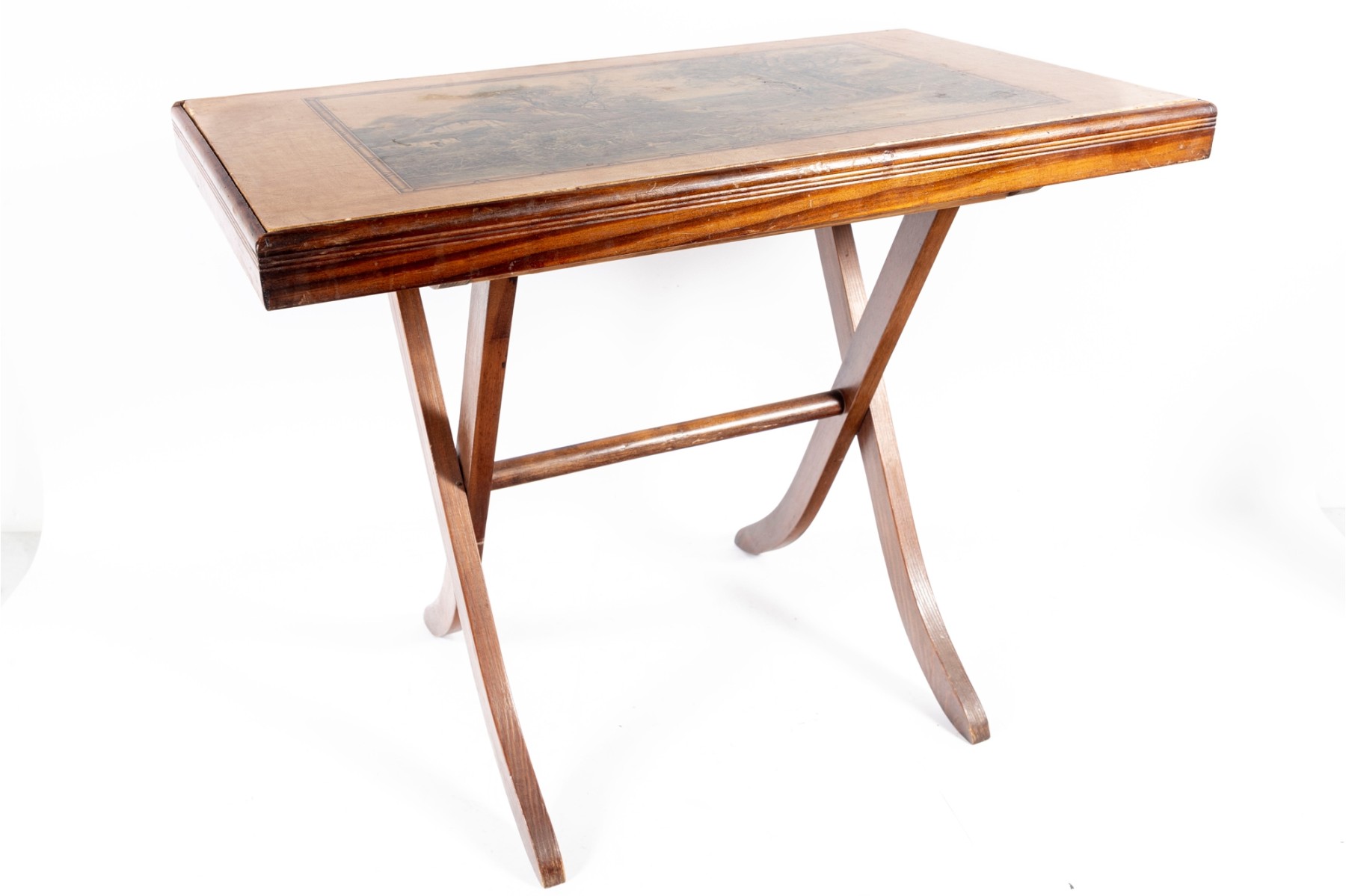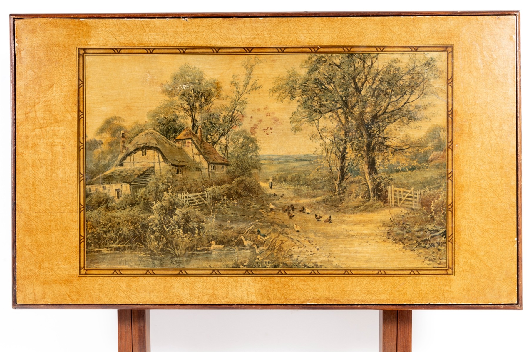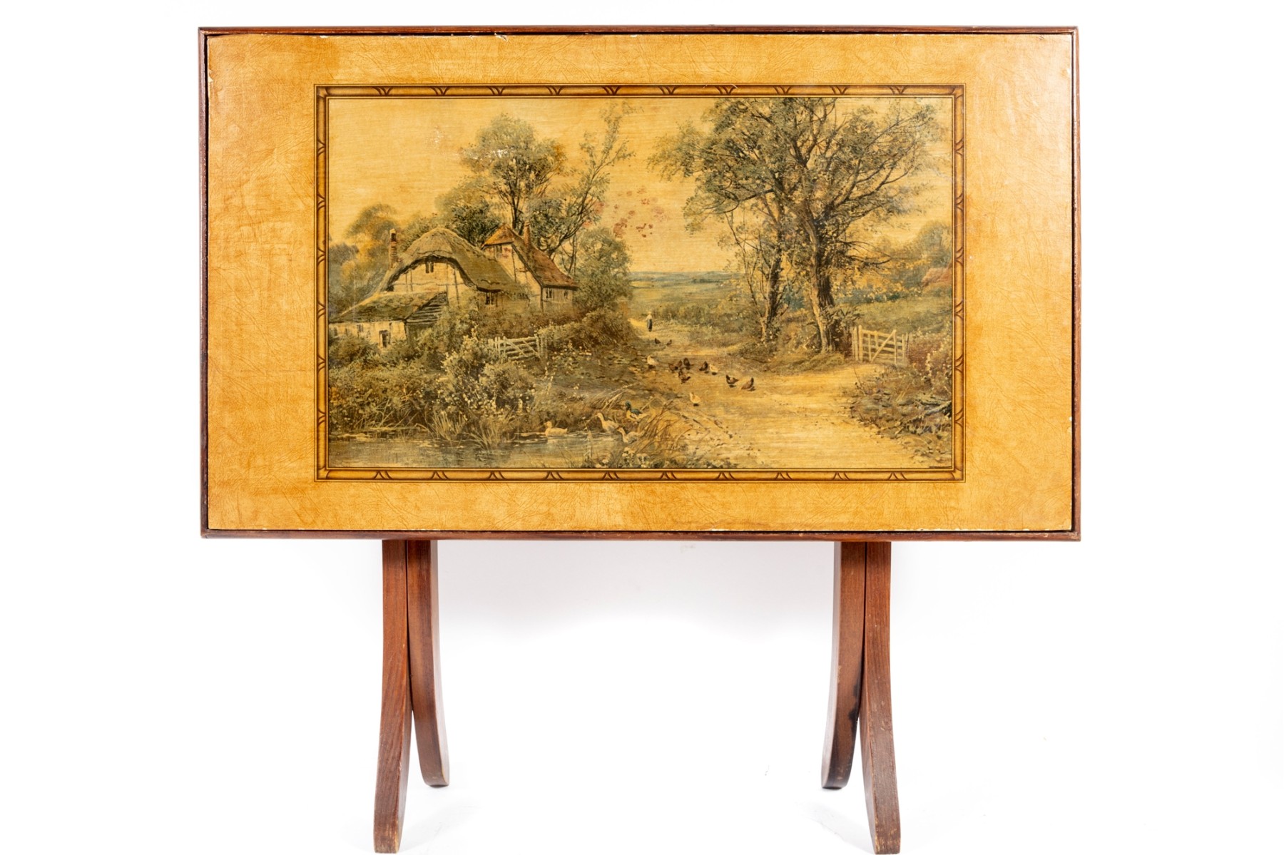 A vintage folding card table with an art board top showcasing a rural homestead scene. The table is supported on a wooden frame fitted with sabre legs.