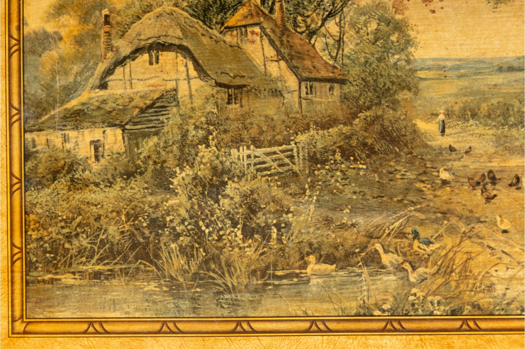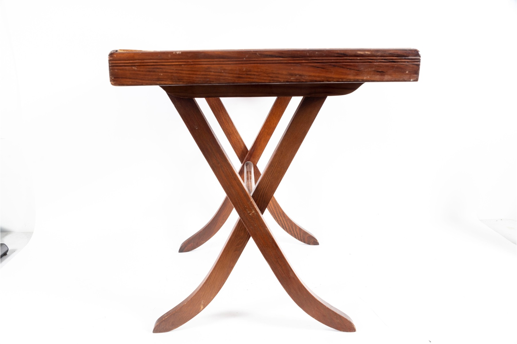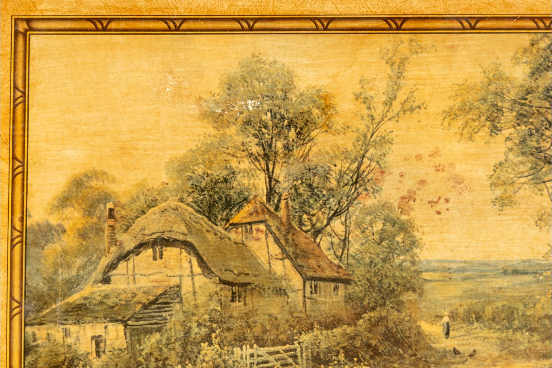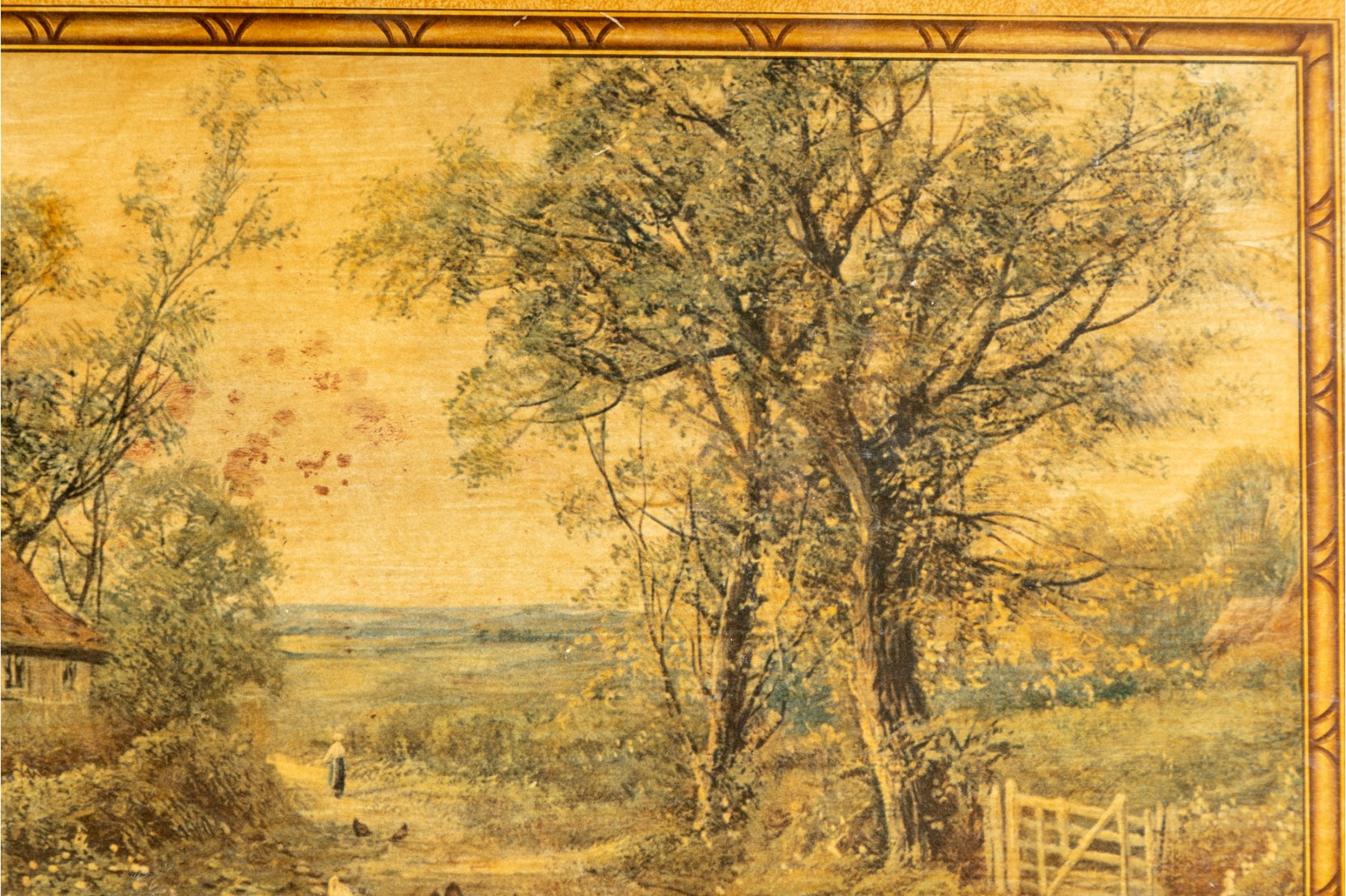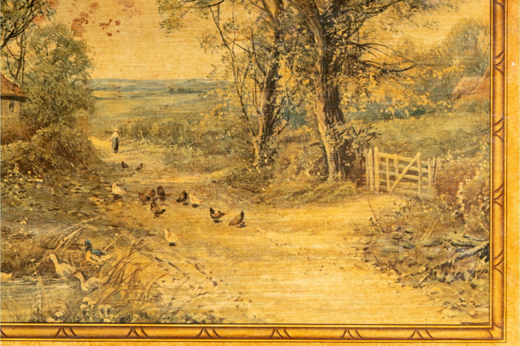 A vintage folding card table with an art board top showcasing a rural homestead scene. The table is supported on a wooden frame fitted with sabre legs.