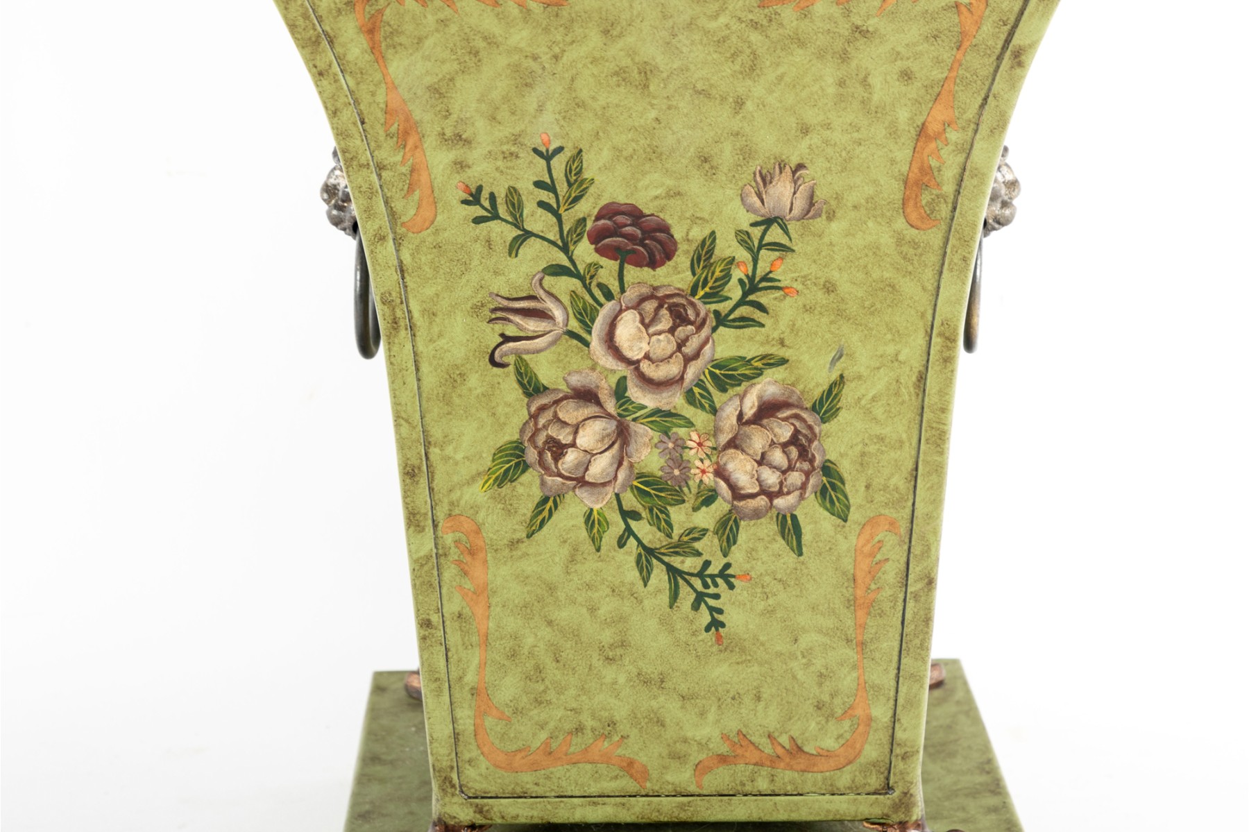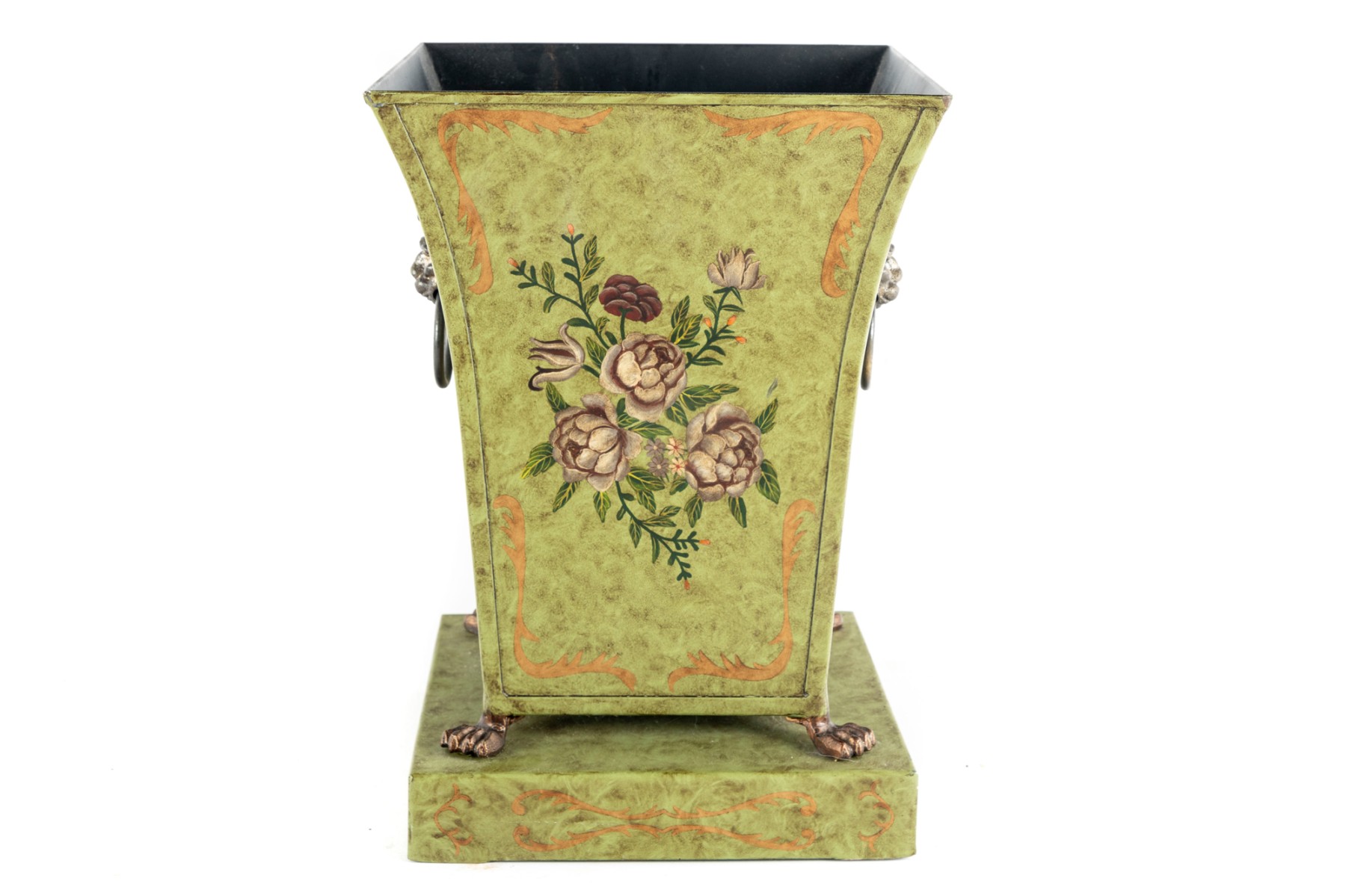 A tole planter, footed and mounted to a faux marble metal base and highly decorated with foliate designs.
