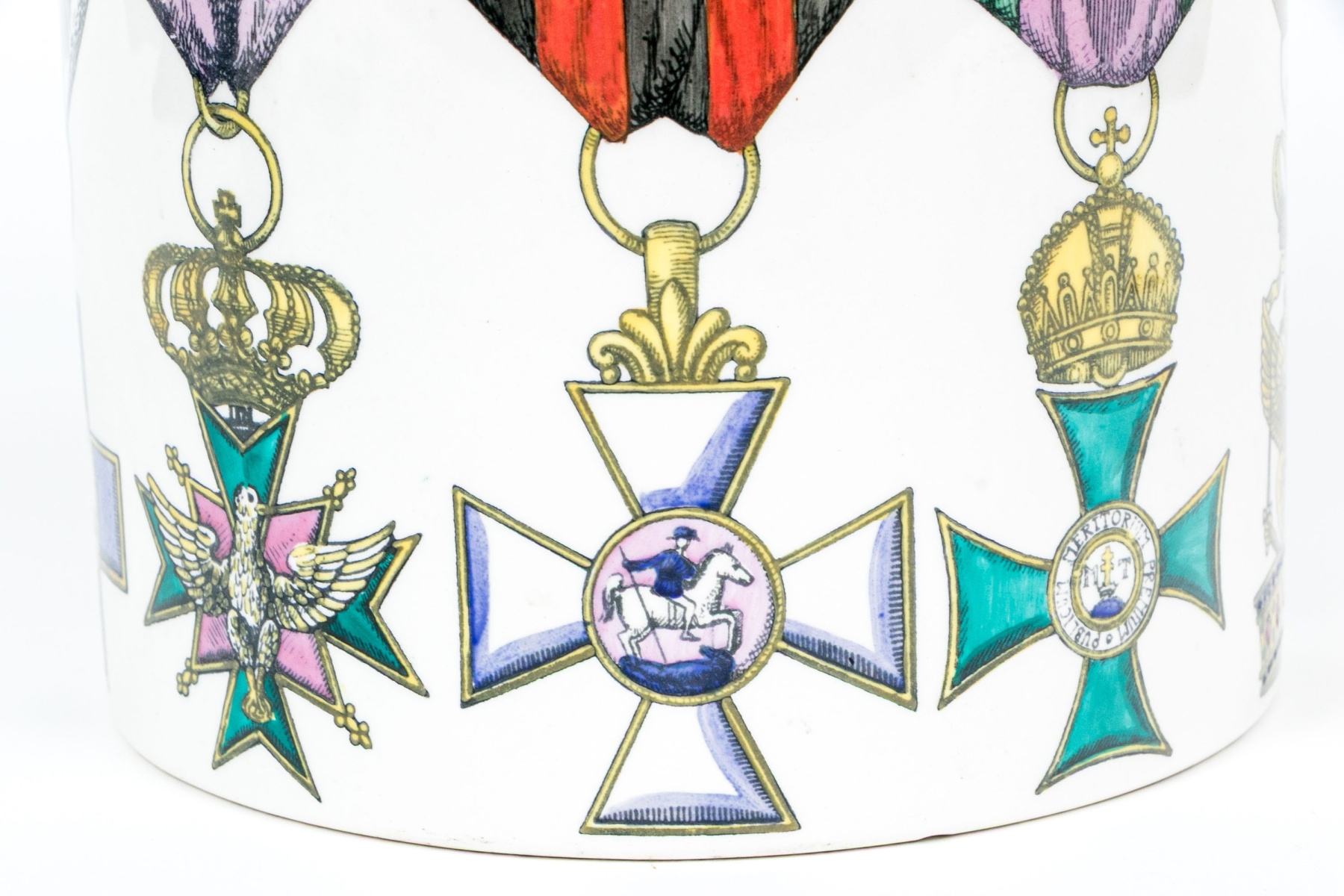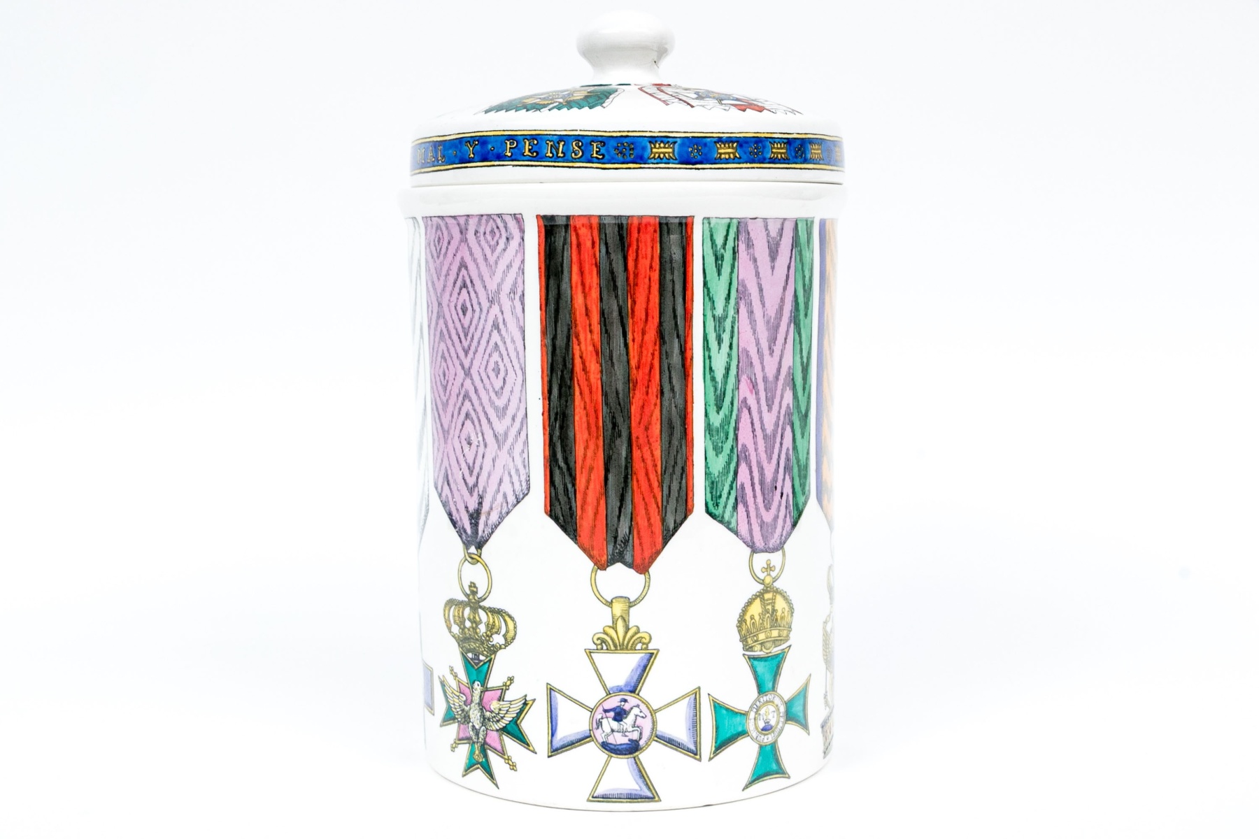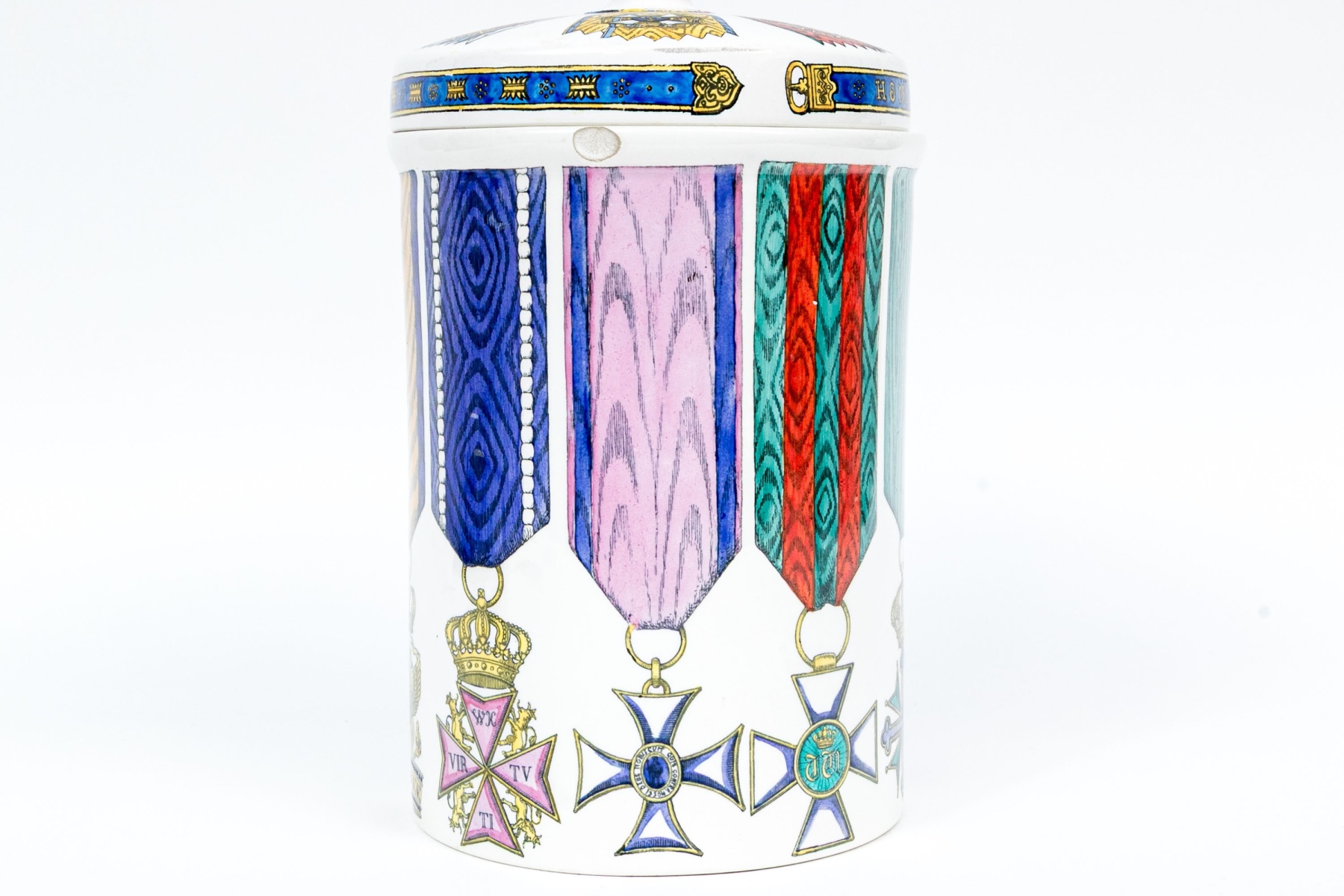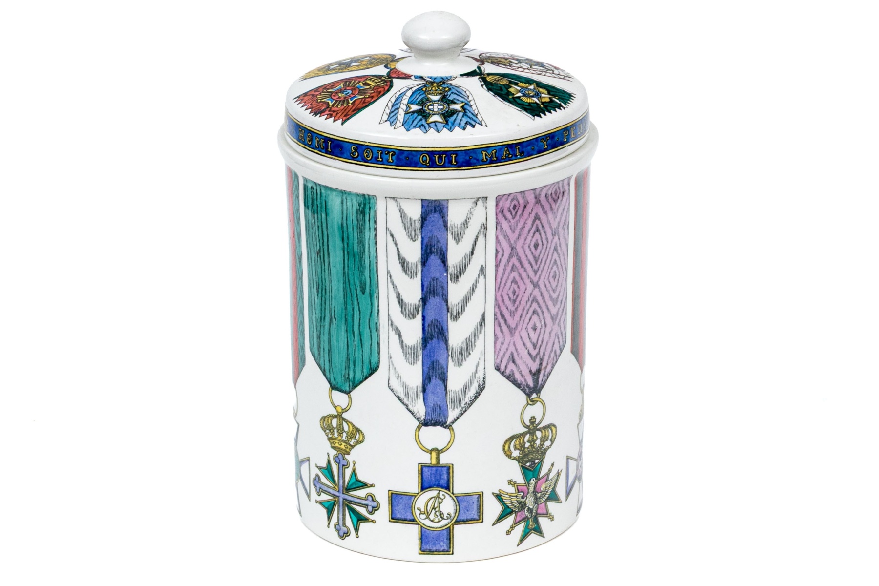 Made in Italy. A large white lidded cannister with a printed design of various colored medals on ribbons.