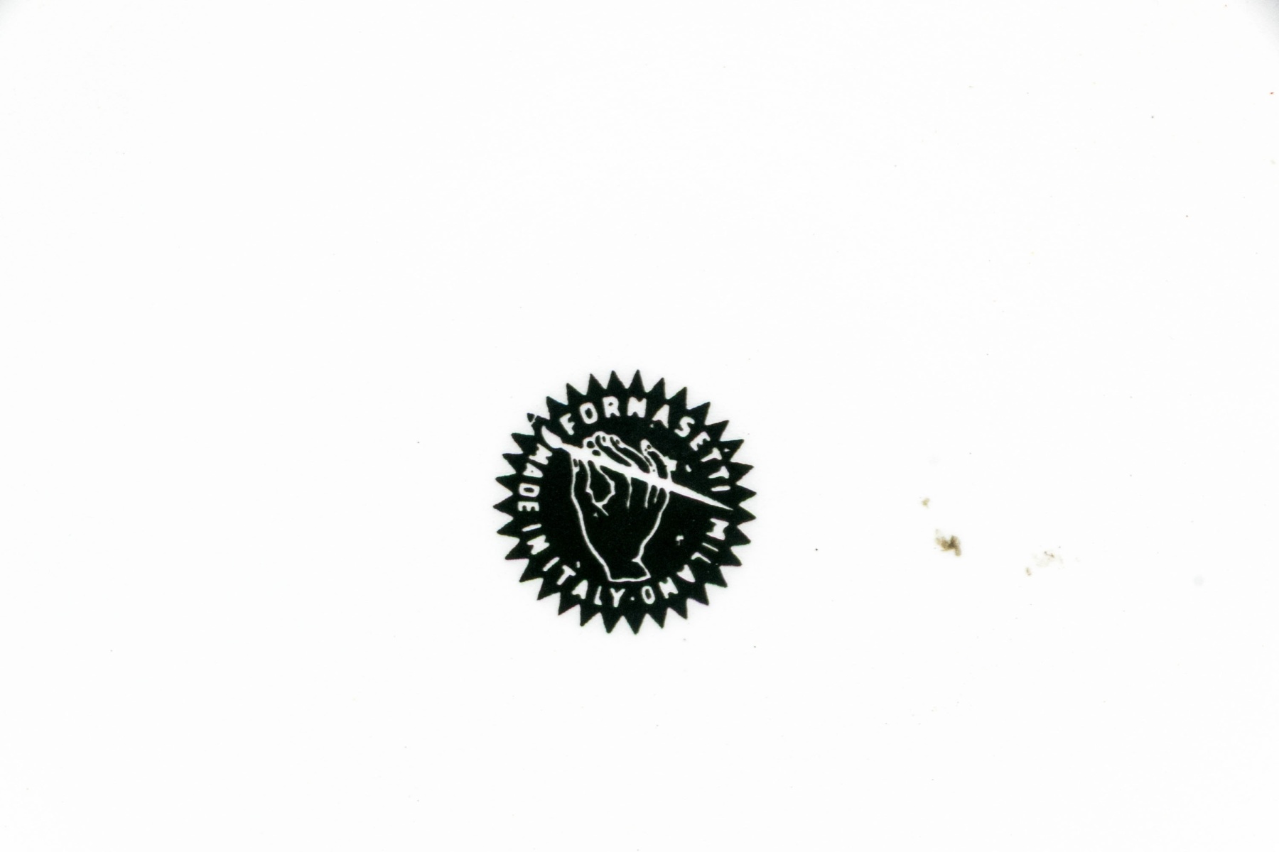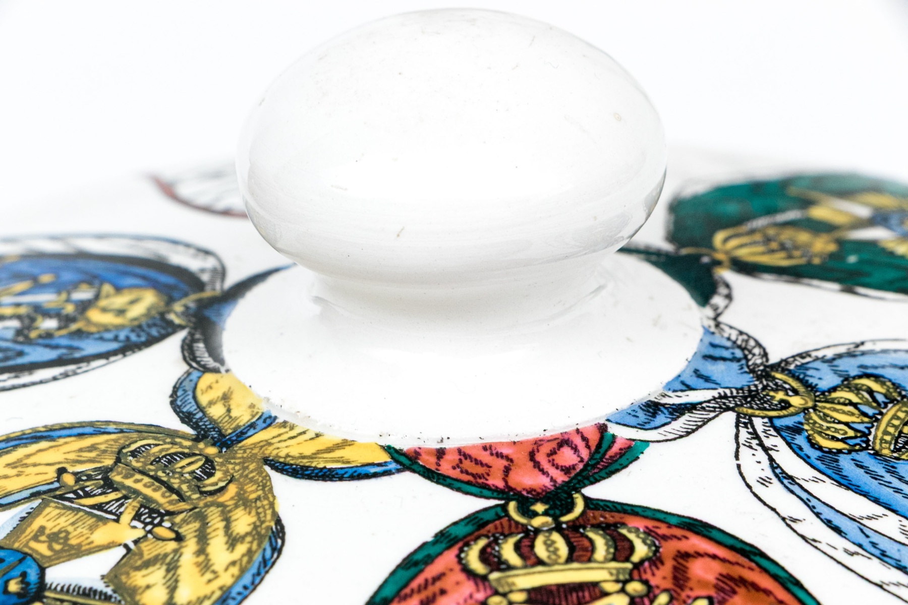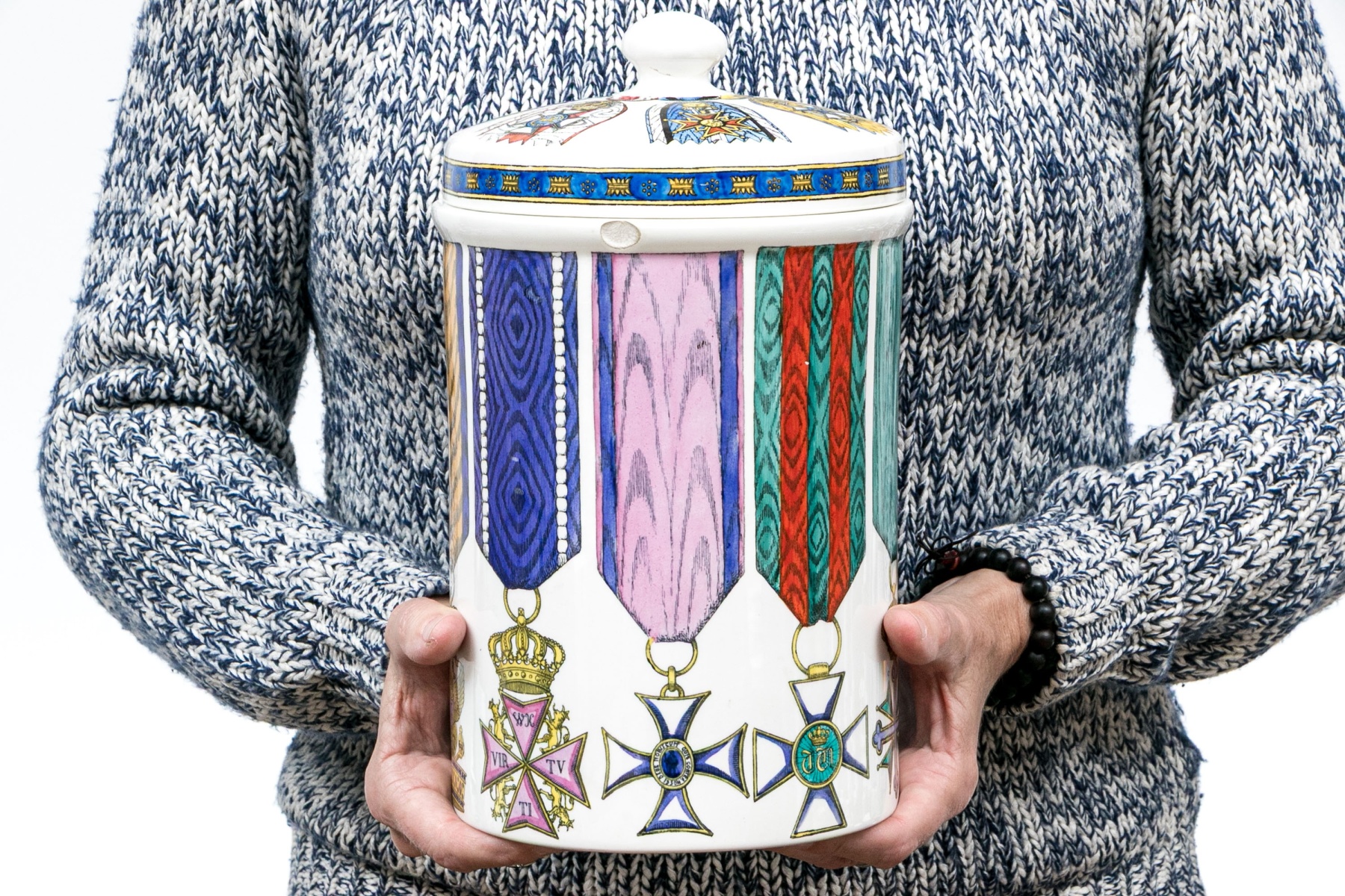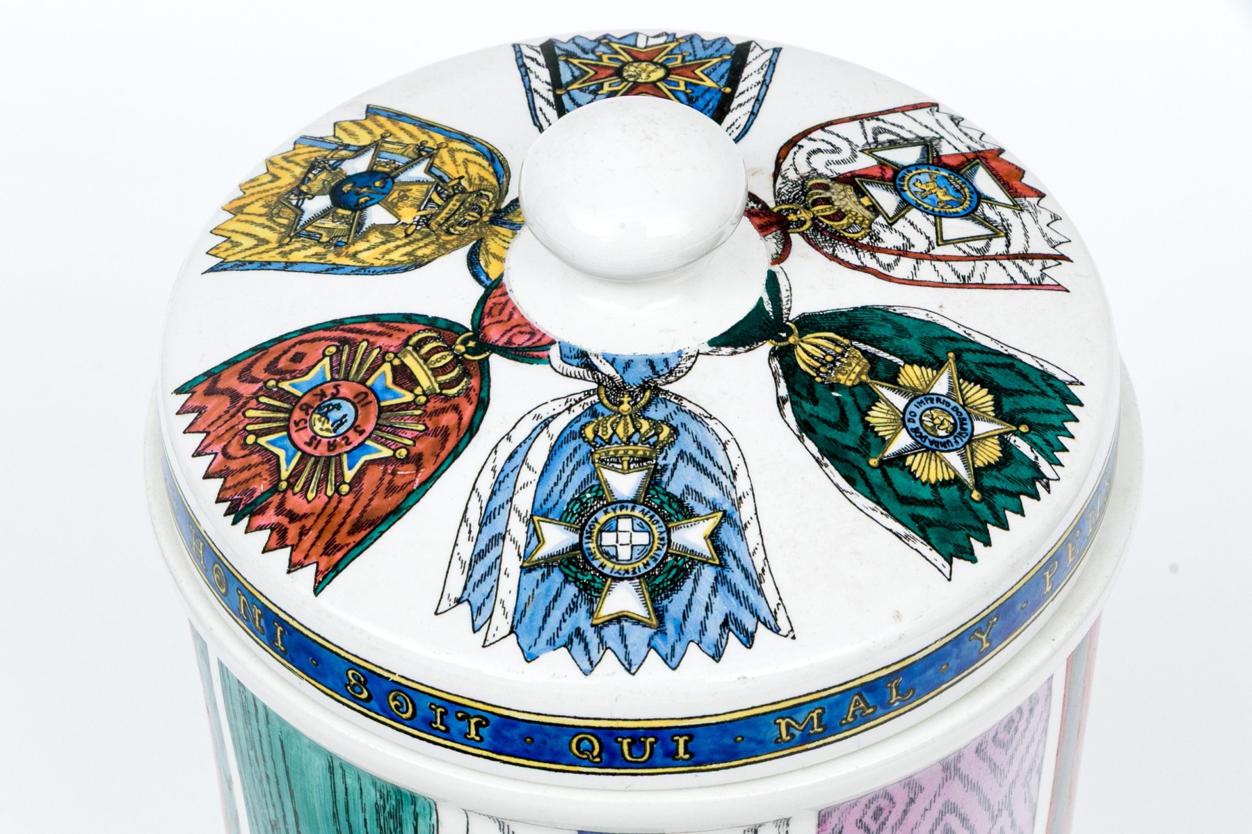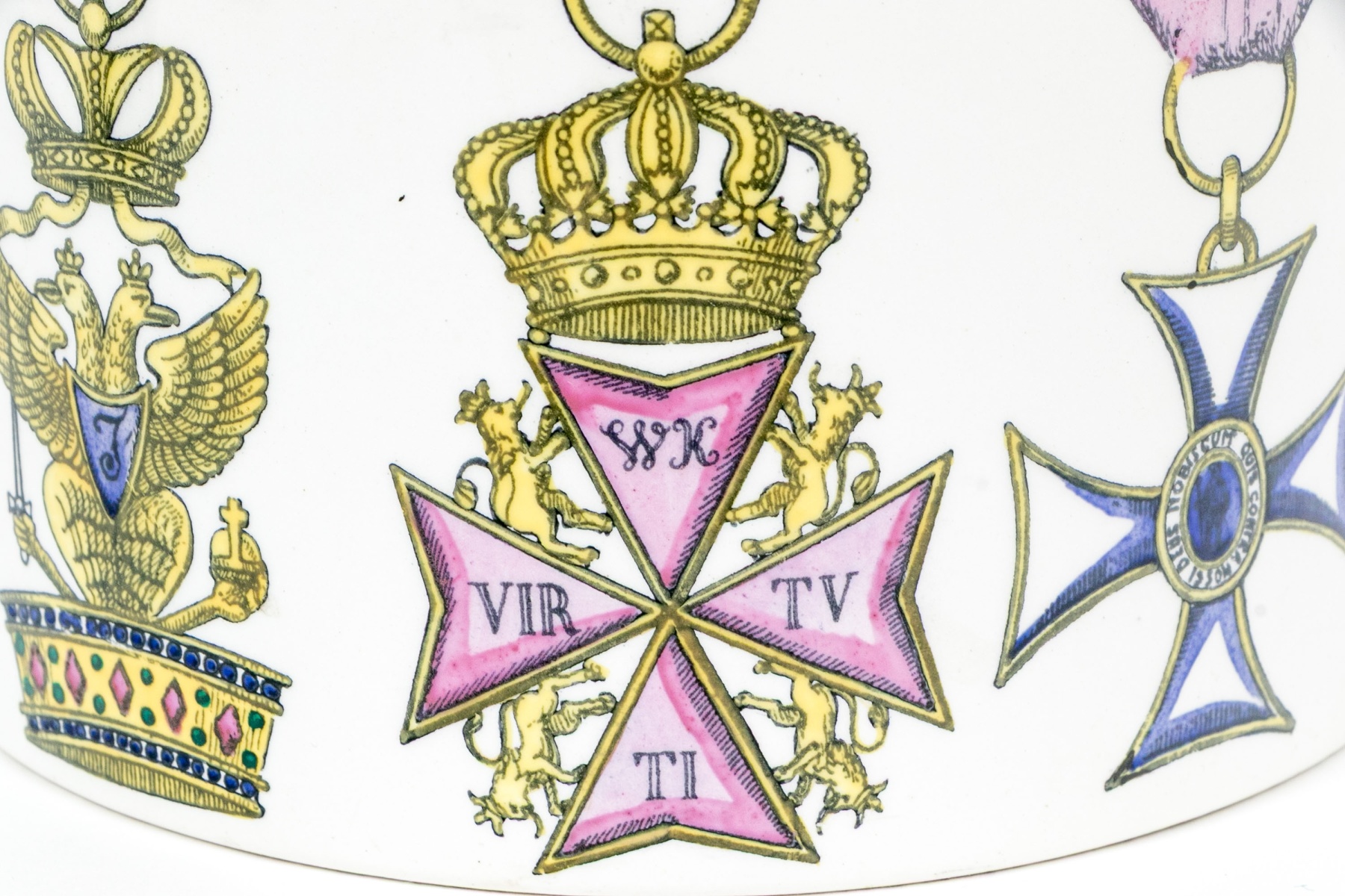Made in Italy. A large white lidded cannister with a printed design of various colored medals on ribbons.