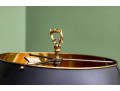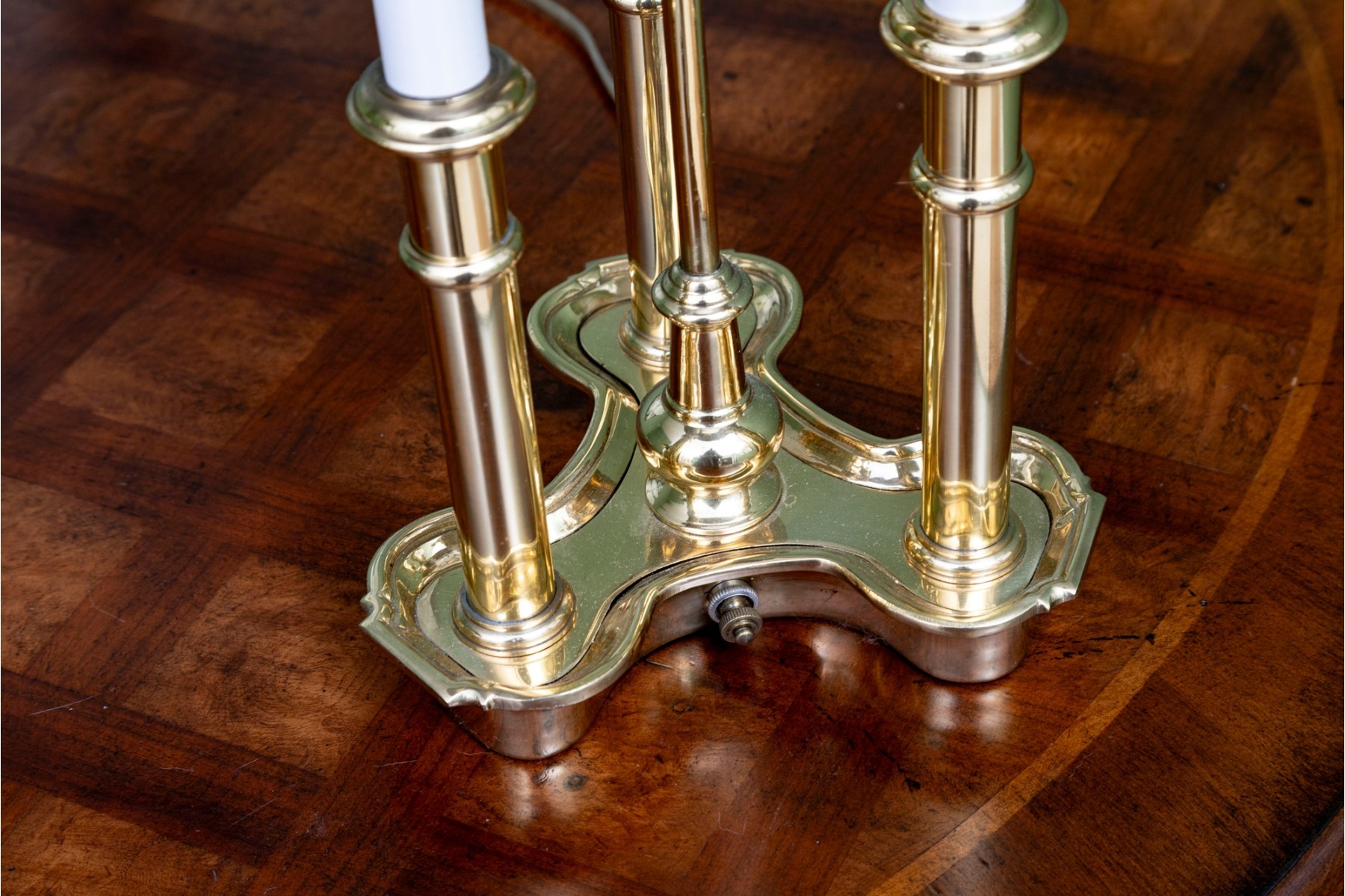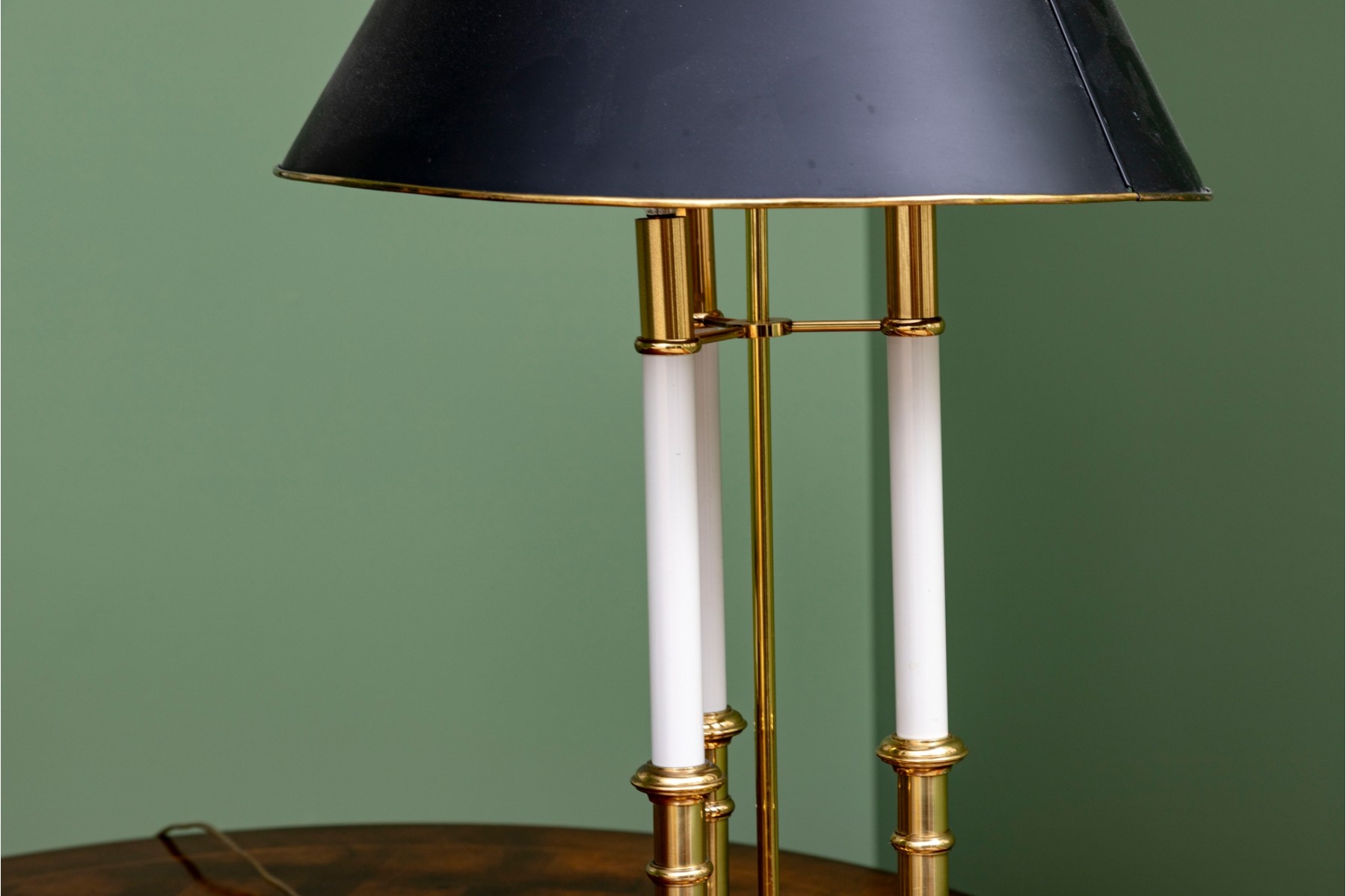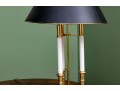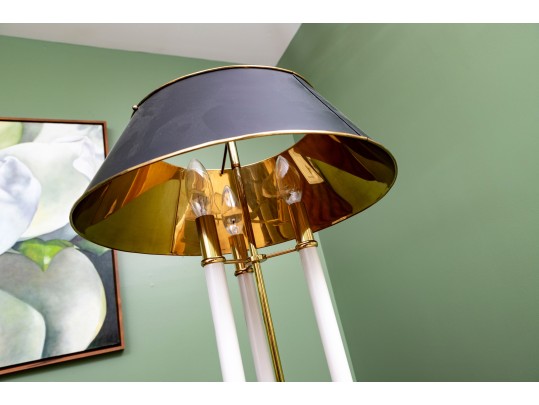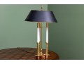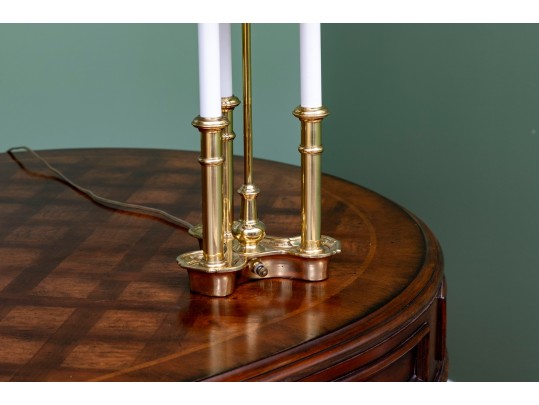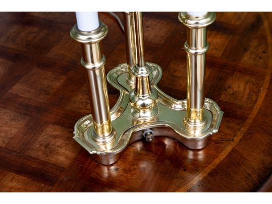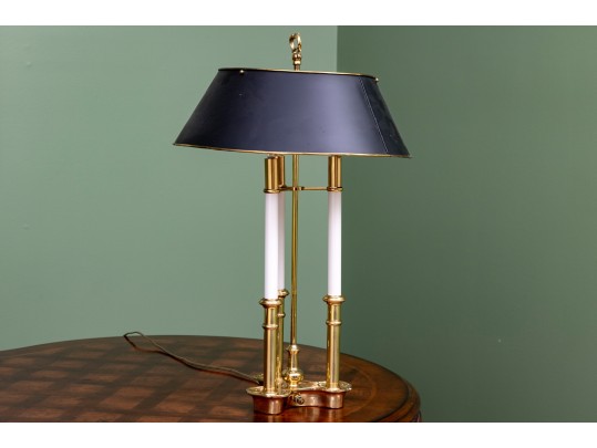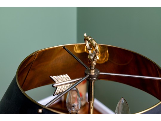 A classic French bouillotte-style table lamp featuring a brass frame connecting three candlestick style lights, and a black metal tole shade with gold trim. The lamp is topped with a decorative finial and includes an adjustable shade.