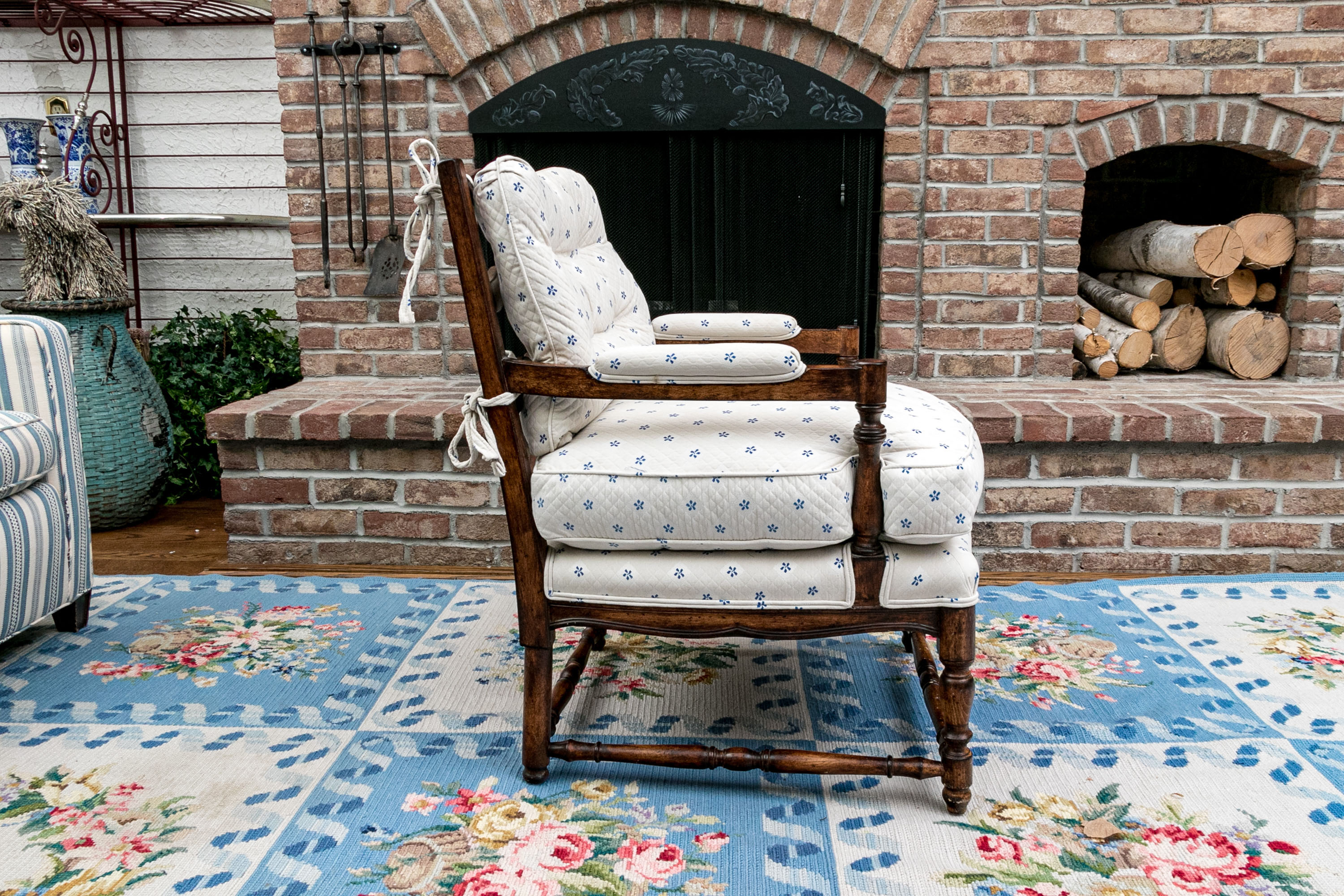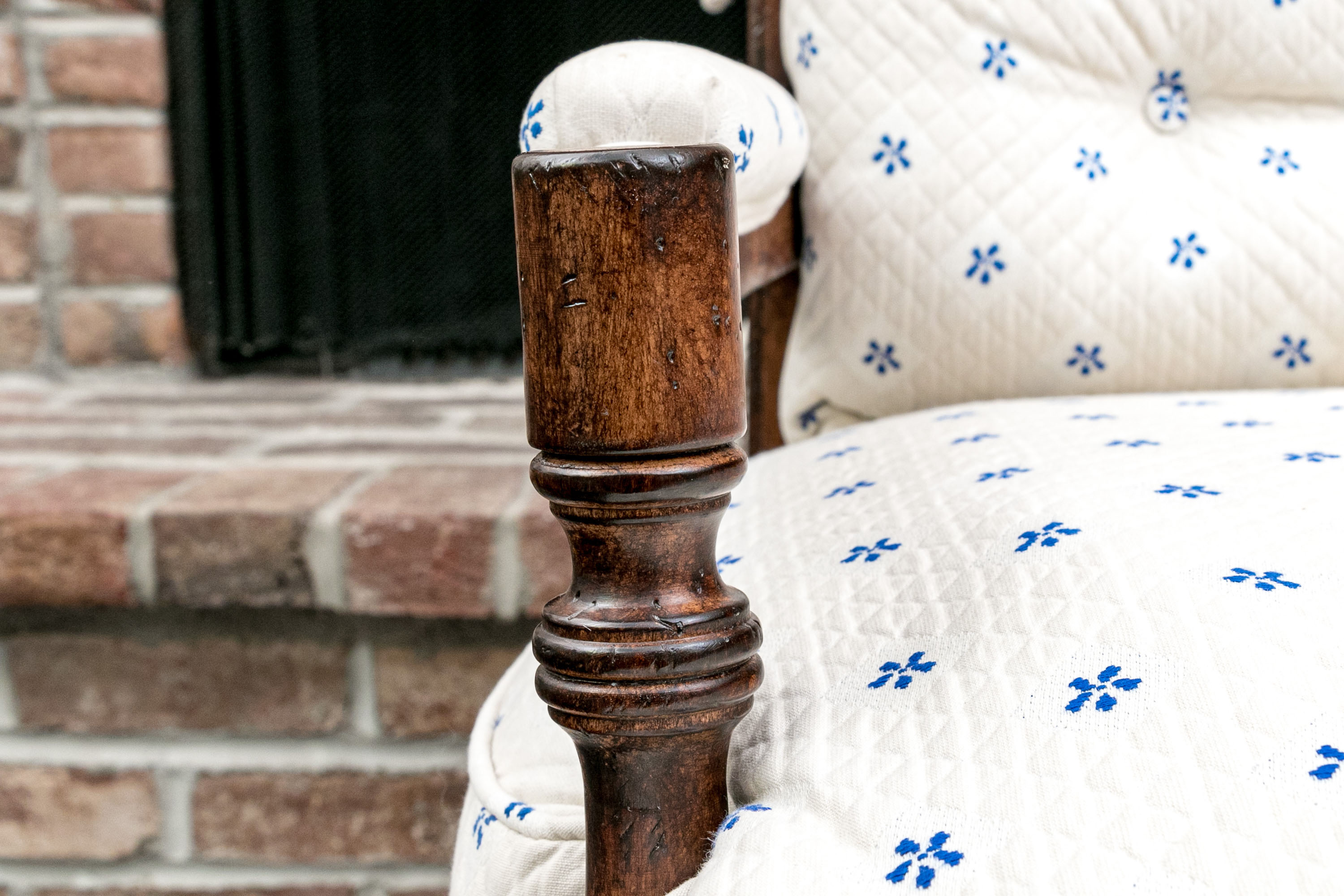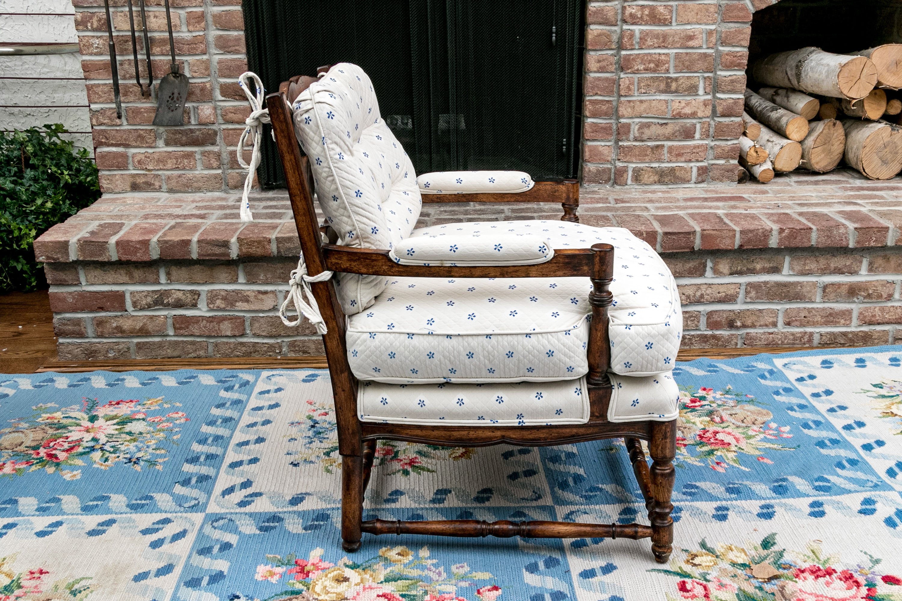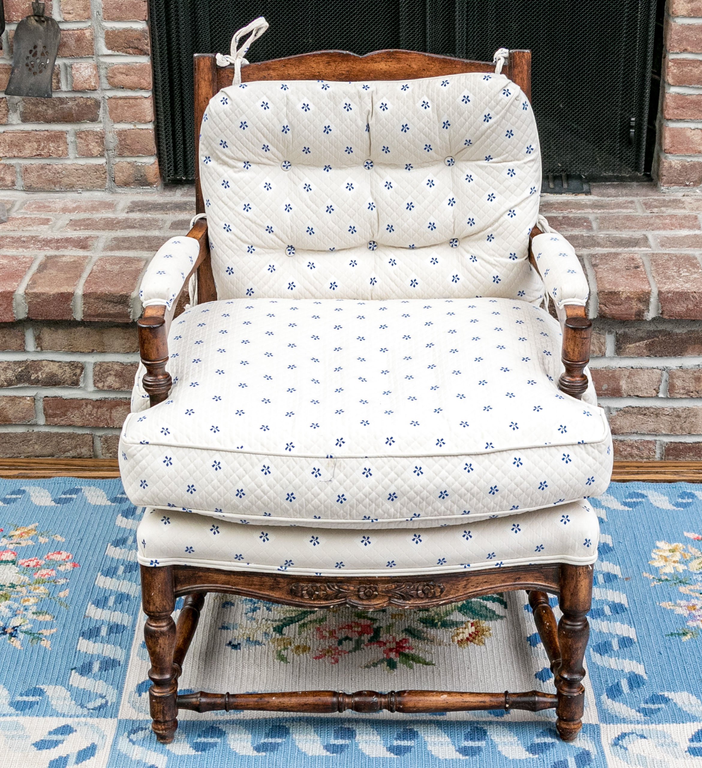 Upholstered seat and fitted seat cushion with piped trim. Upholstery to the arms and a loose tufted, upholstered seat back cushion tied to the frame for support. The whole is raised on well turned, baluster form legs with turned stretcher supports.