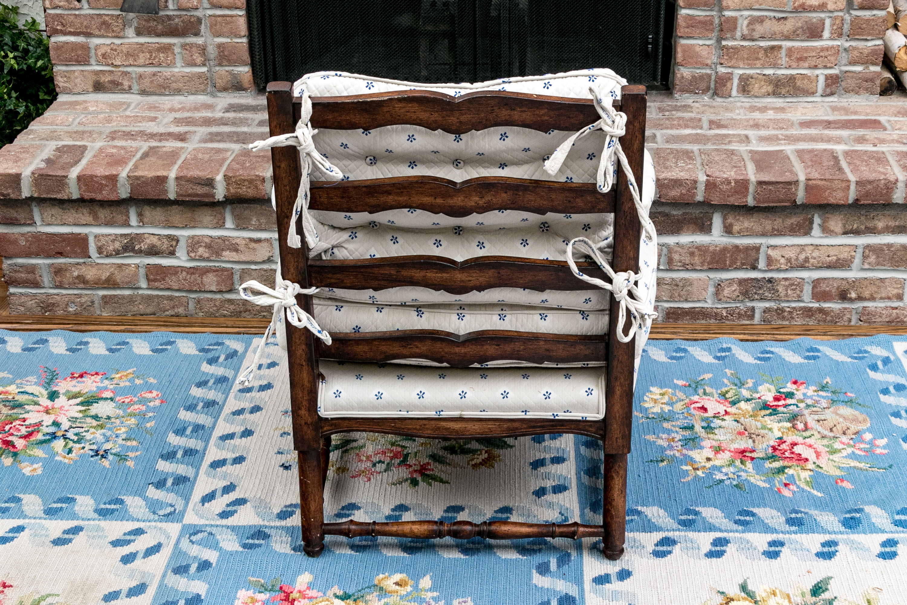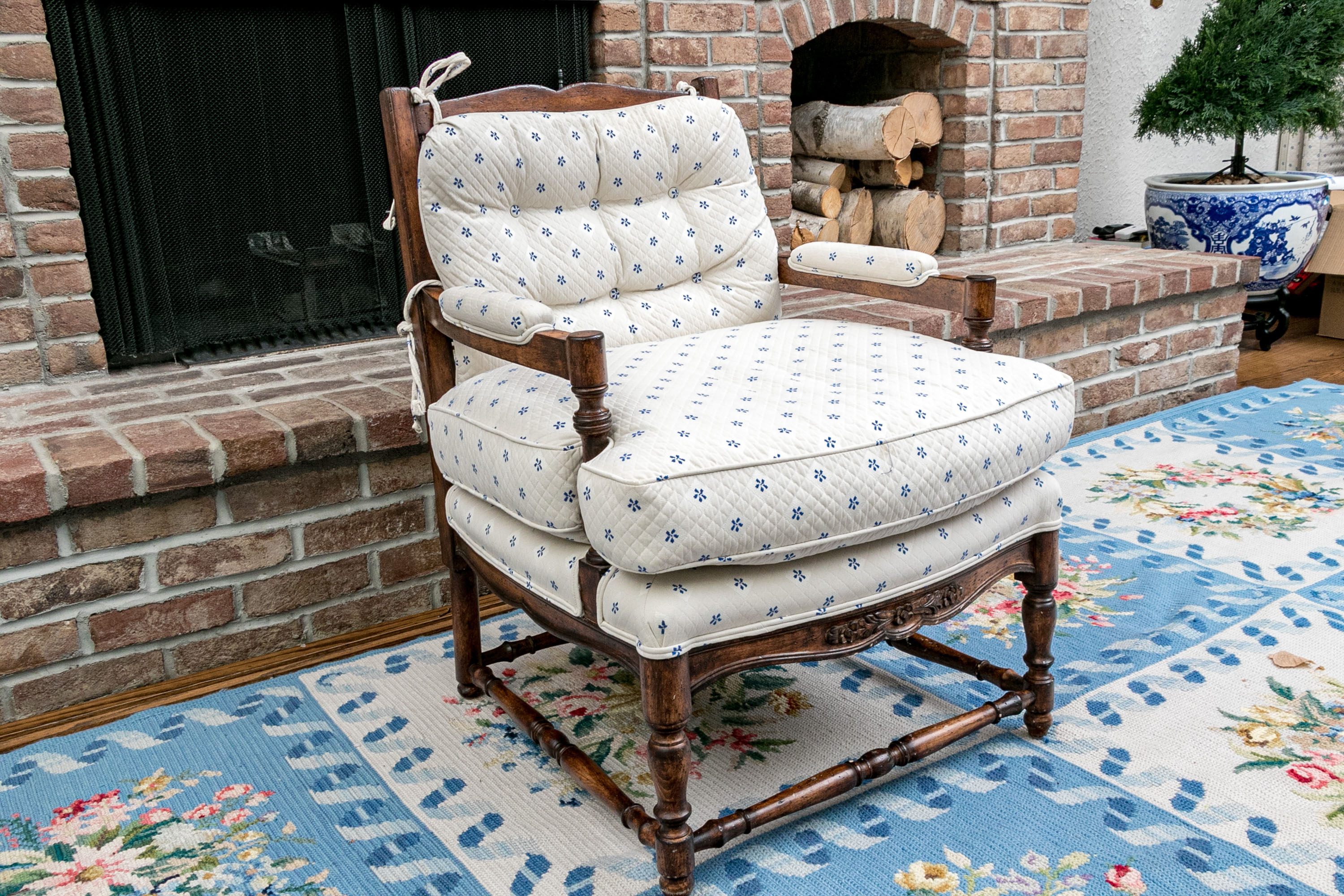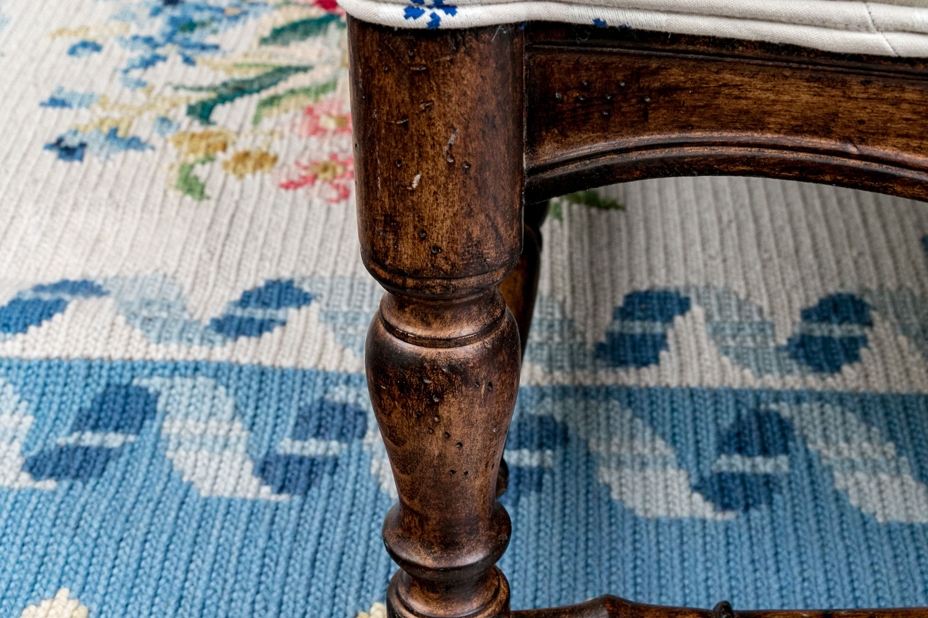 Upholstered seat and fitted seat cushion with piped trim. Upholstery to the arms and a loose tufted, upholstered seat back cushion tied to the frame for support. The whole is raised on well turned, baluster form legs with turned stretcher supports.