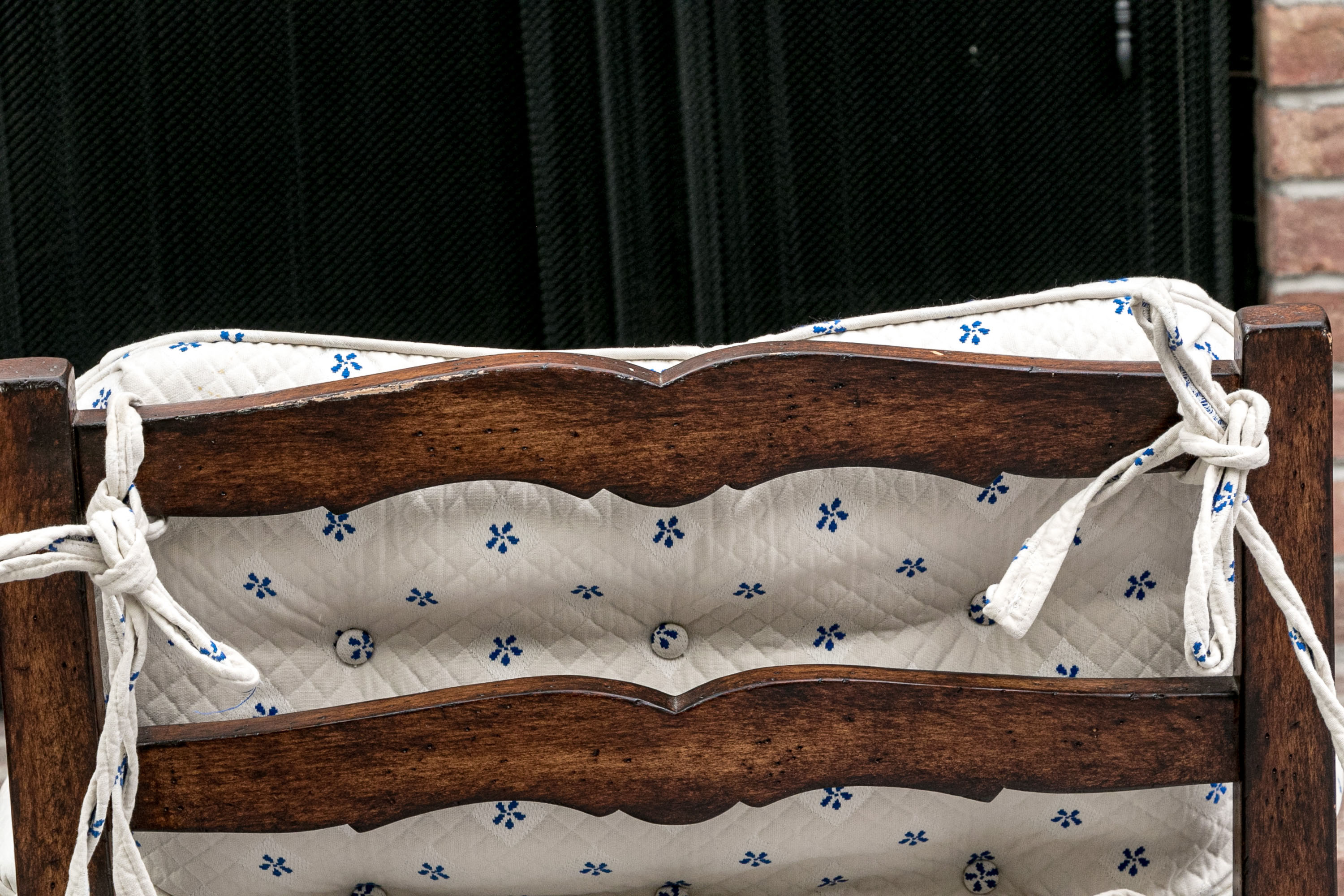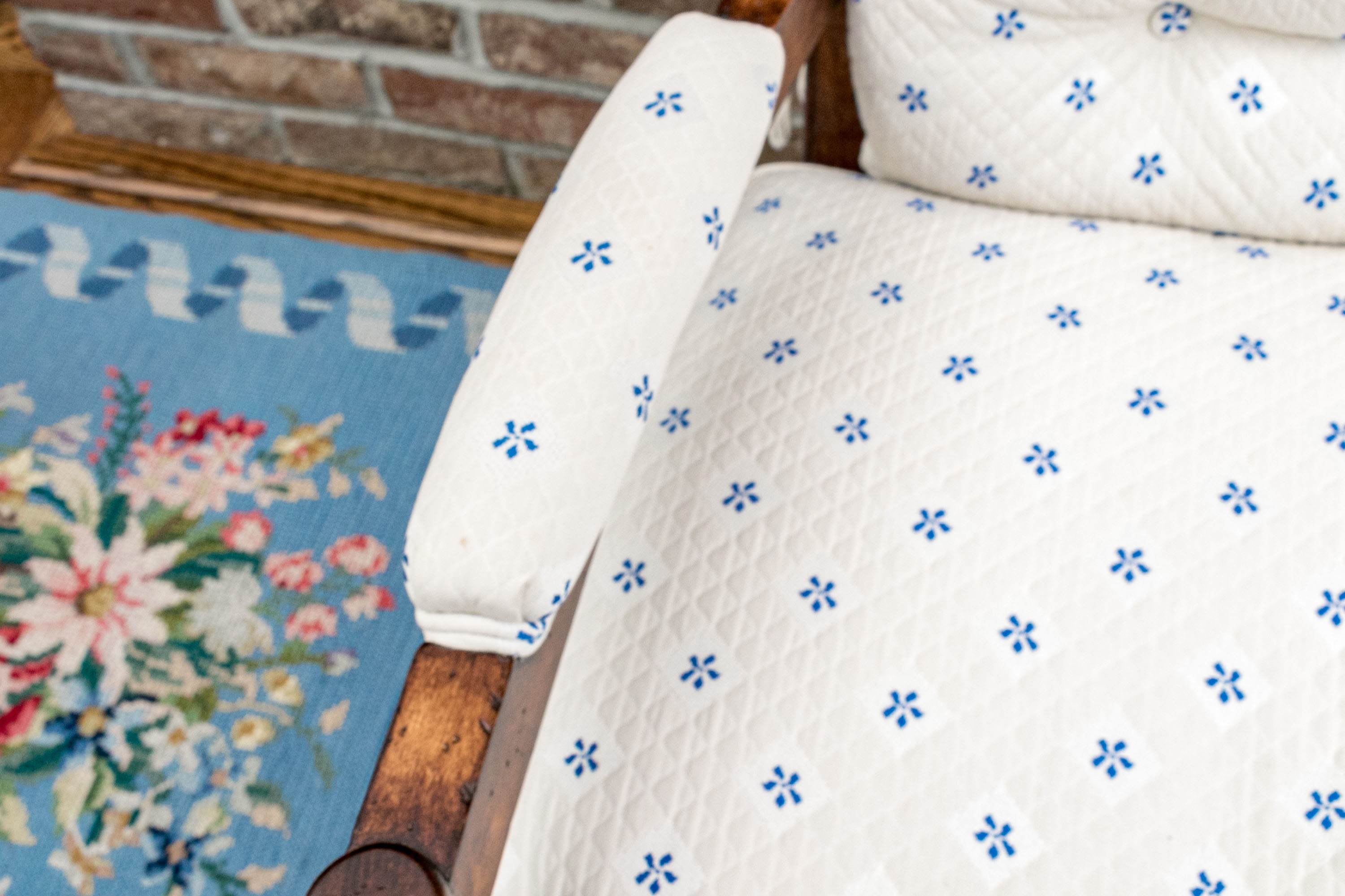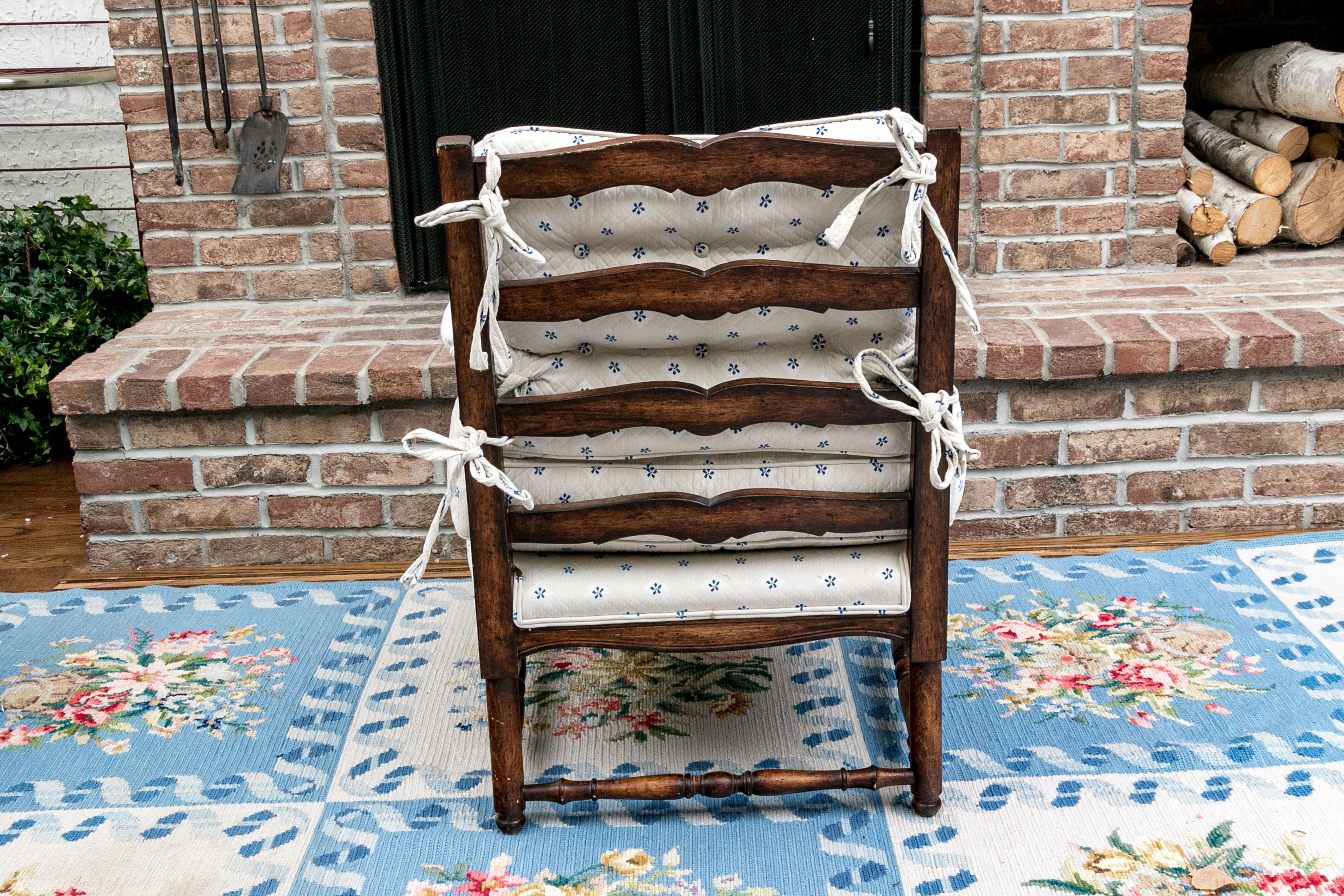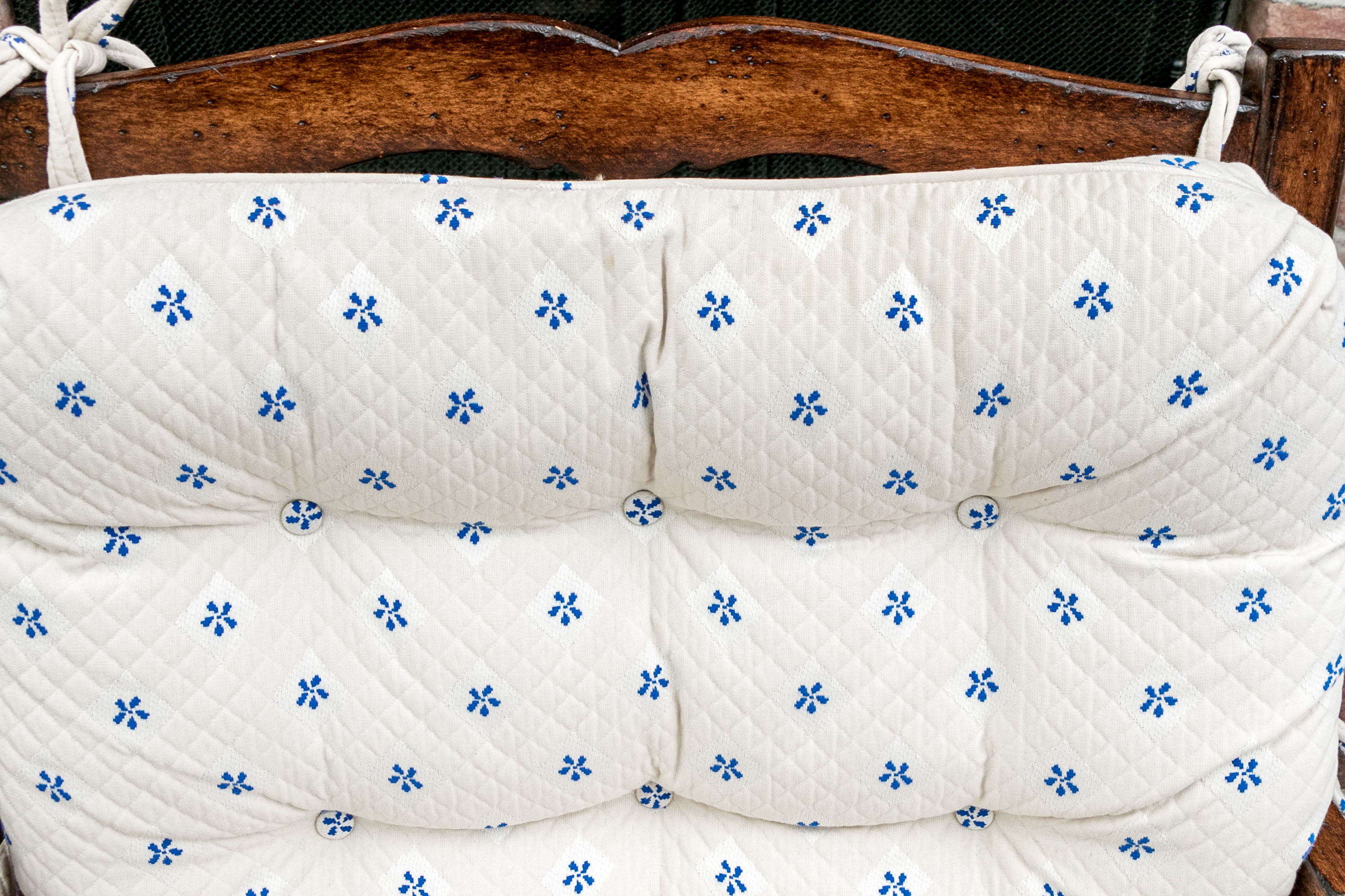Upholstered seat and fitted seat cushion with piped trim. Upholstery to the arms and a loose tufted, upholstered seat back cushion tied to the frame for support. The whole is raised on well turned, baluster form legs with turned stretcher supports.