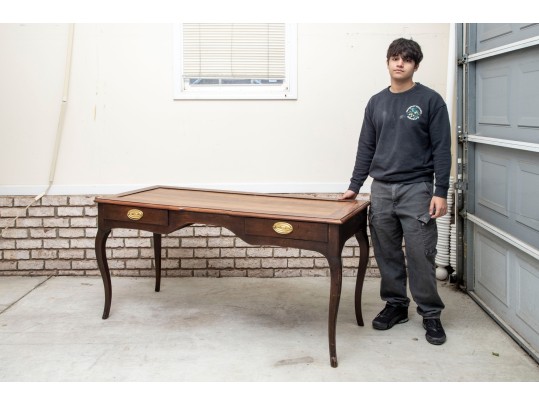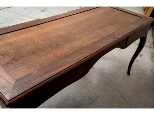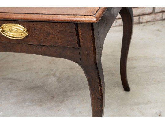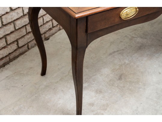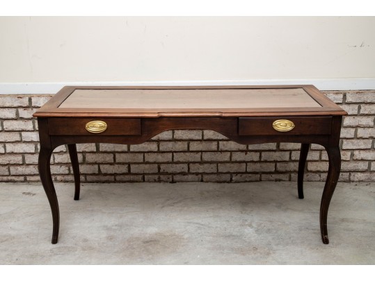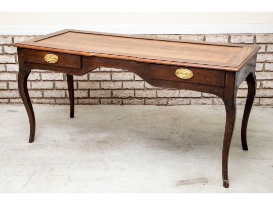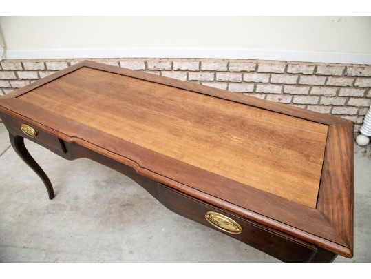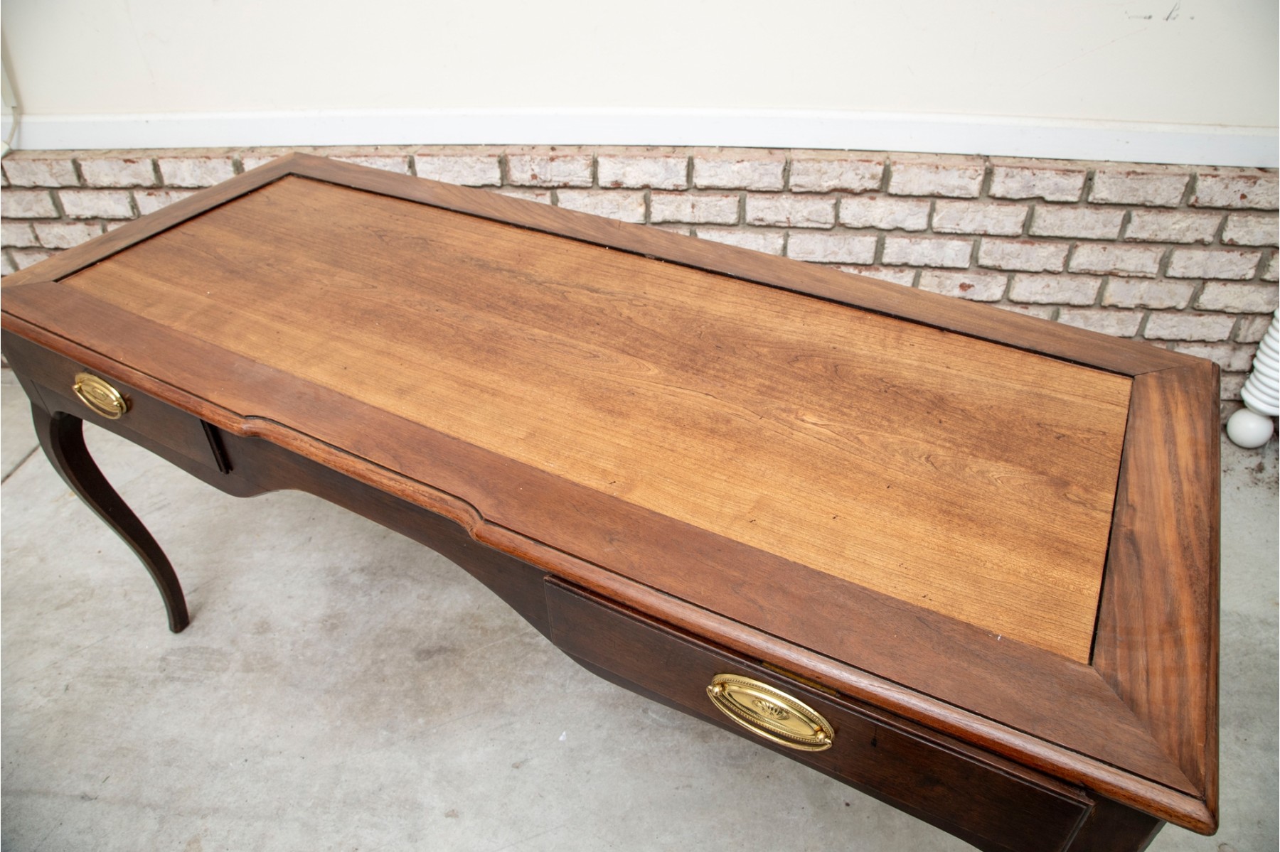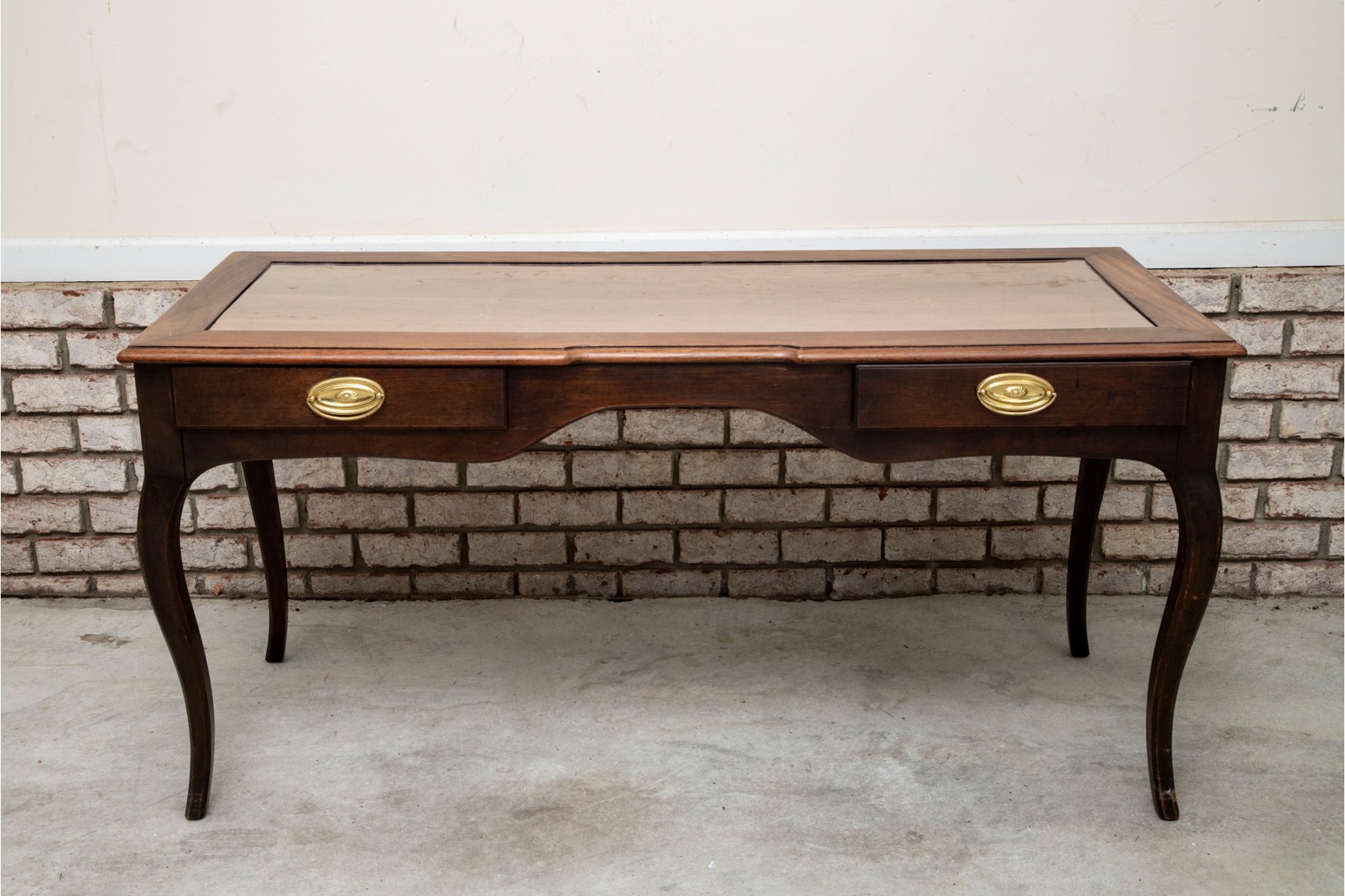 A stately French writing desk in the style of Louis XV, complete with traditional brass pull handles adorning divided drawers, subtle cabriole legs and a center space presumably for a glass, vinyl or leather insert.