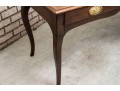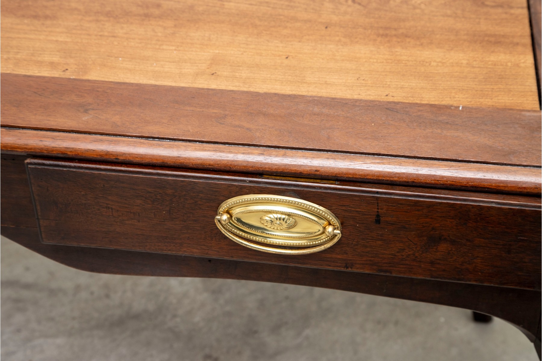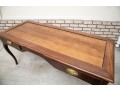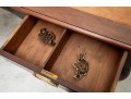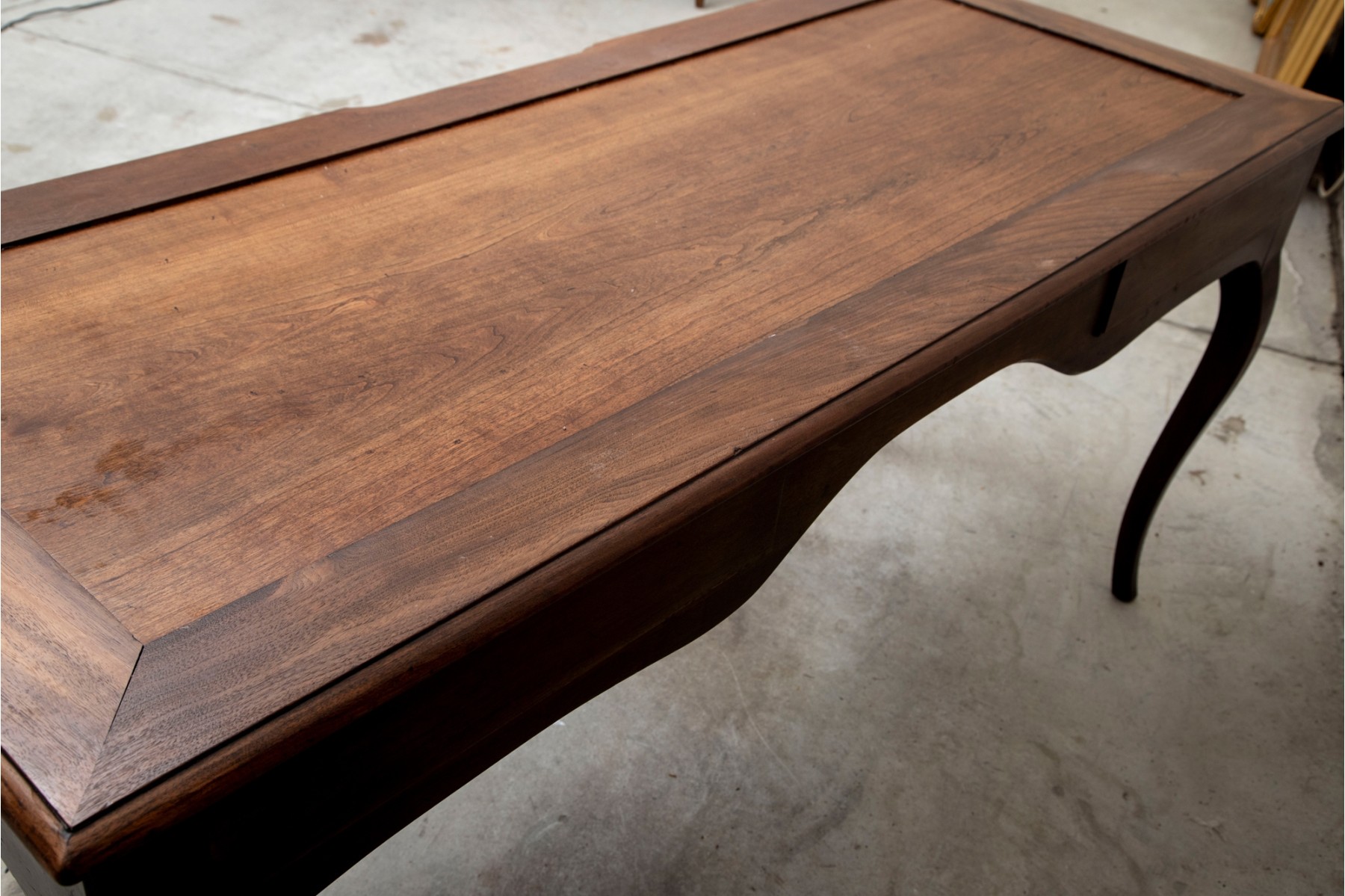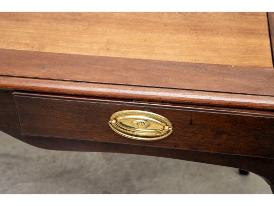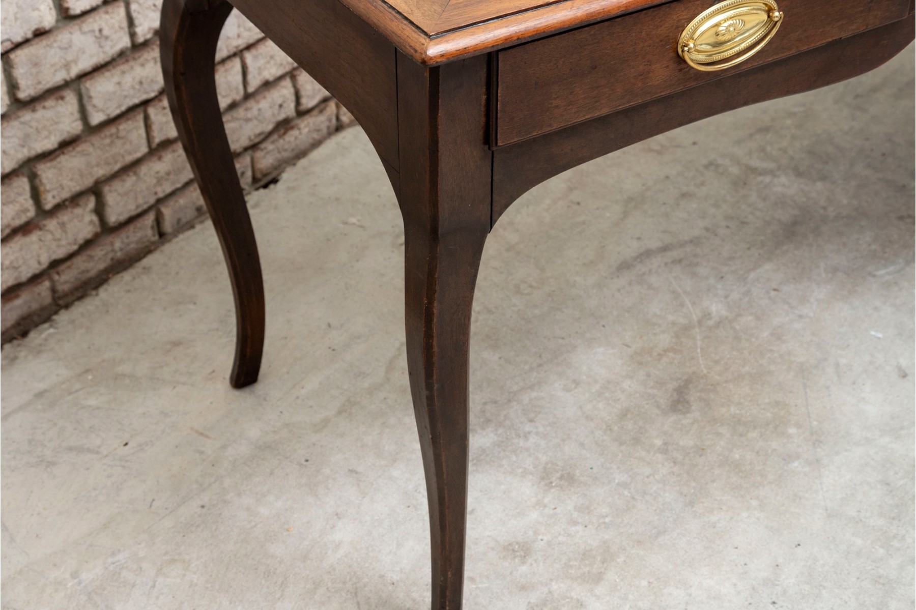 A stately French writing desk in the style of Louis XV, complete with traditional brass pull handles adorning divided drawers, subtle cabriole legs and a center space presumably for a glass, vinyl or leather insert.