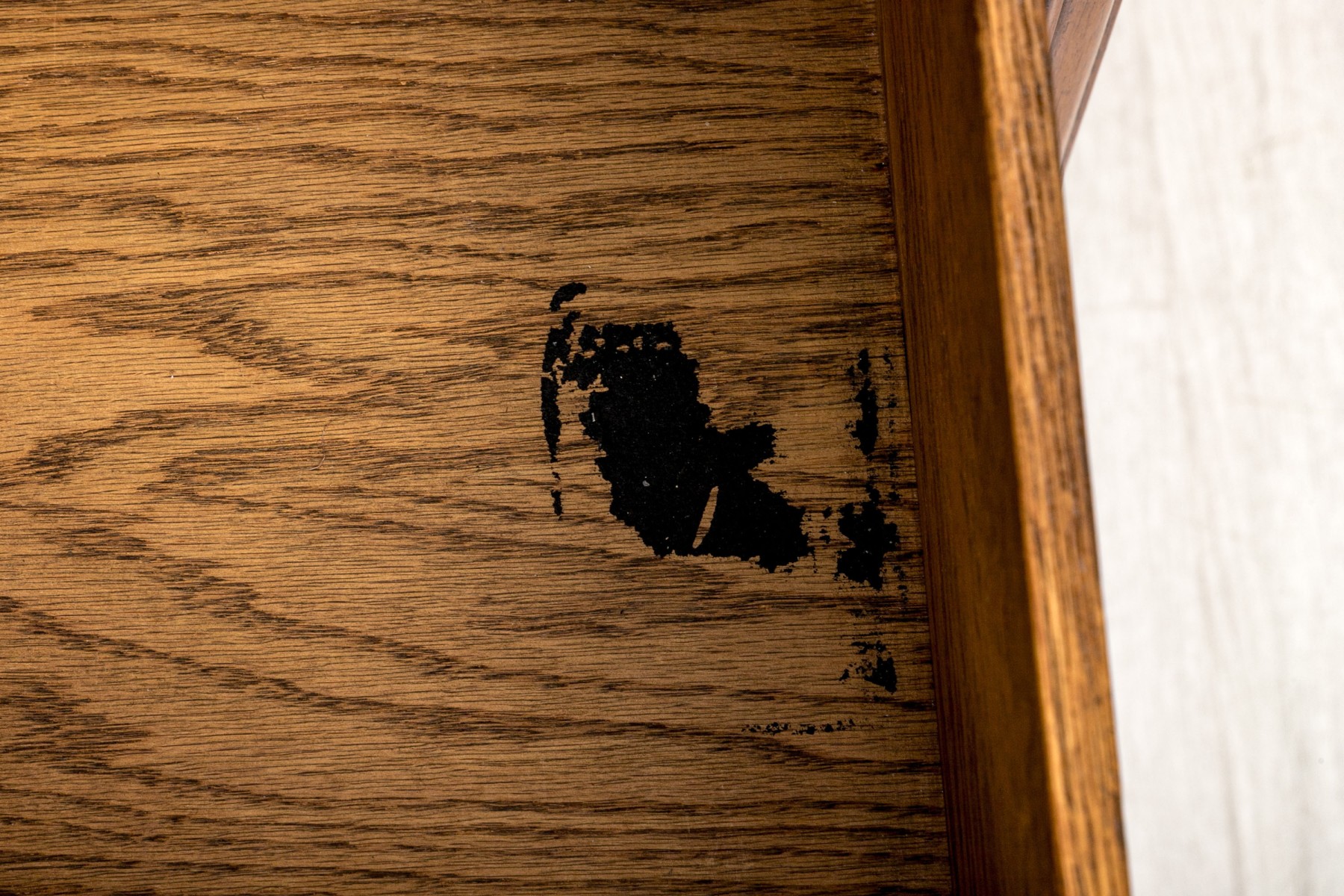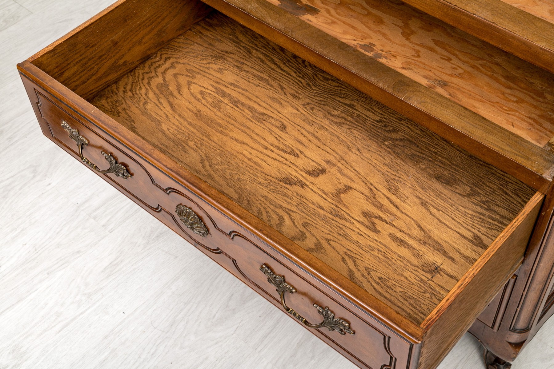 Condition: some chips to the top edges, scrapes along the left side support and some legs, stains in a drawer, Please review the photos as they are part of the condition report.