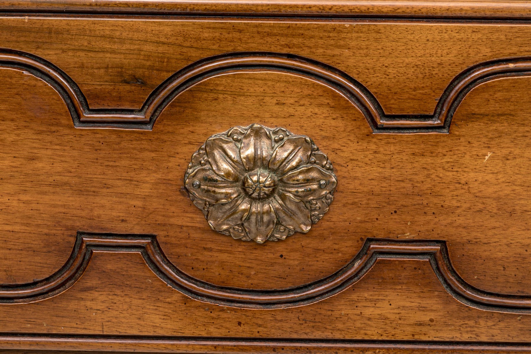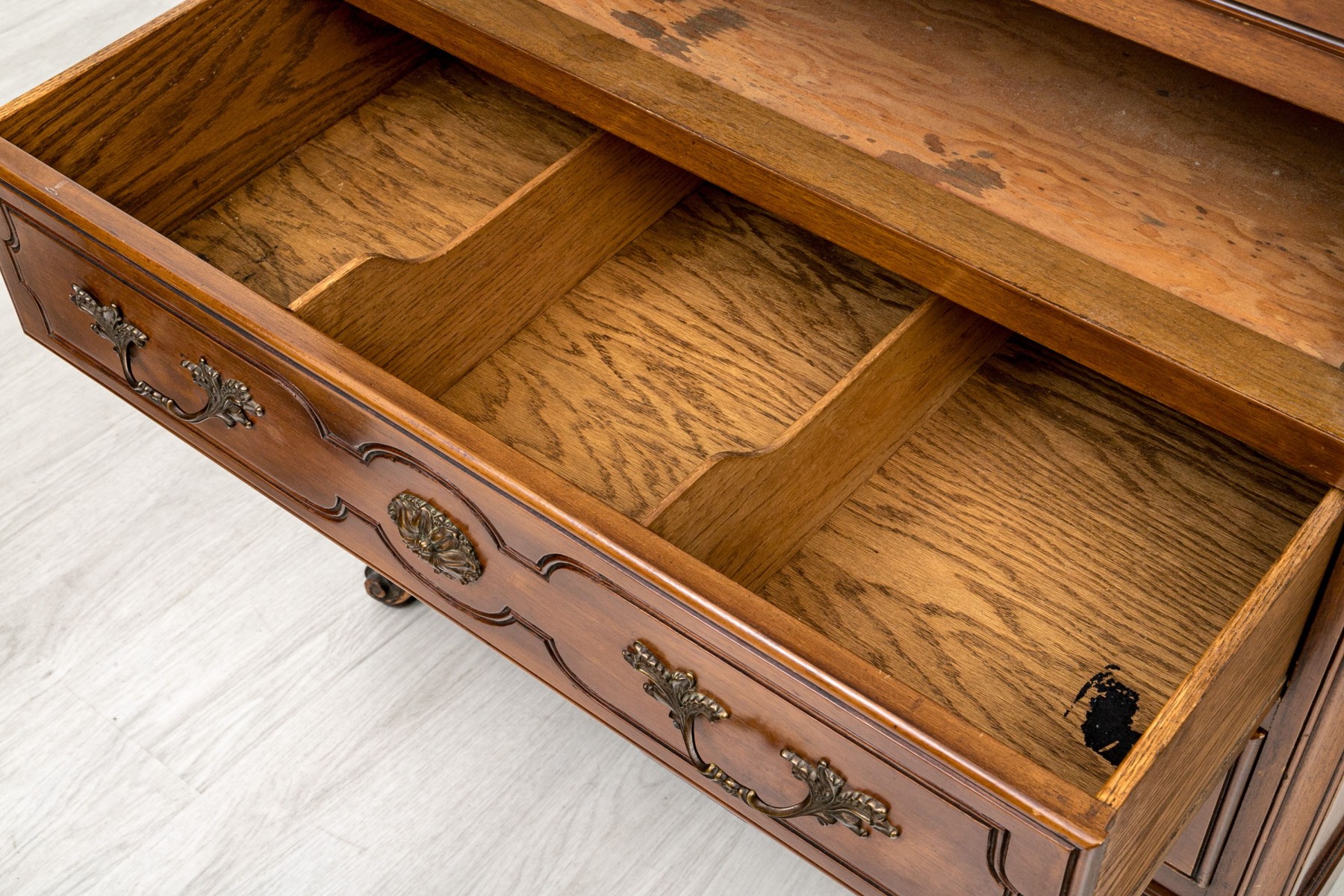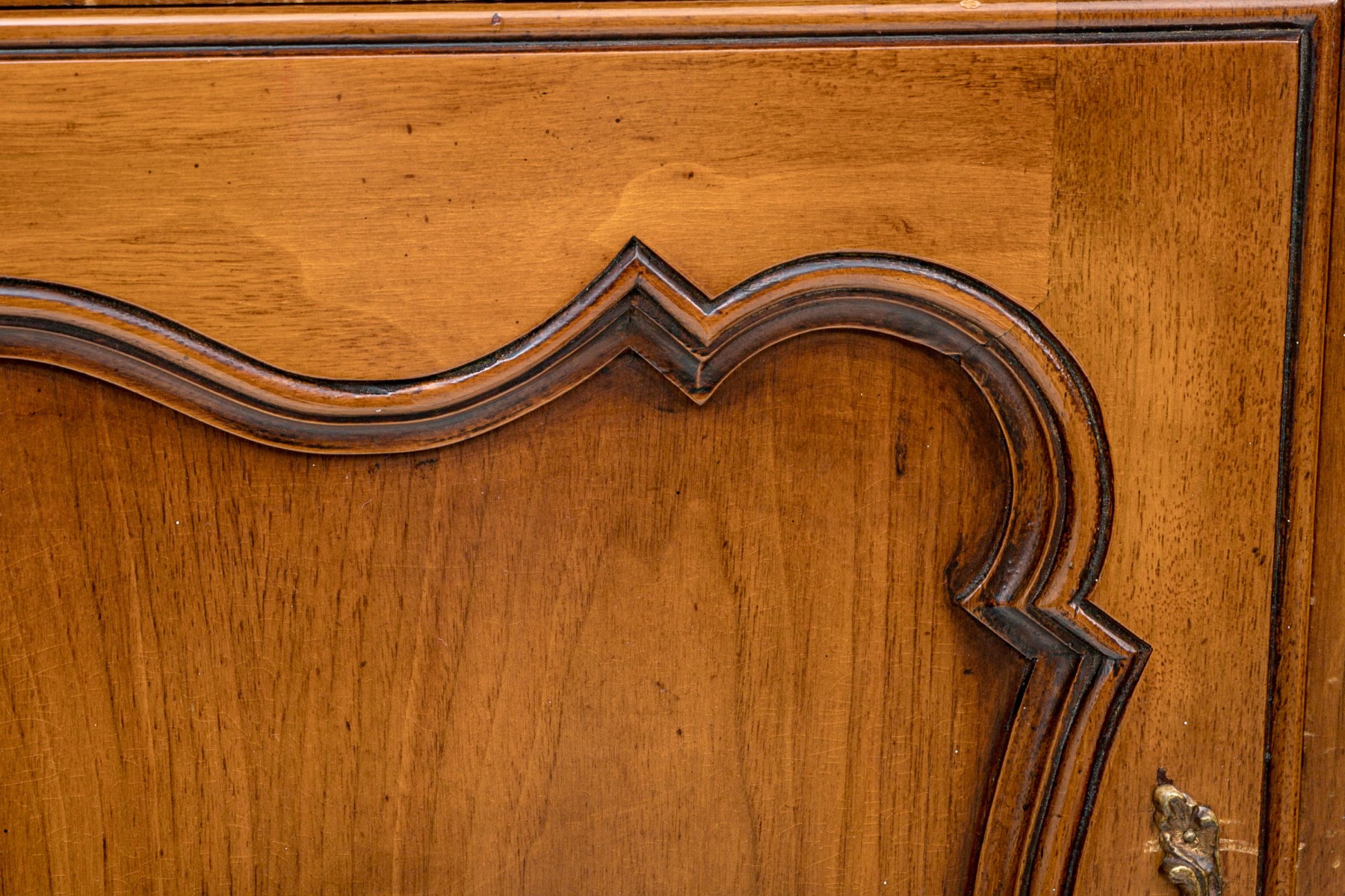 The French country style shaped dresser in fruitwood. The top carved double doors open to six drawers over the four lower long drawers, all with brass pulls and mounts. With a shaped skirt rail and raised on short cabriole legs.