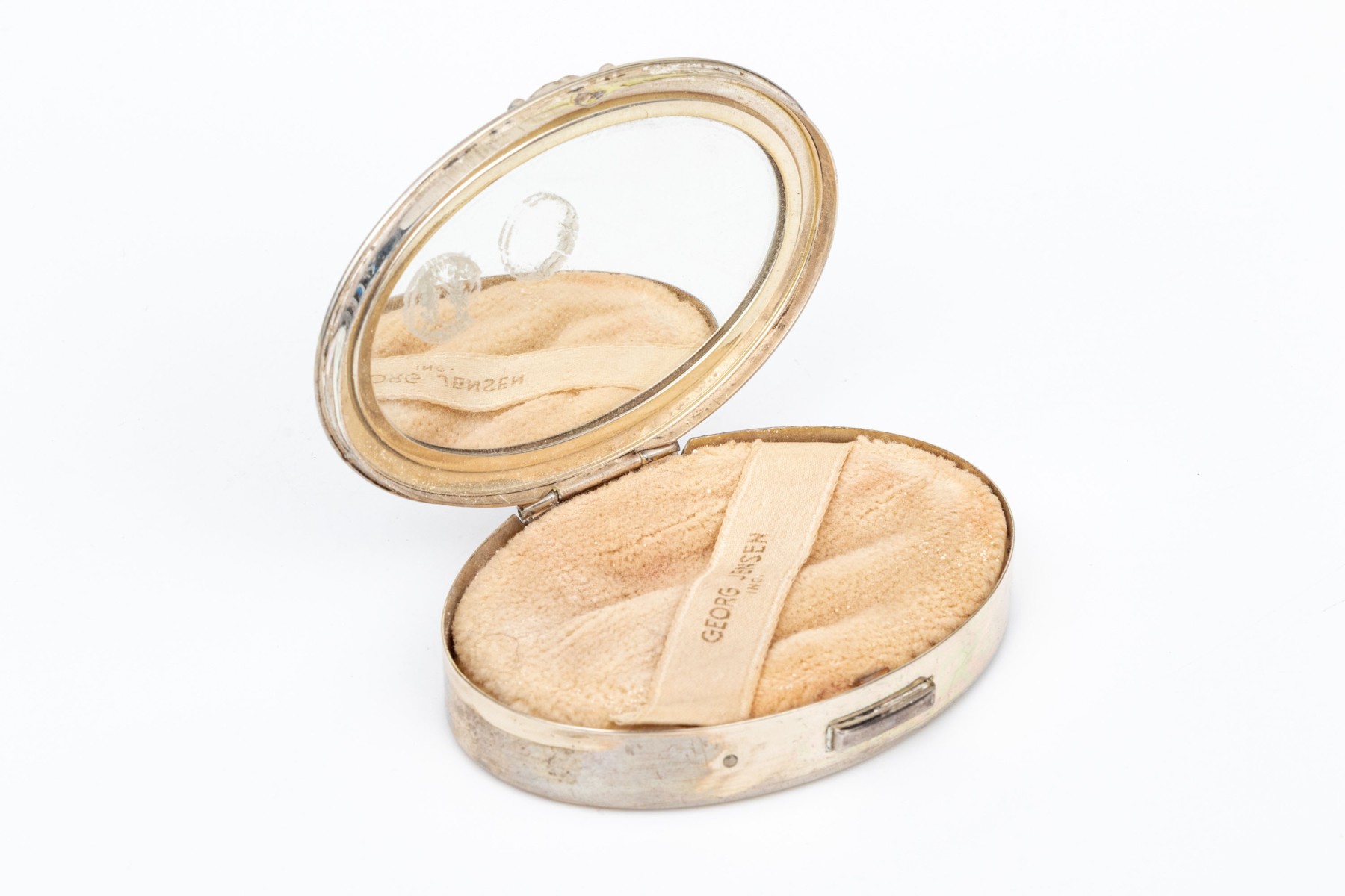 An oval compact with a monogrammed lid and a raised scrolled acorn motif on the lid clasp. The body with a push button opener. The inside with a powder mesh sieve and a powder puff.
