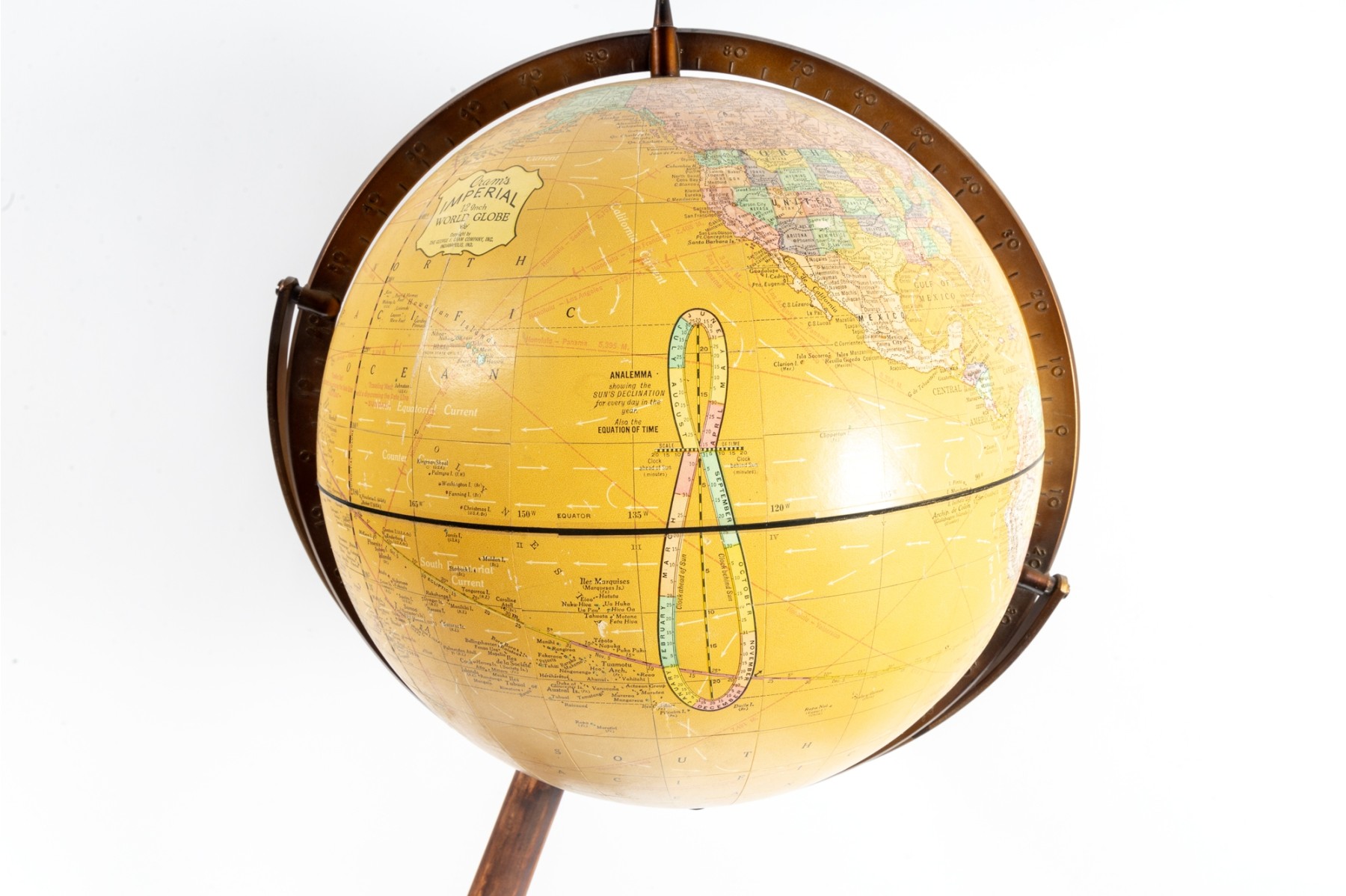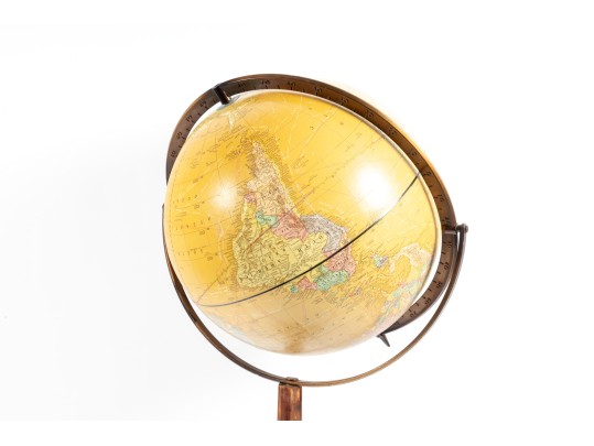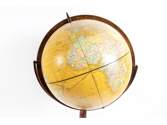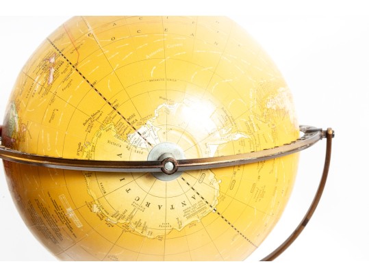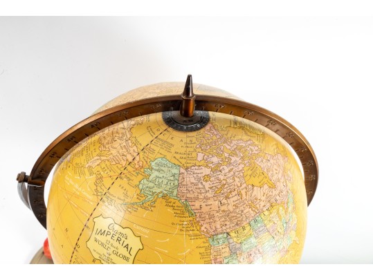 Cram's Imperial 12" world globe, mounted on a wooden base with a sleek brass-toned meridian. The globe features a vintage-style color palette, with countries outlined and labeled in fine detail. Physical and political geography is displayed, including mountain ranges, oceans, and major cities. A classic mid-20th-century design.