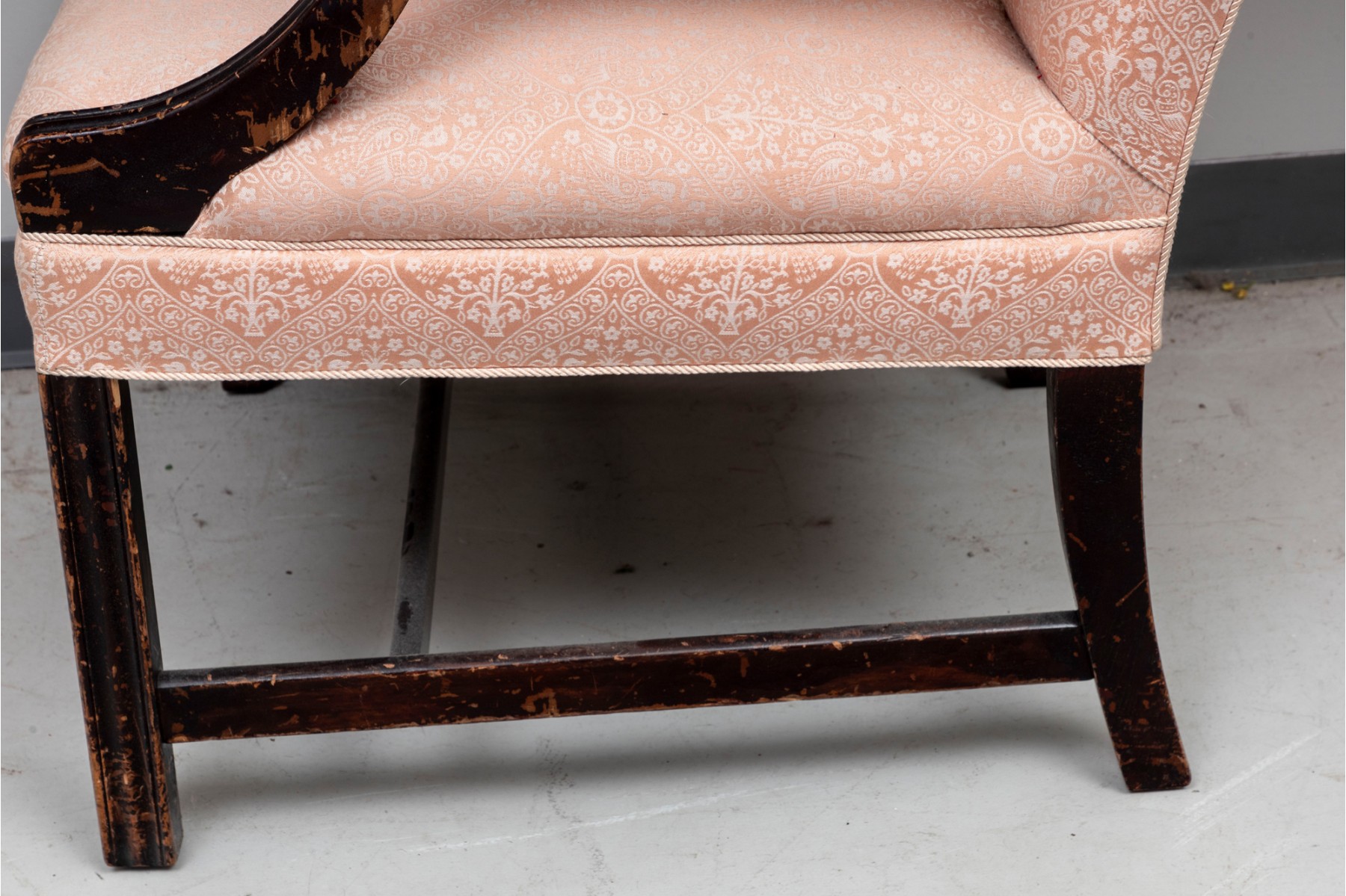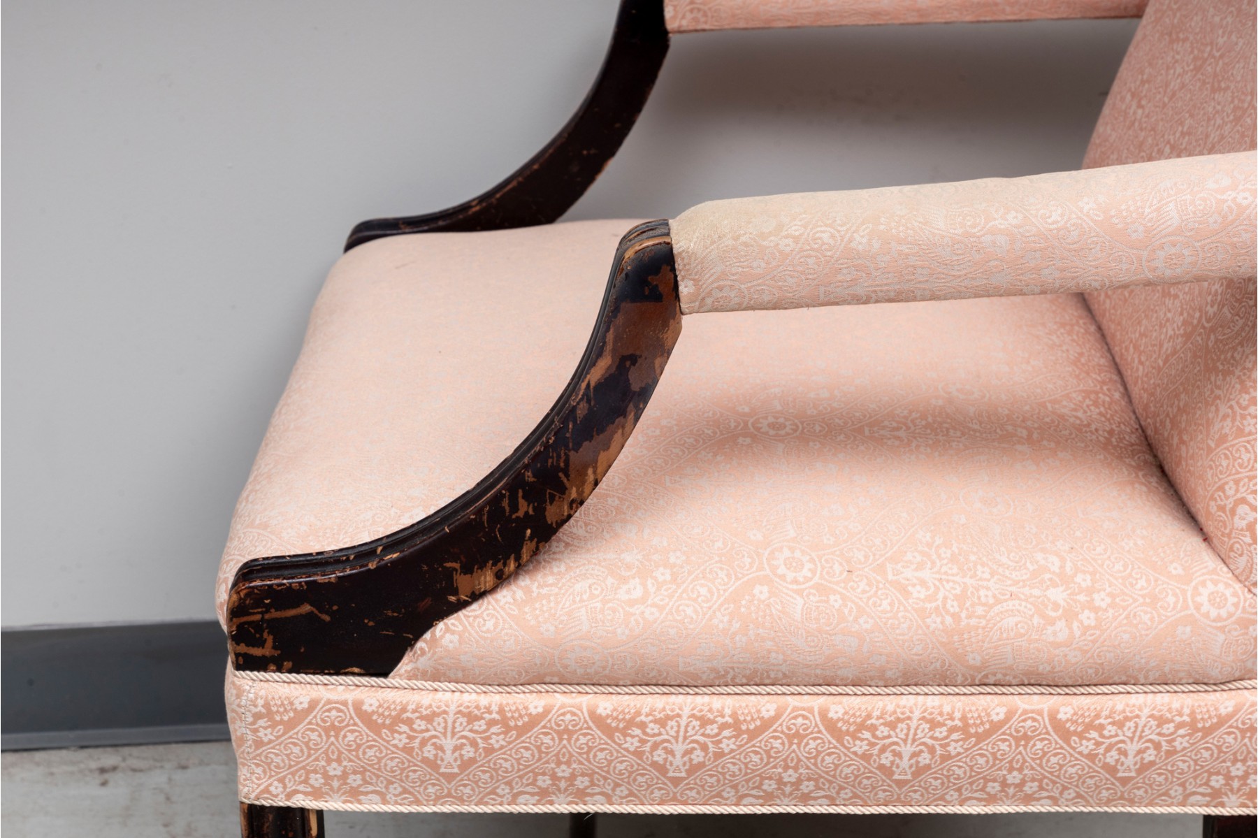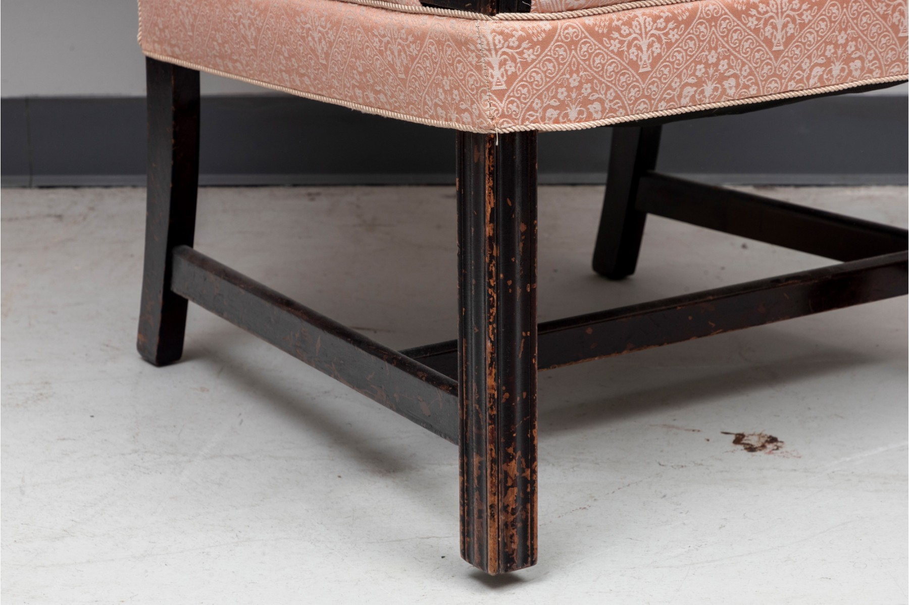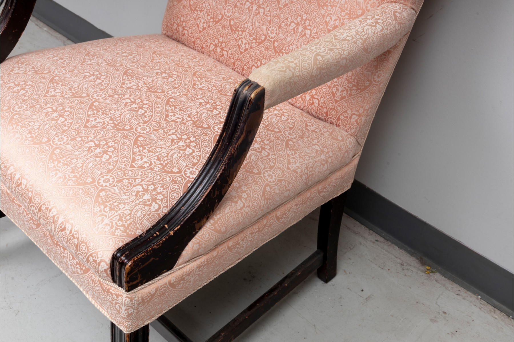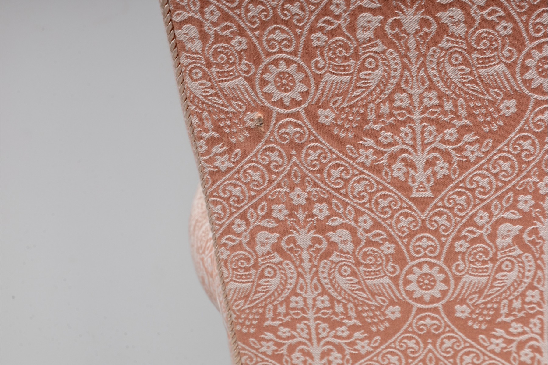 An antique Martha Washington frame chair upholstered in pink satin damask fabric extending to the arms, and supported on an H-frame stretchers.