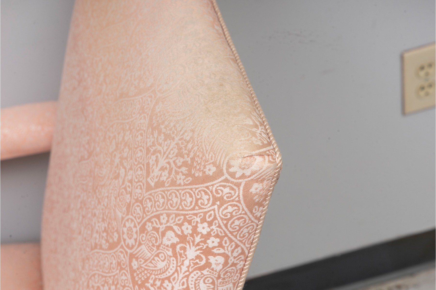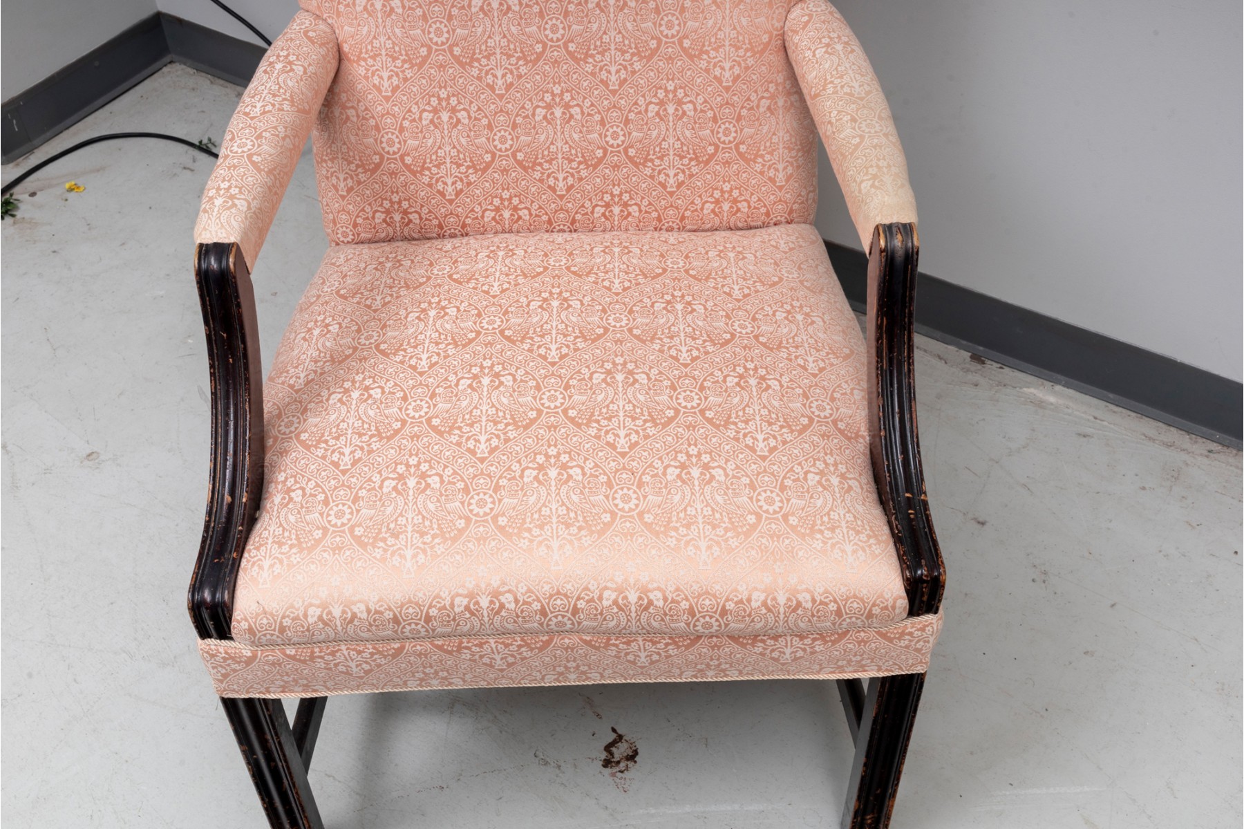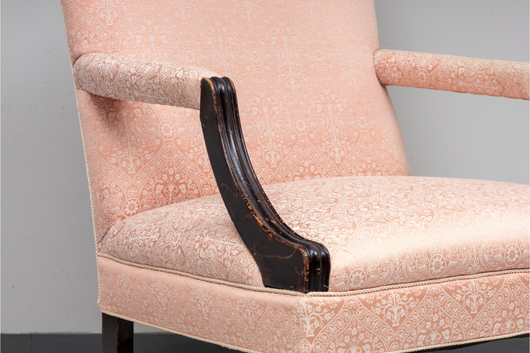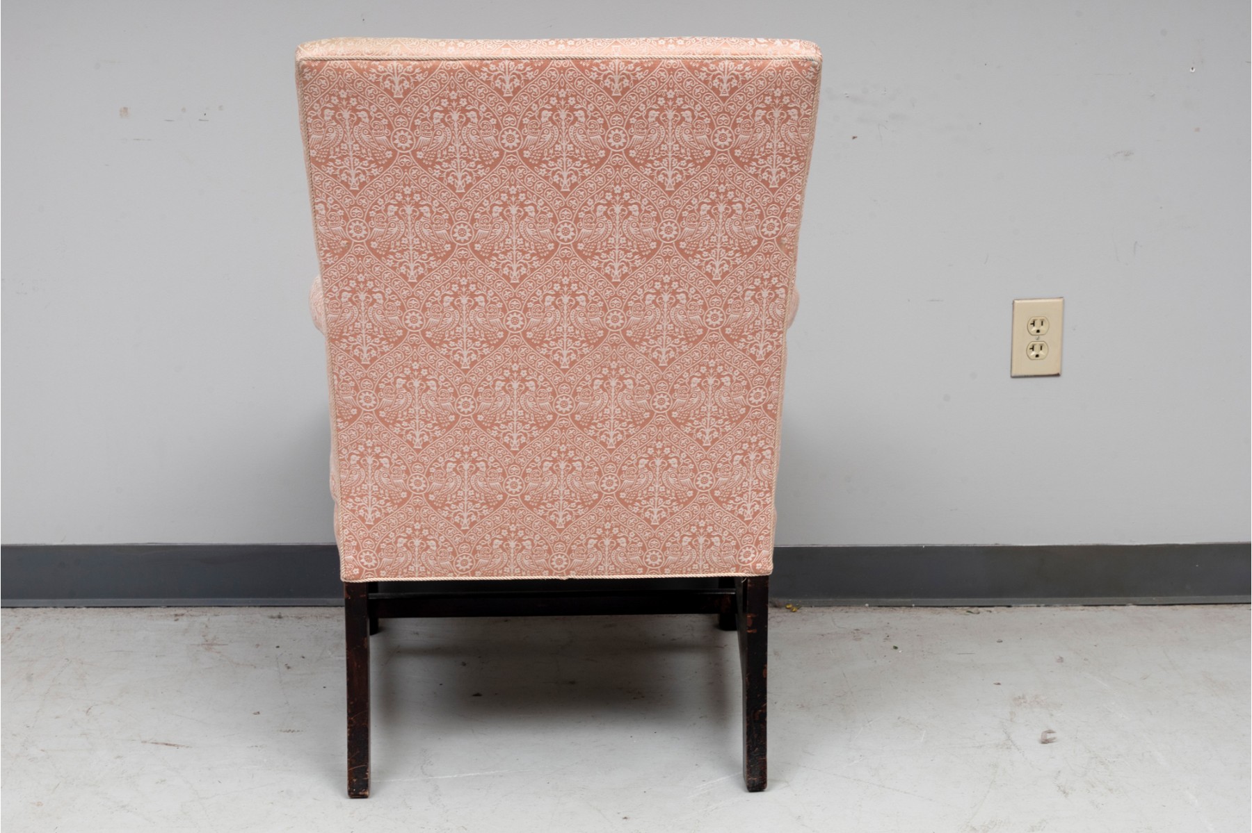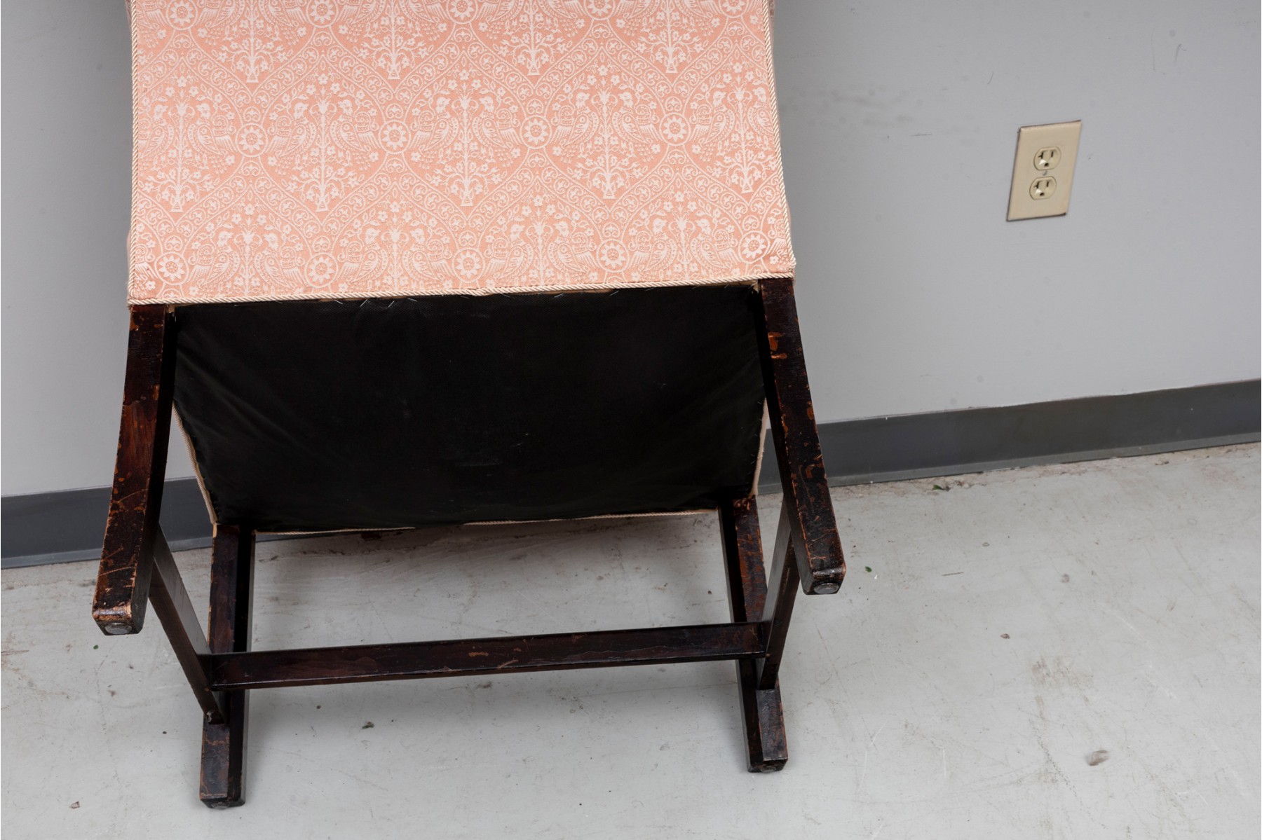An antique Martha Washington frame chair upholstered in pink satin damask fabric extending to the arms, and supported on an H-frame stretchers.