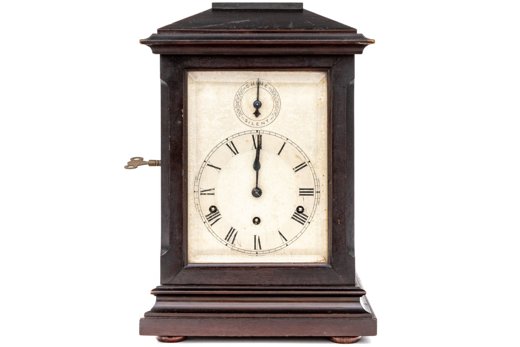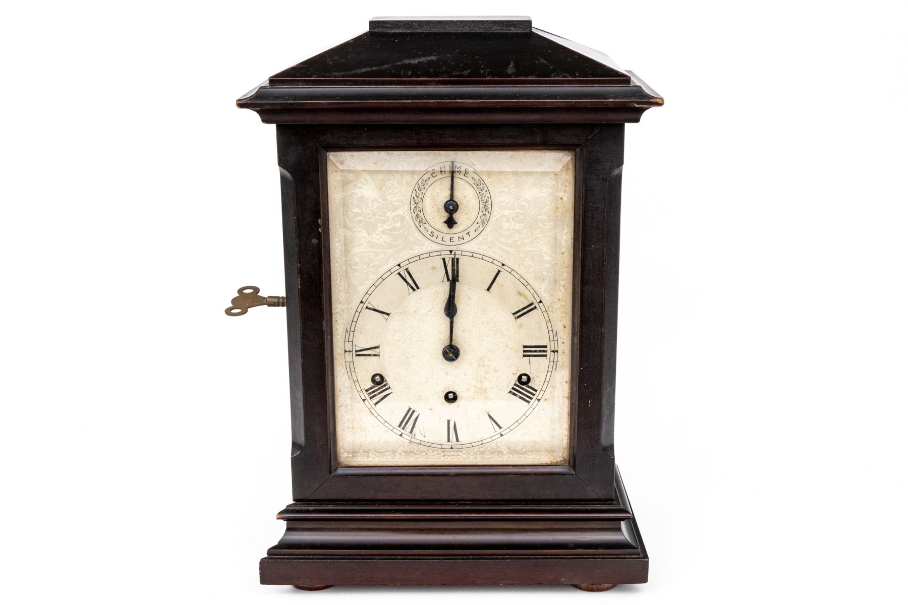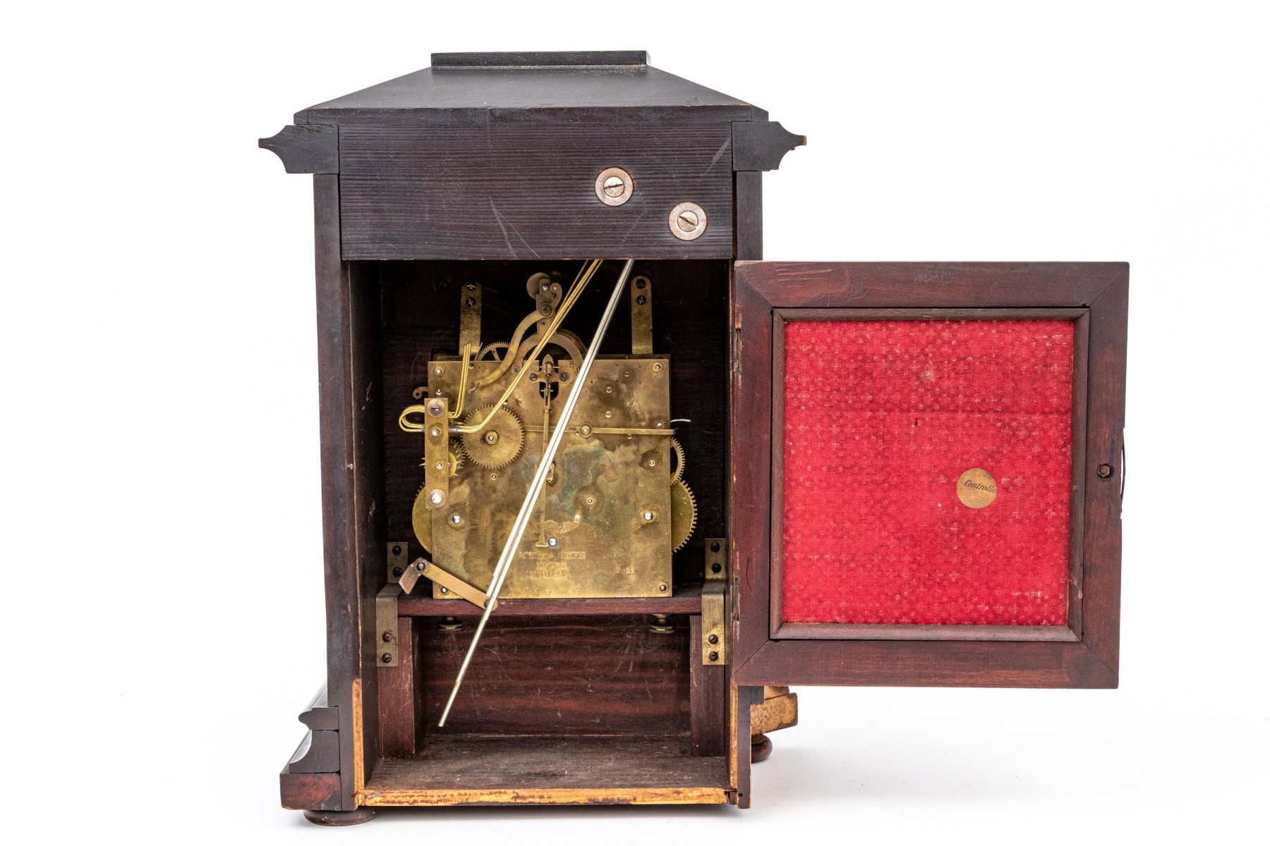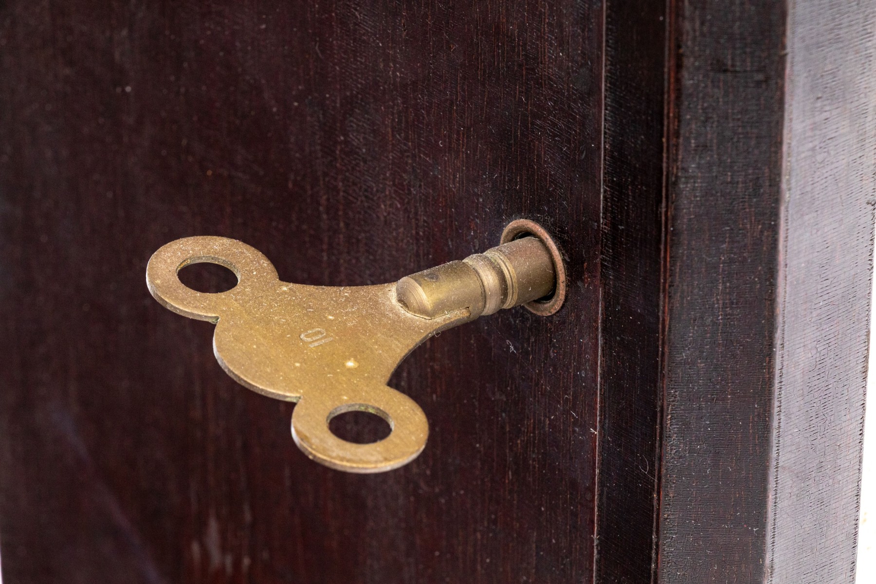 A dark stained wood case with a casque shaped top and bun feet. The face with etched floral decorated frame. With chime and key. Beveled glass cover, door on back.