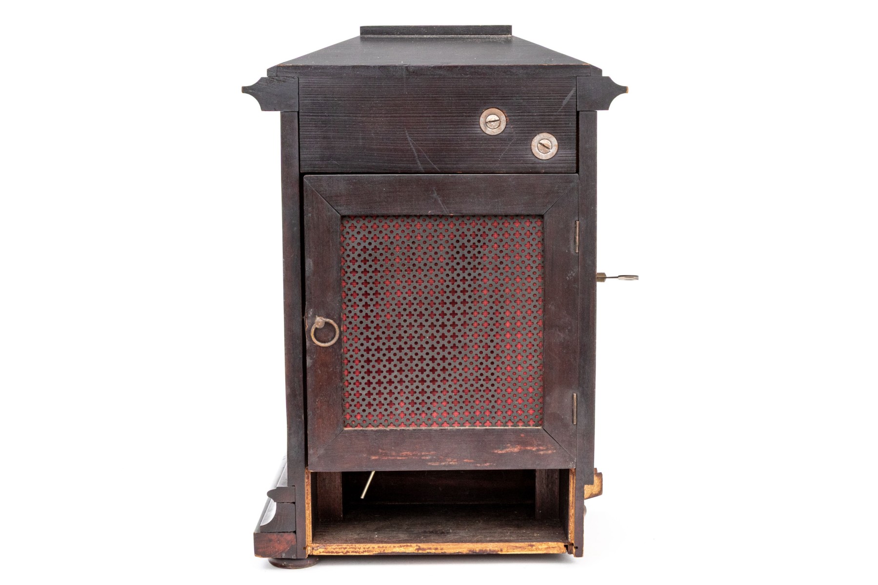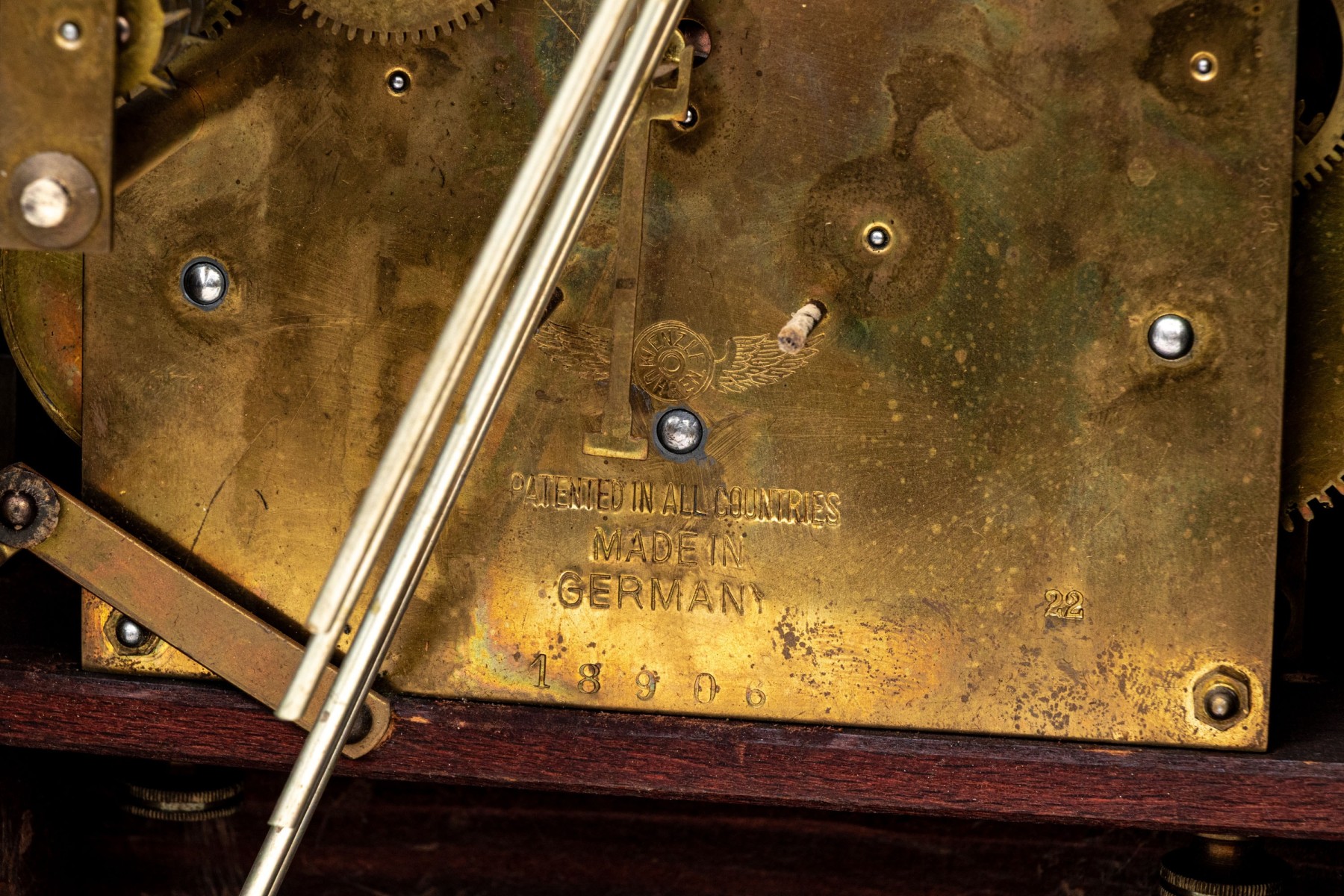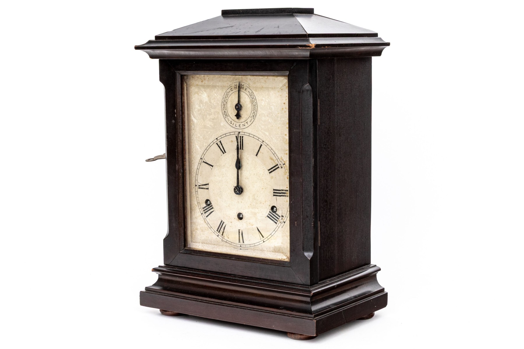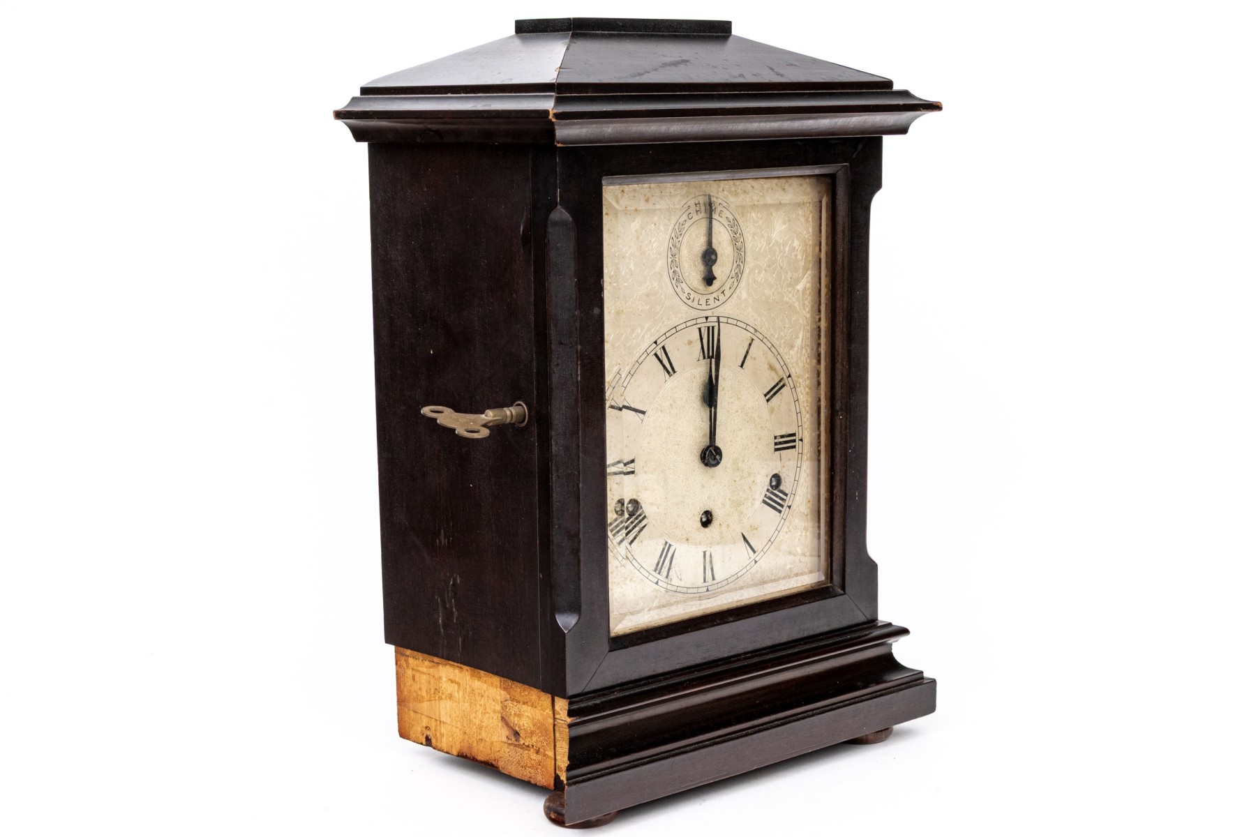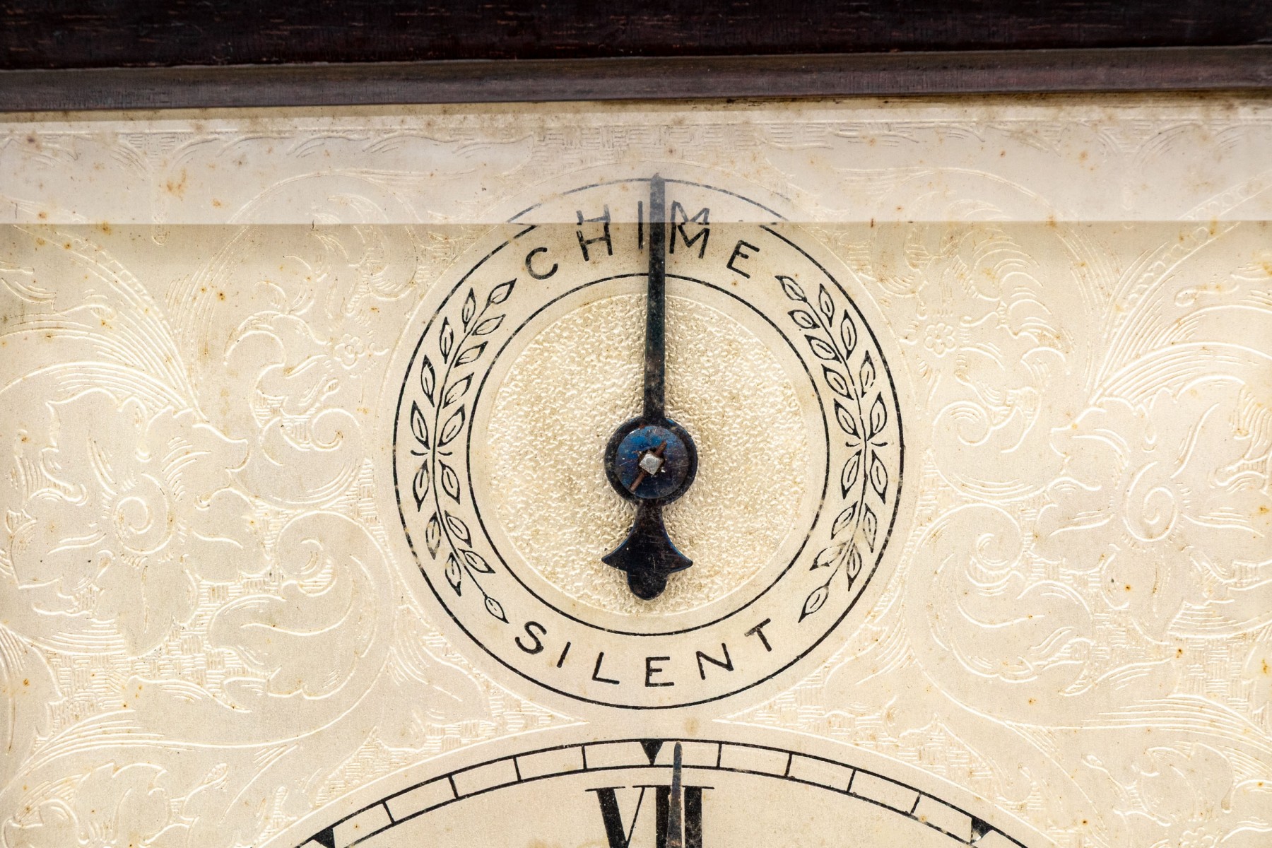 A dark stained wood case with a casque shaped top and bun feet. The face with etched floral decorated frame. With chime and key. Beveled glass cover, door on back.