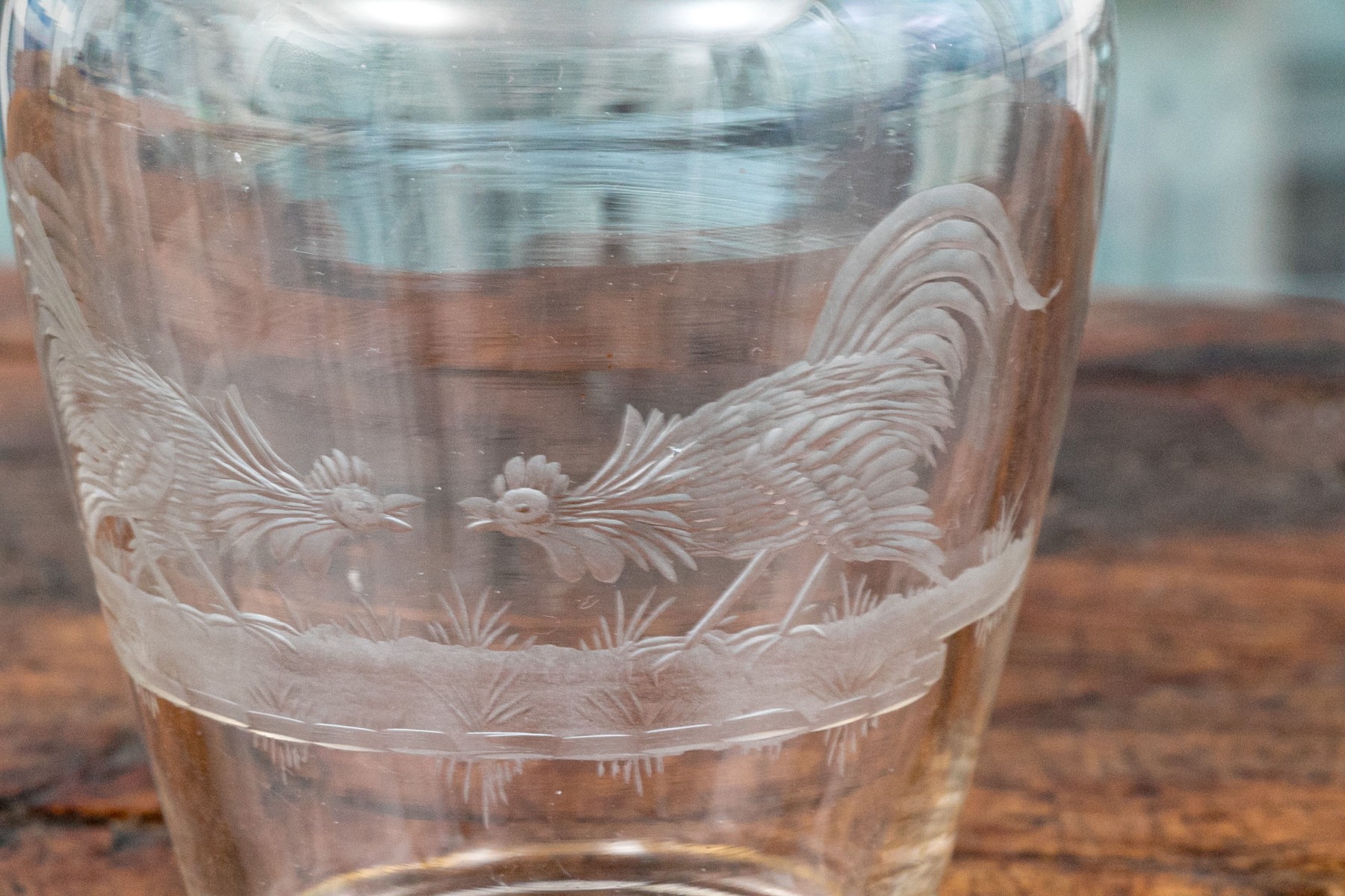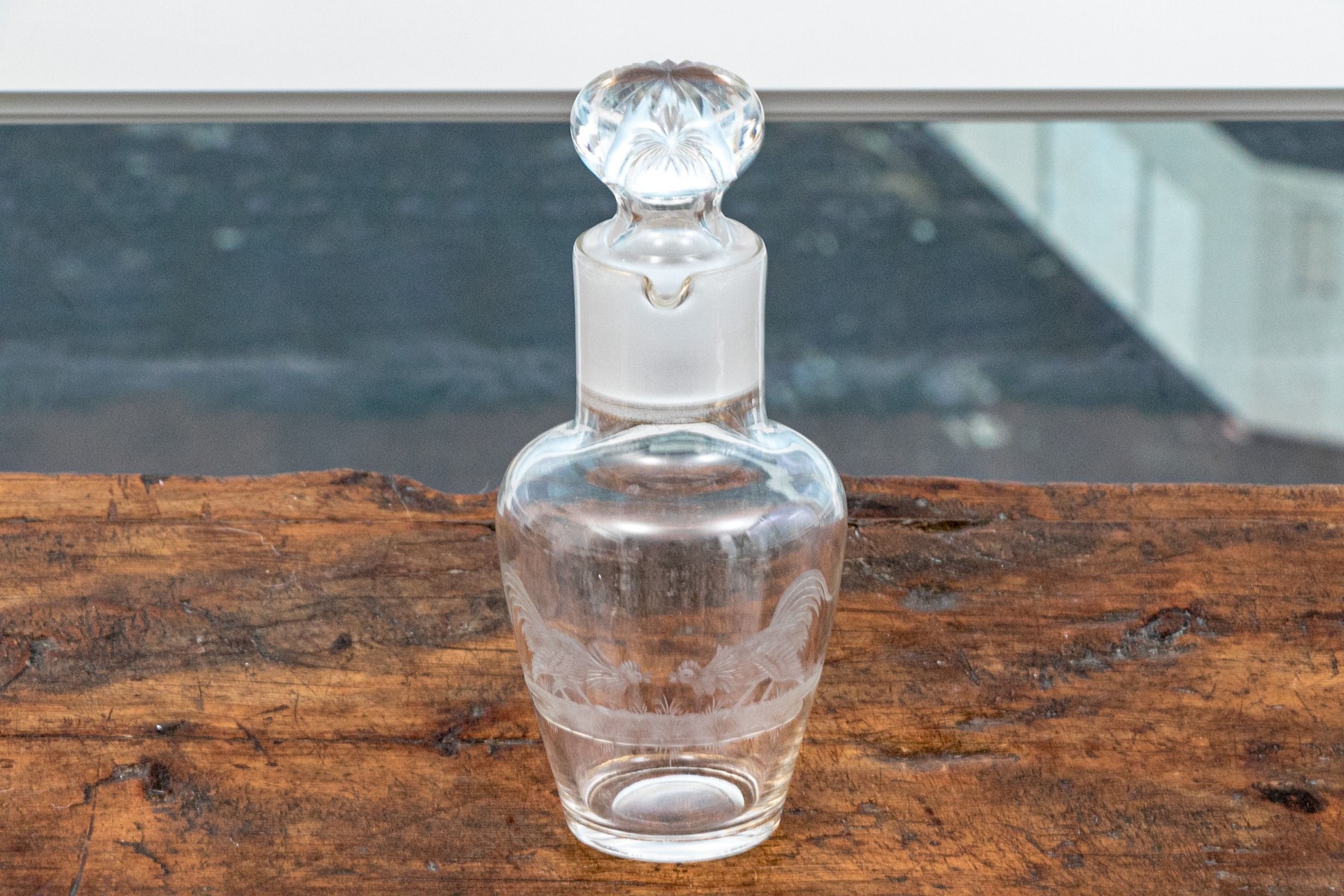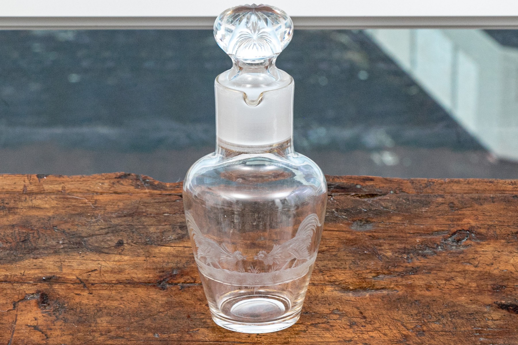 The clear glass body with etched confronting roosters on grass. With a frosted glass neck with two spouts, and thin gilt bands around the neck and base. The stopper with a frosted neck and starburst caved top.