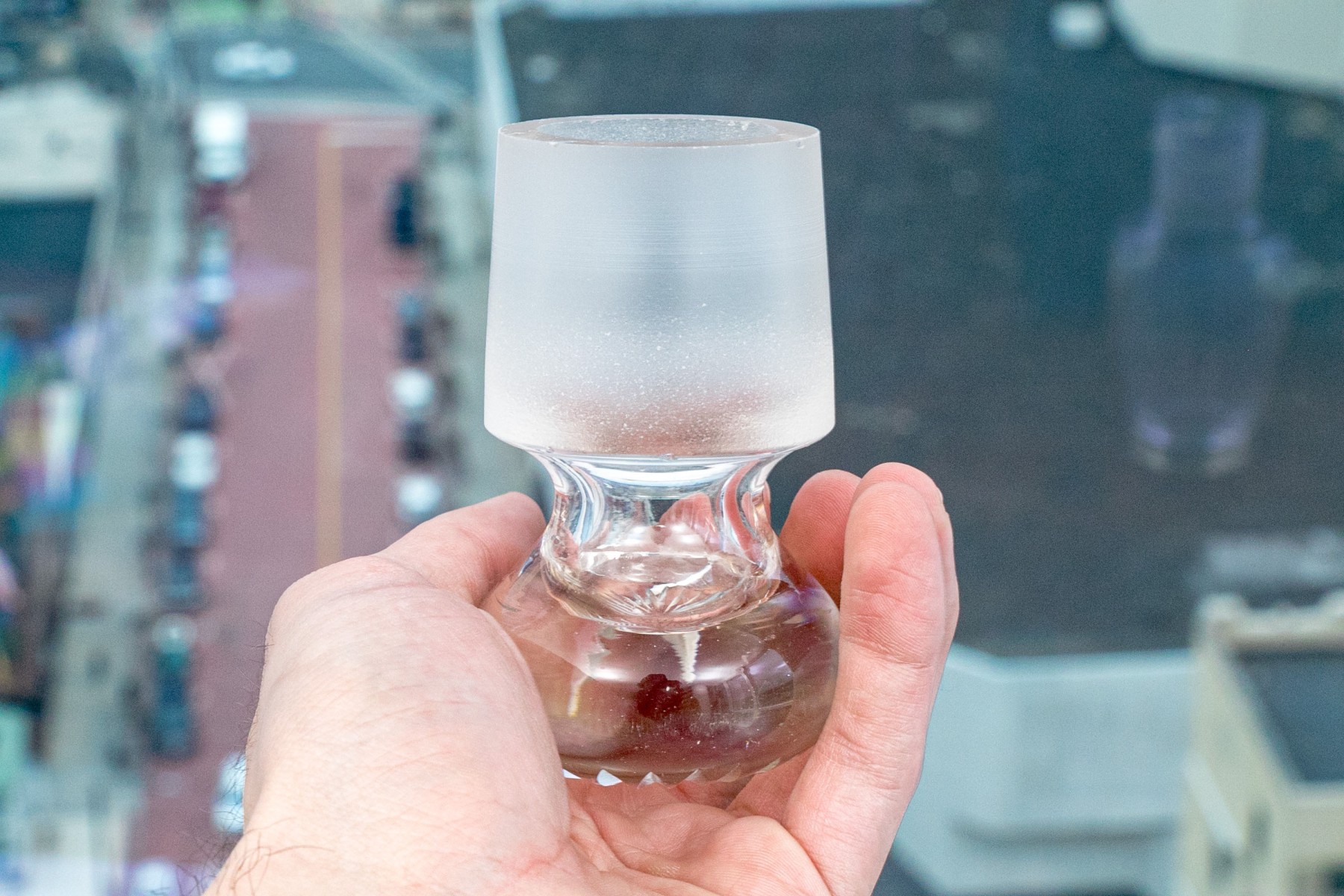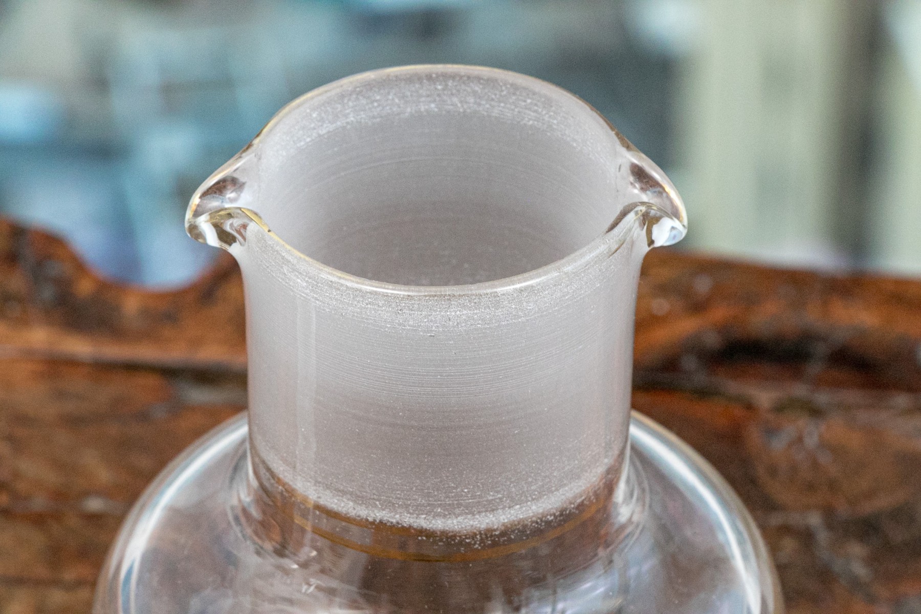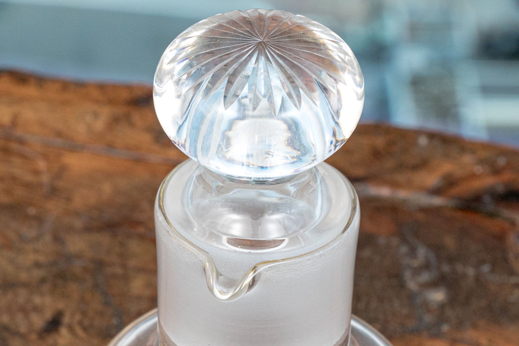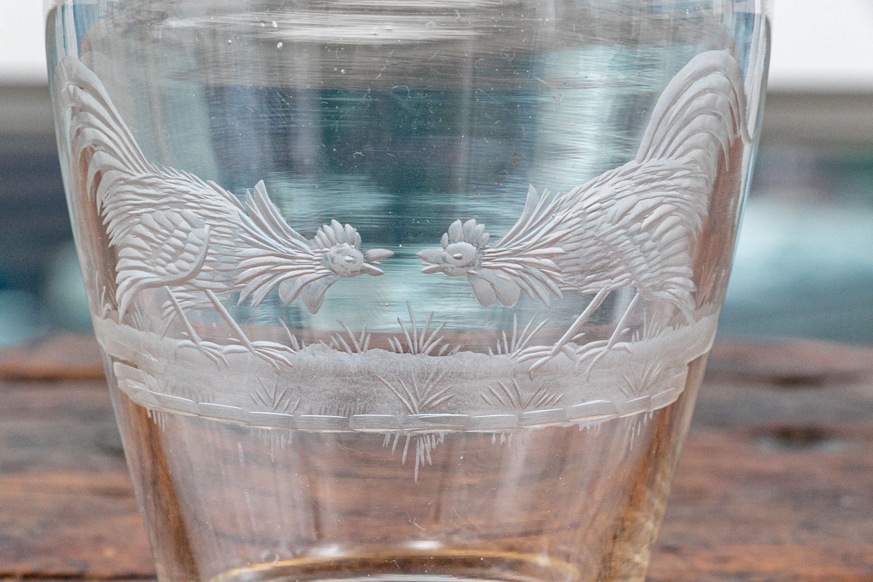 The clear glass body with etched confronting roosters on grass. With a frosted glass neck with two spouts, and thin gilt bands around the neck and base. The stopper with a frosted neck and starburst caved top.