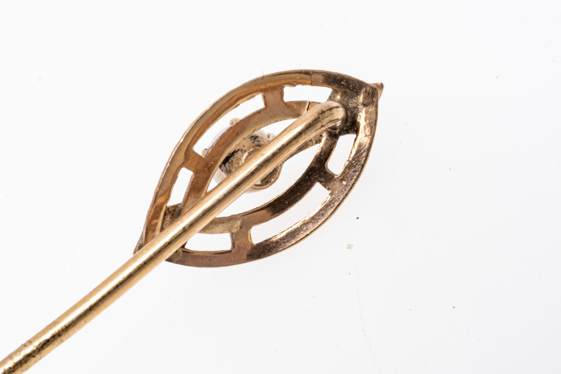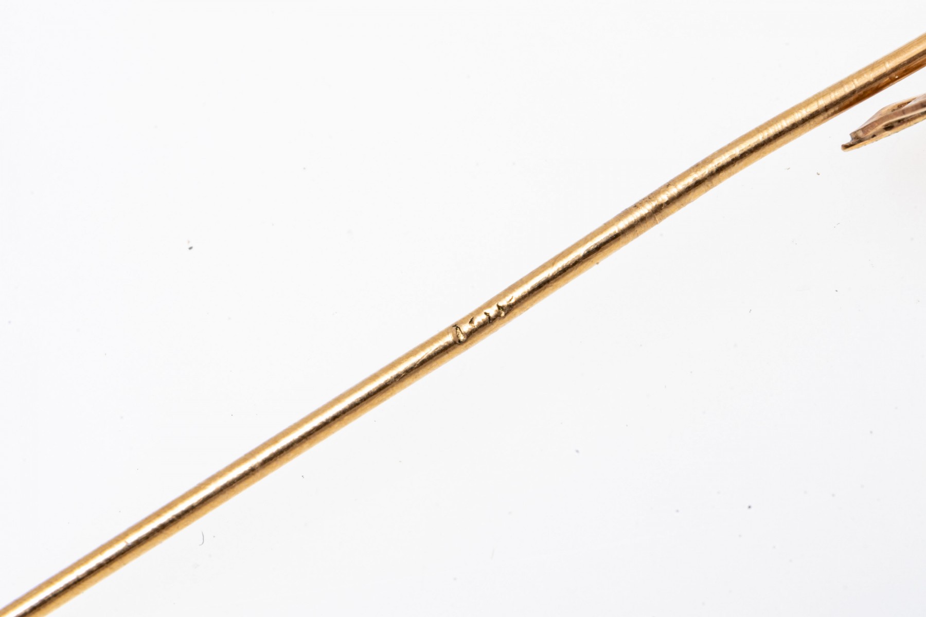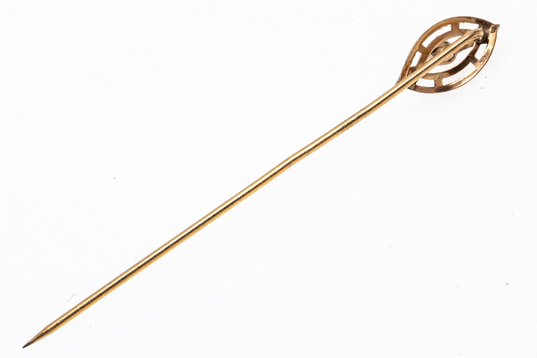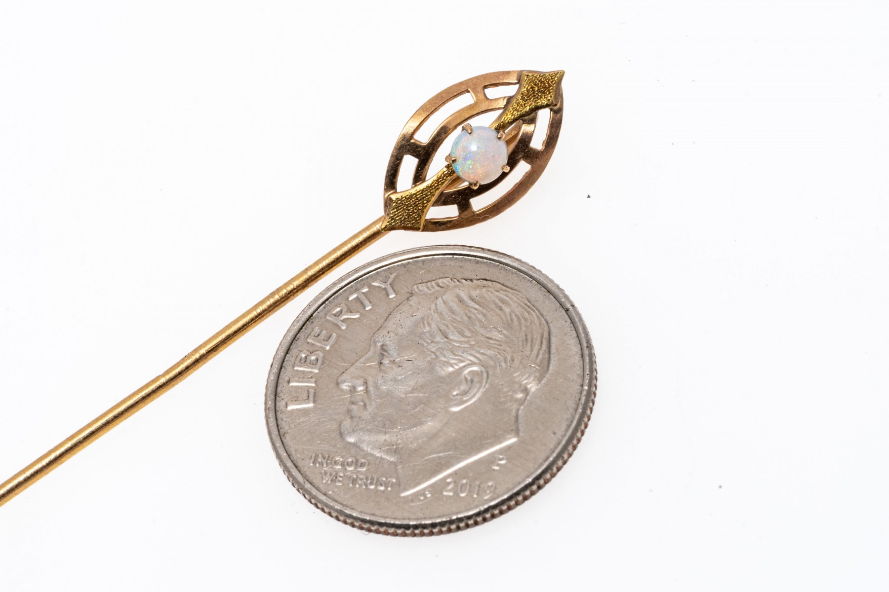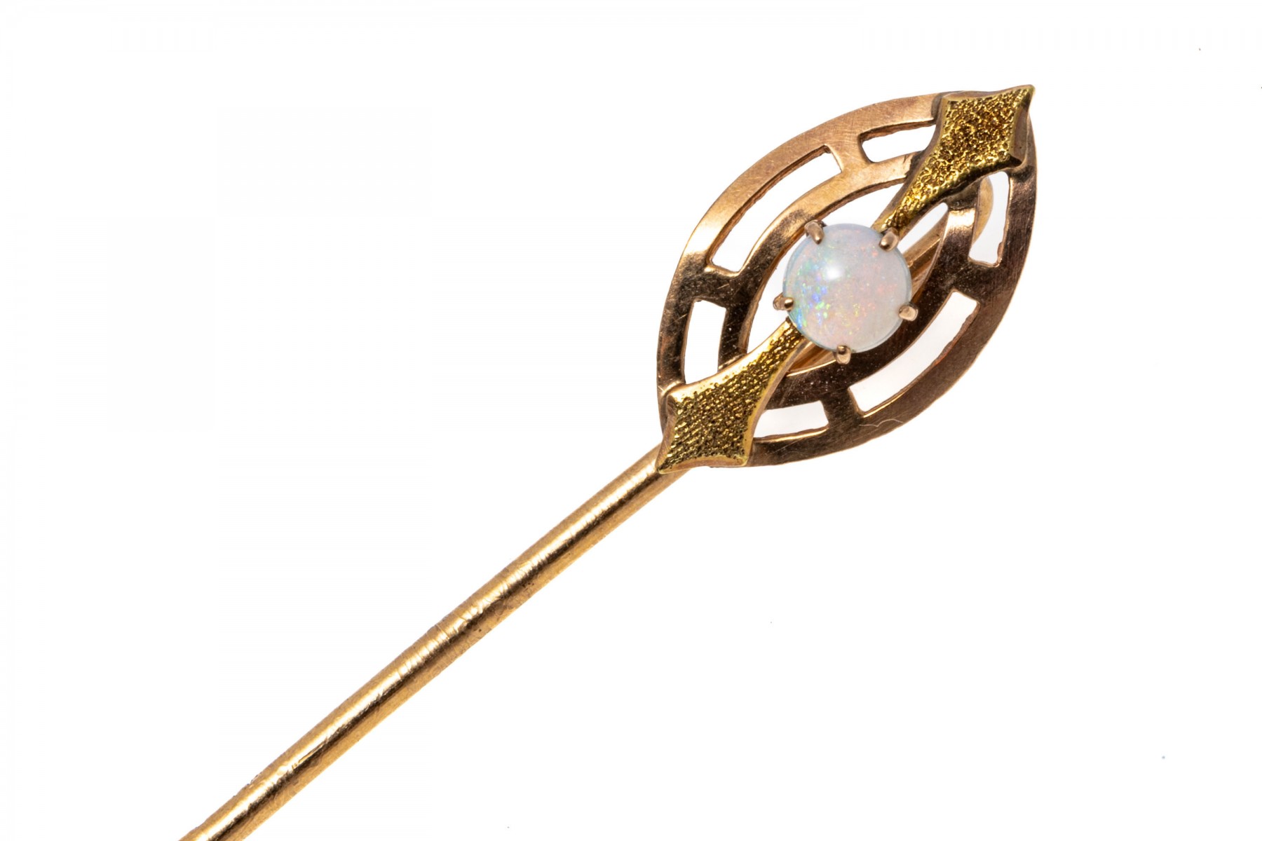 A petite gold filled stick pin displaying an opal set over a nevette style face.