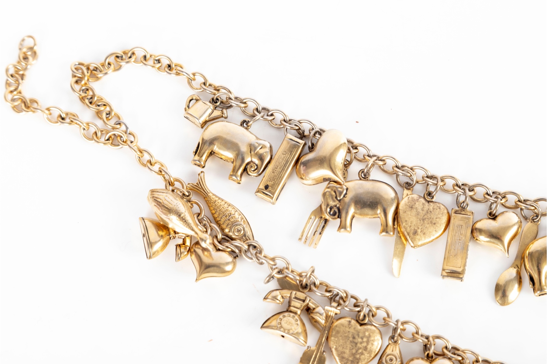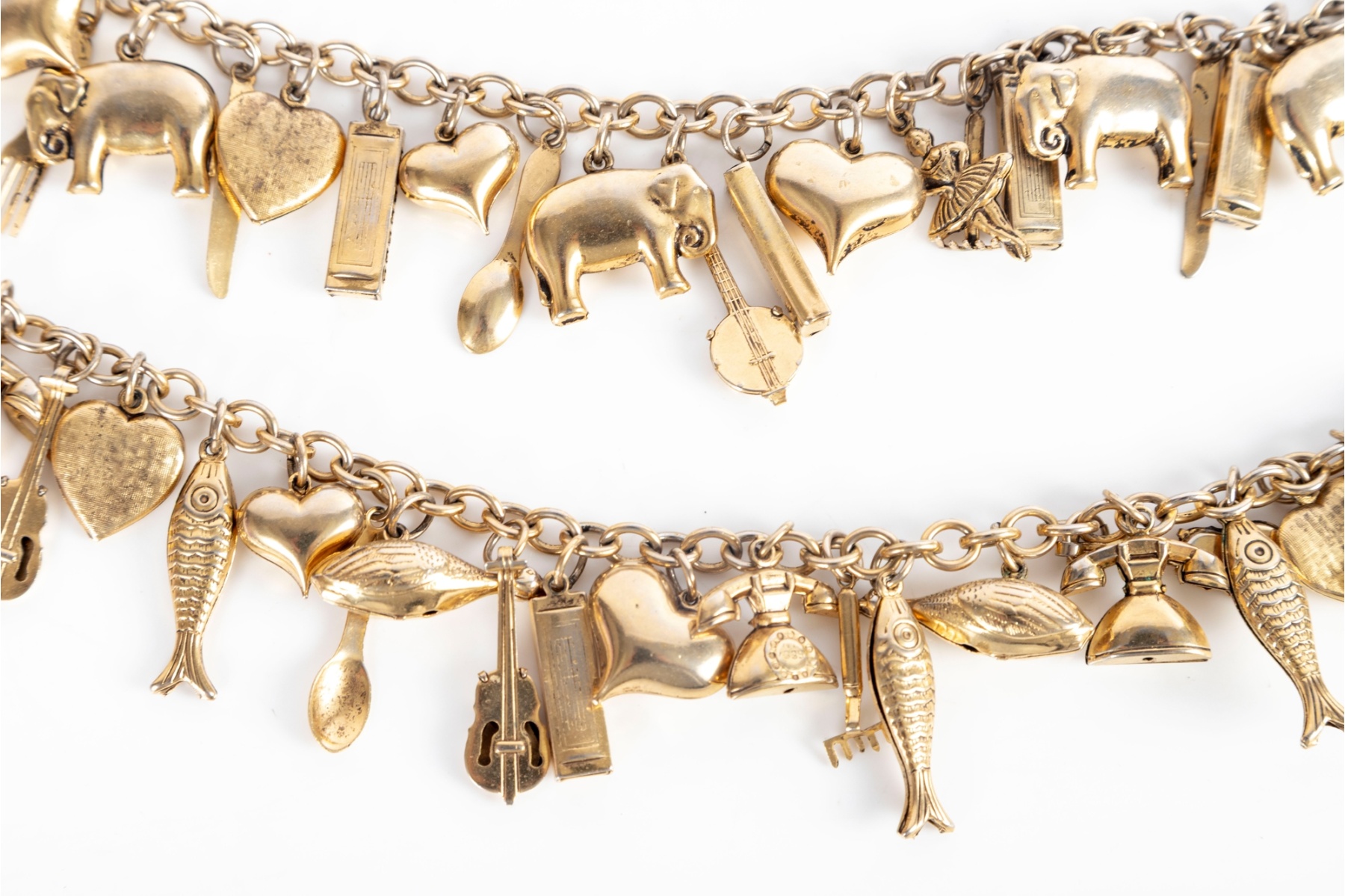 Fun and whimsical pair of gold-tone steel charm bracelets, each loaded with an eclectic assortment of miniature charms. Motifs include elephants, fish, hearts, musical instruments, everyday objects, and other playful figural pieces.