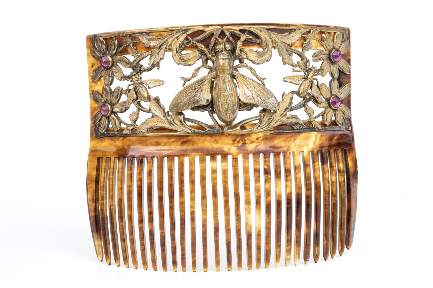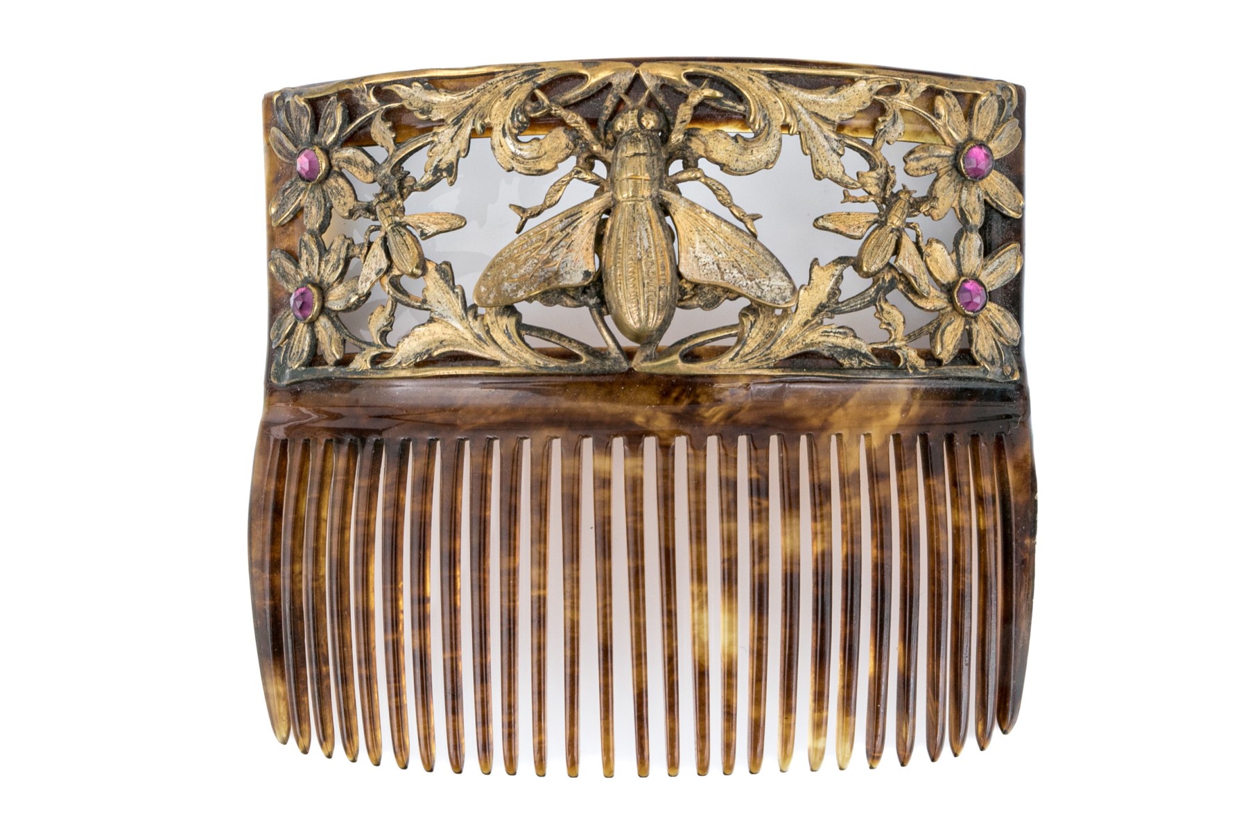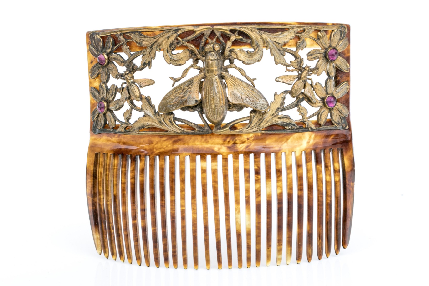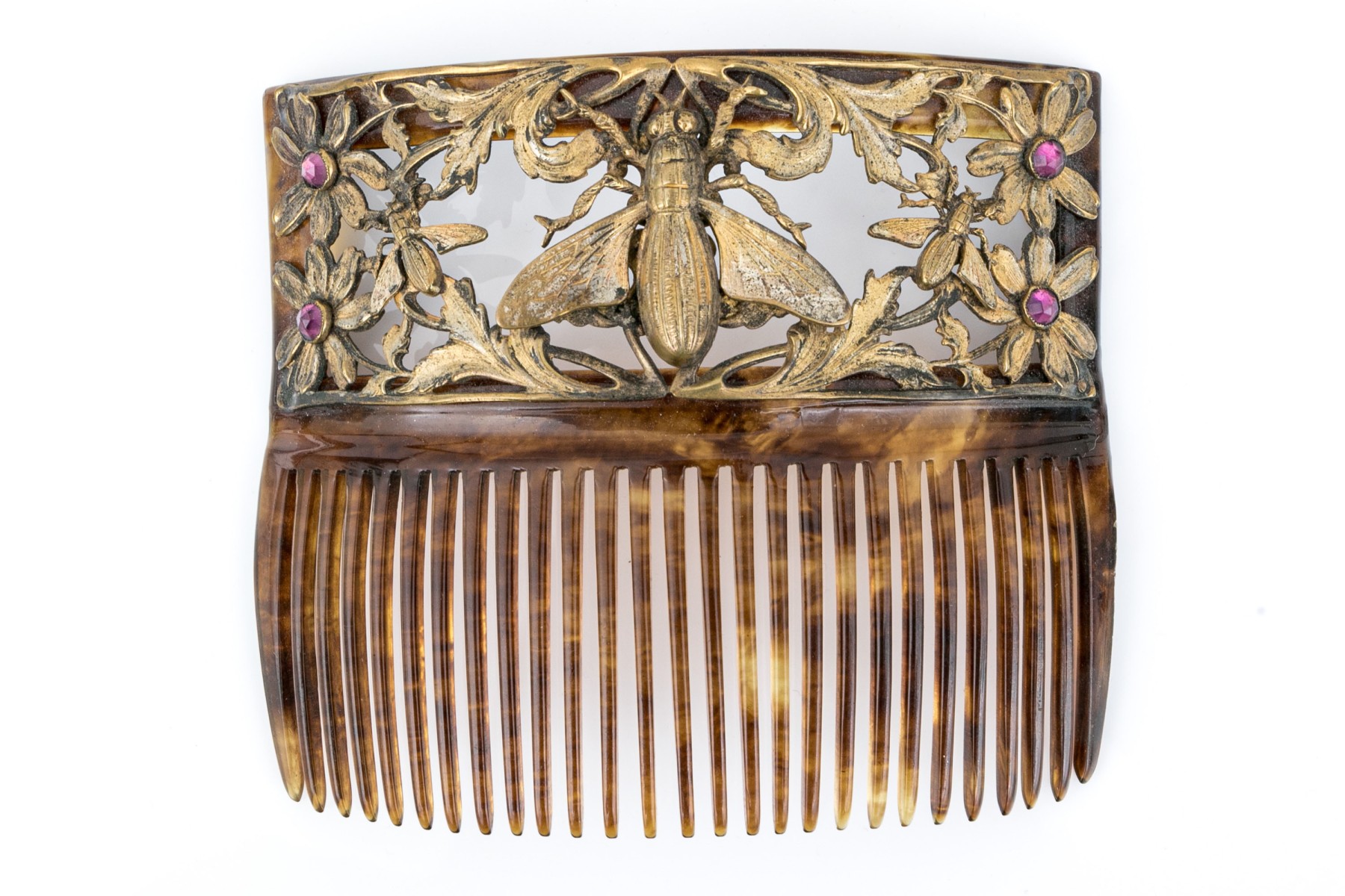 A large curved hair comb in faux tortoise shell decorated with a wide gold washed openwork inset metal band at the top. Three bees are set onto foliate scrolls with purple glass centers on four flowers.