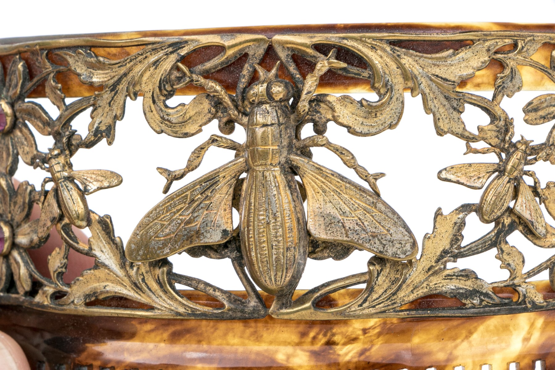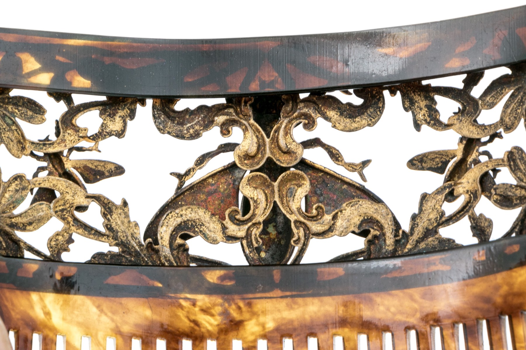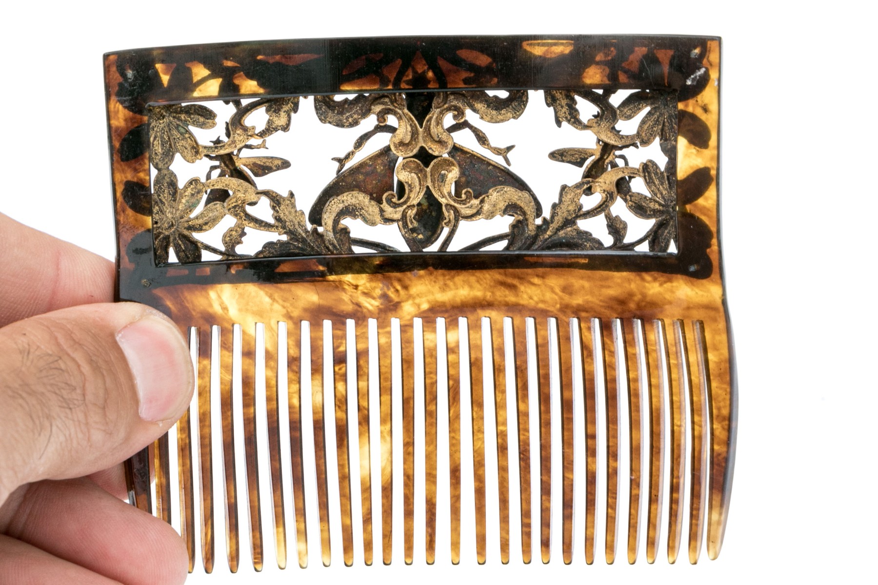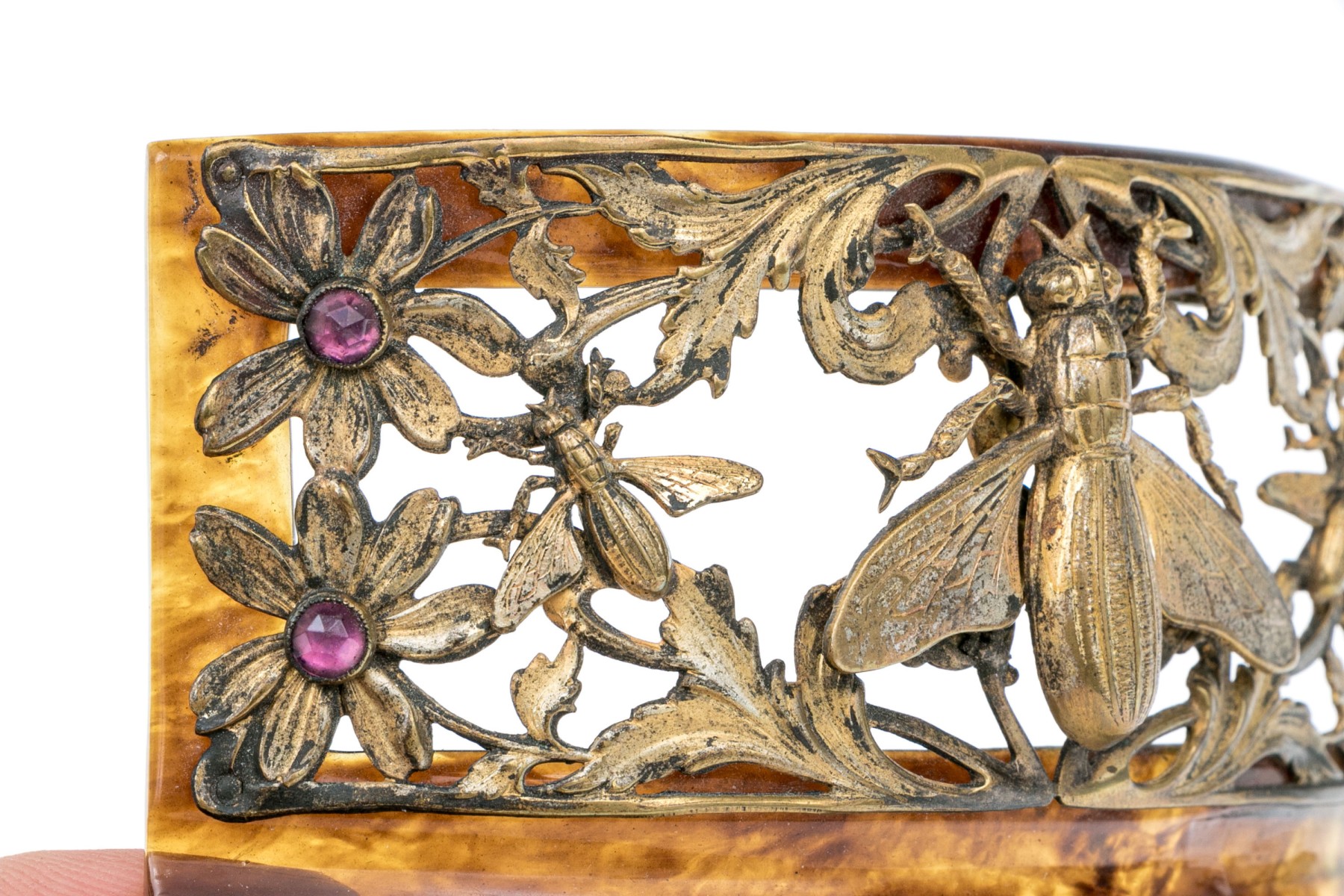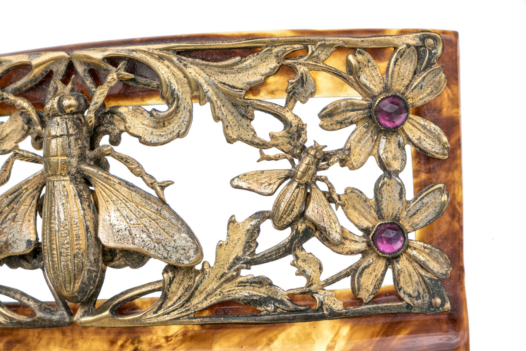 A large curved hair comb in faux tortoise shell decorated with a wide gold washed openwork inset metal band at the top. Three bees are set onto foliate scrolls with purple glass centers on four flowers.