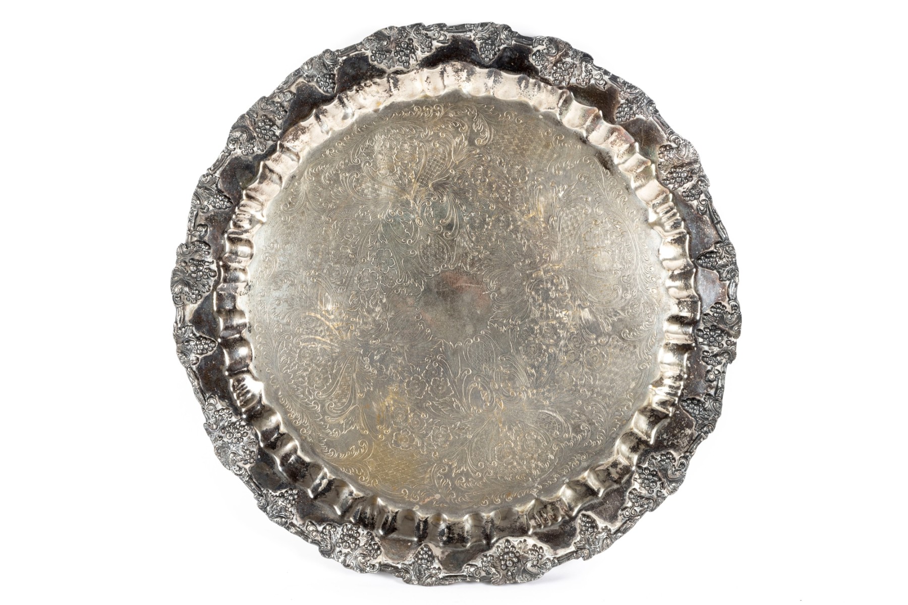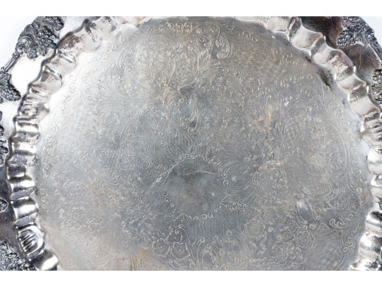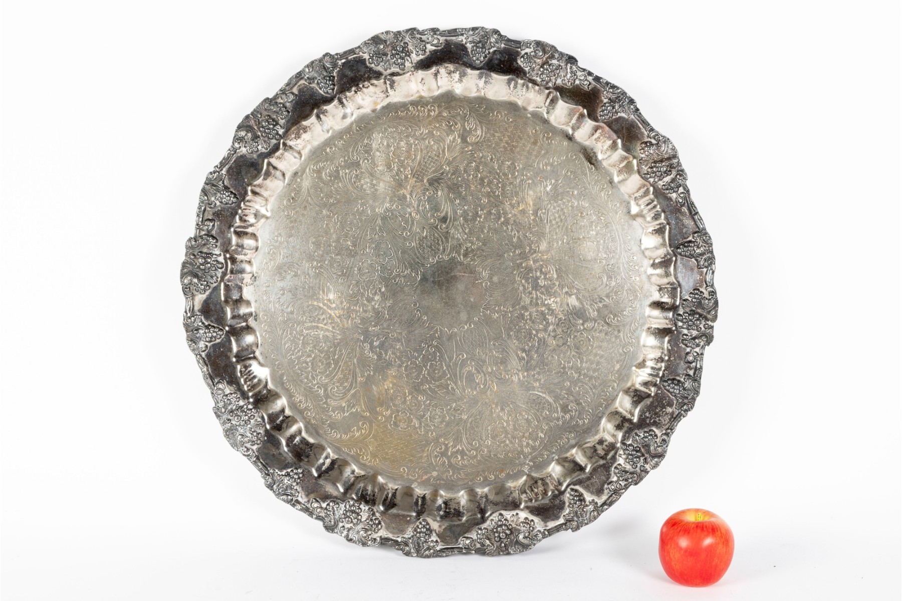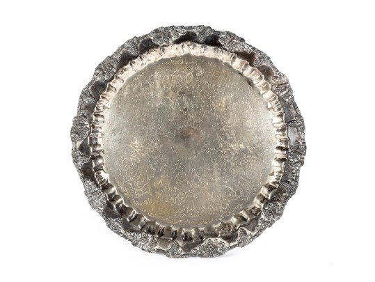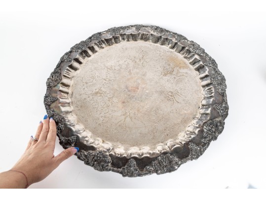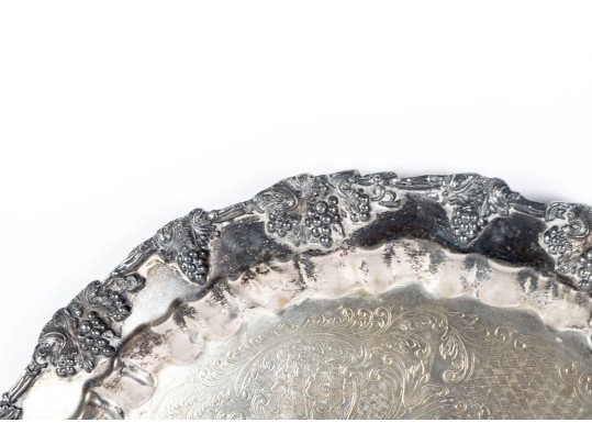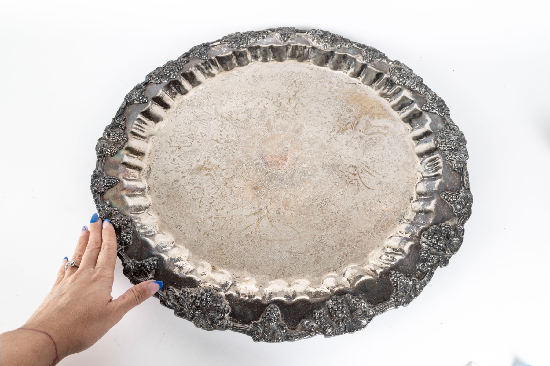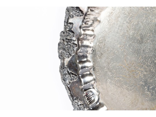 This 22-inch round silver-plated serving tray by Goldfeder Silver Co. features ornate centered engravings and a decorative grapevine "pie crust" trim. Its elegant handles and intricate detailing make it perfect for formal serving or display.