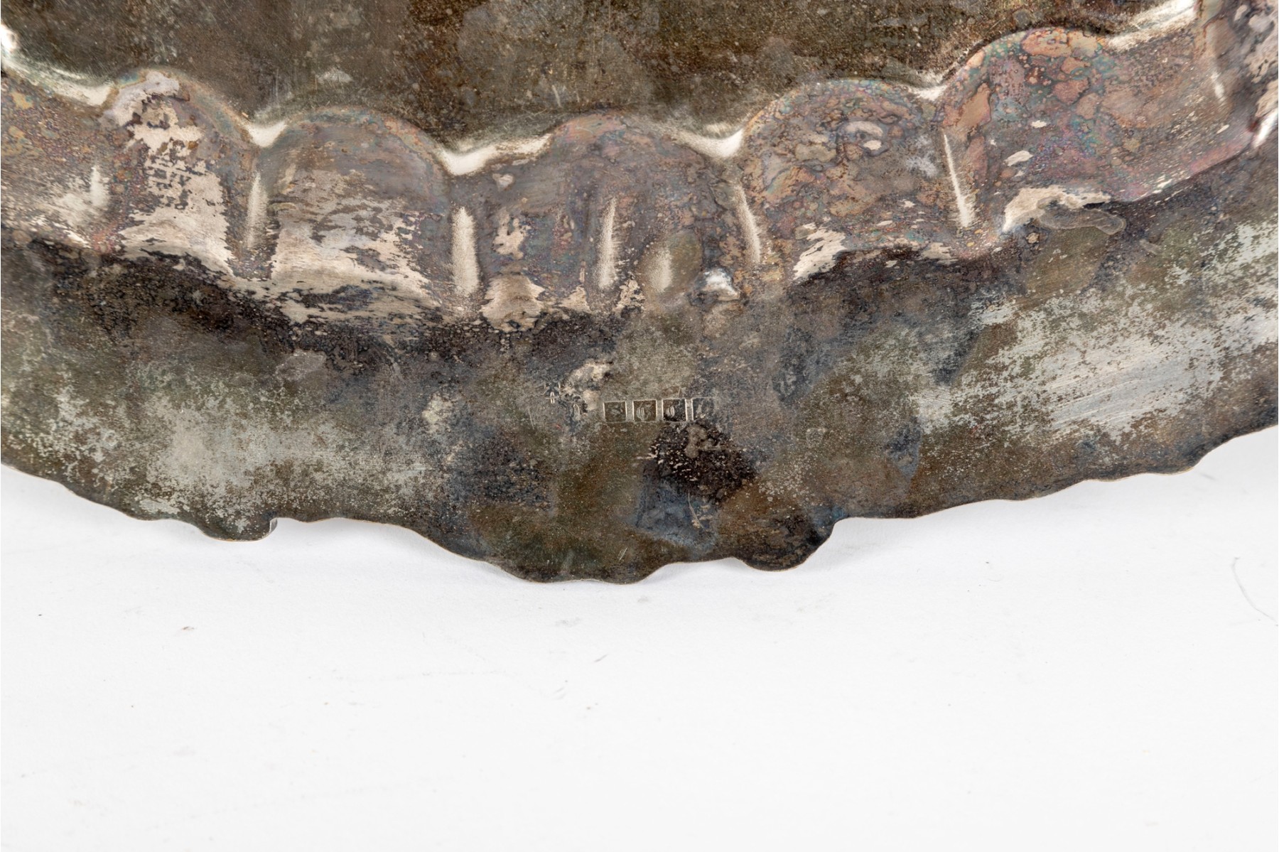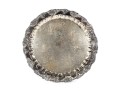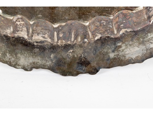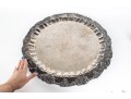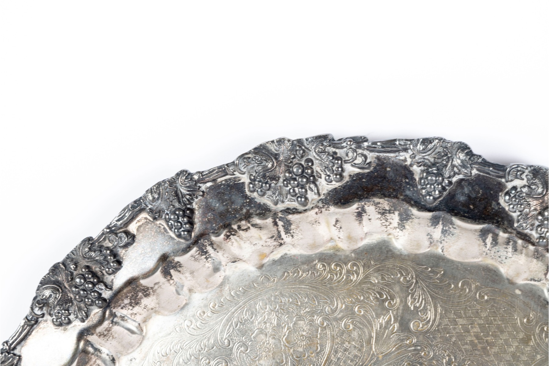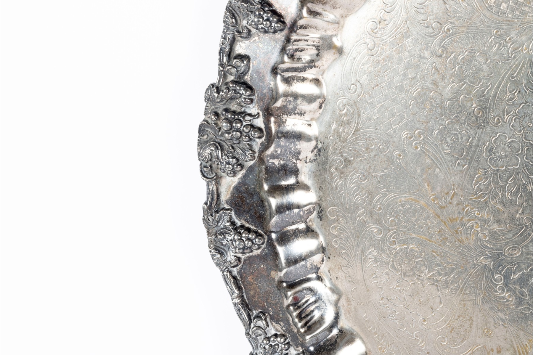 This 22-inch round silver-plated serving tray by Goldfeder Silver Co. features ornate centered engravings and a decorative grapevine "pie crust" trim. Its elegant handles and intricate detailing make it perfect for formal serving or display.