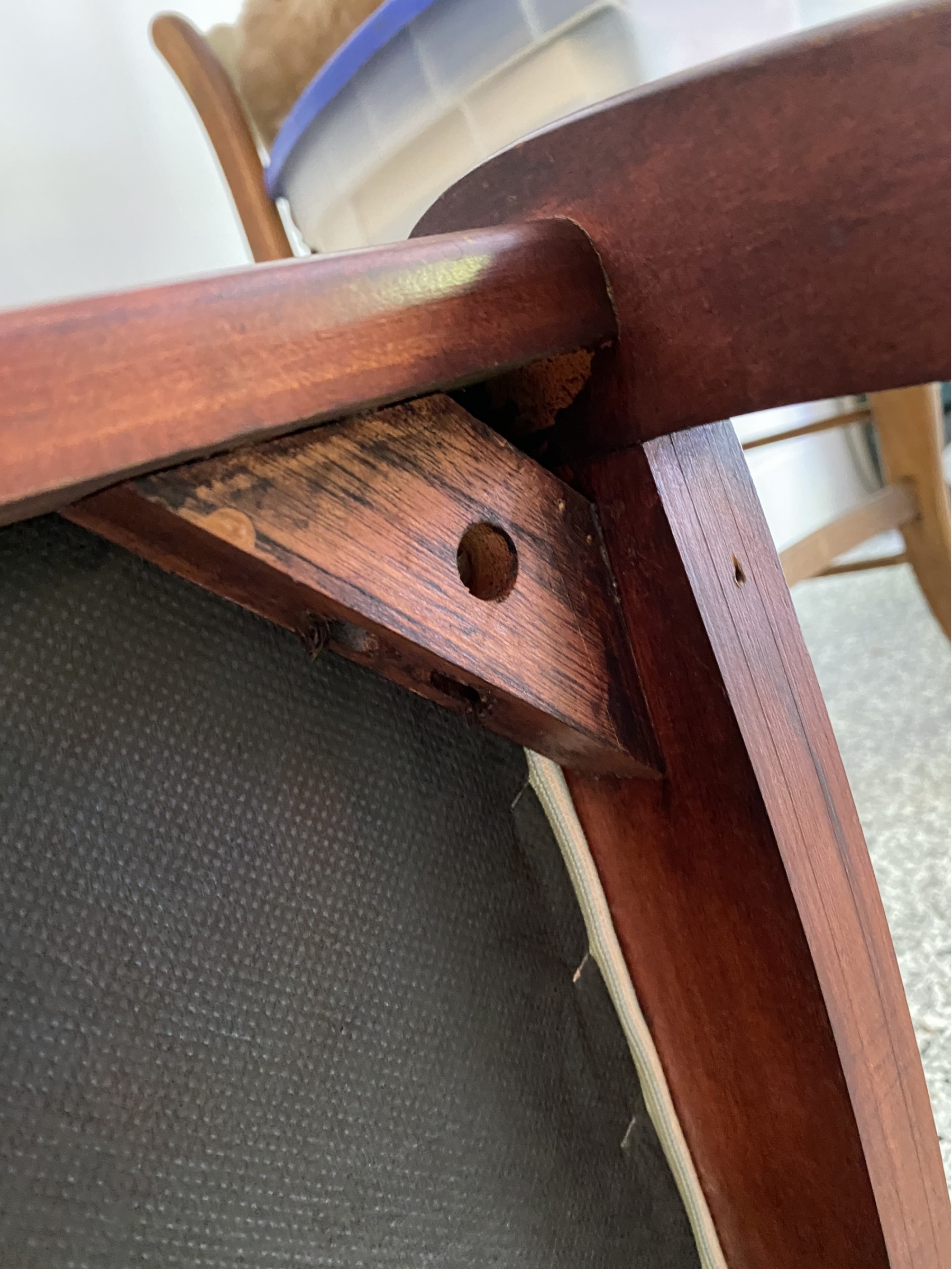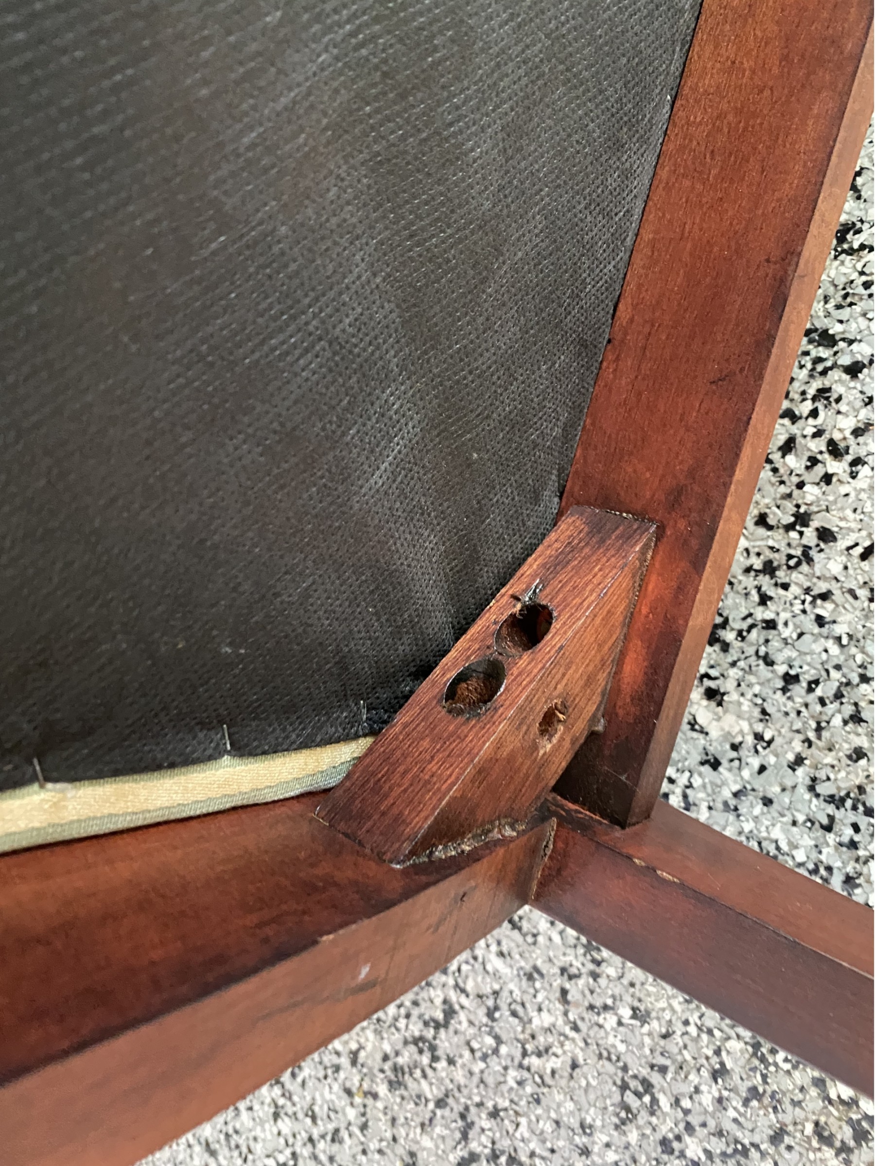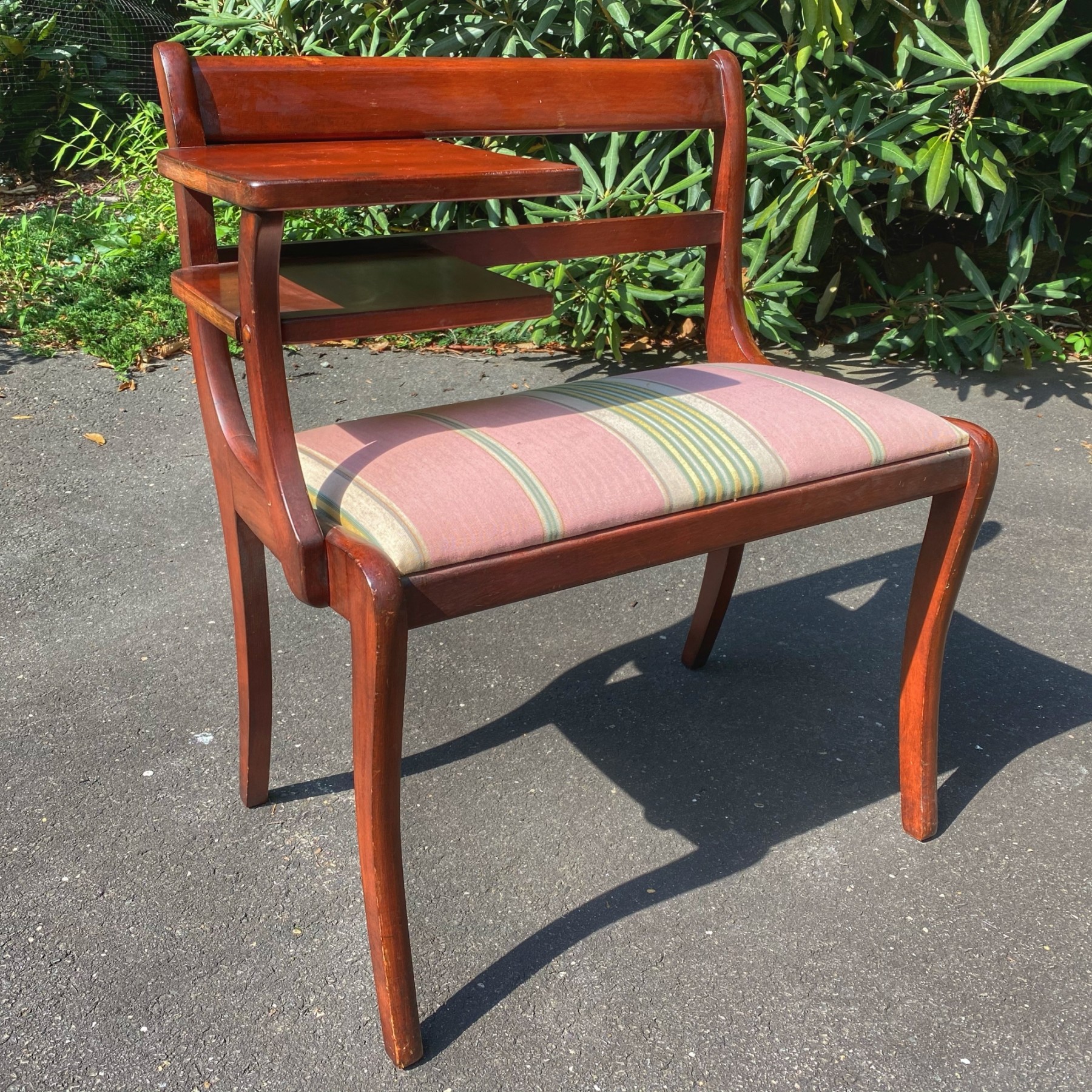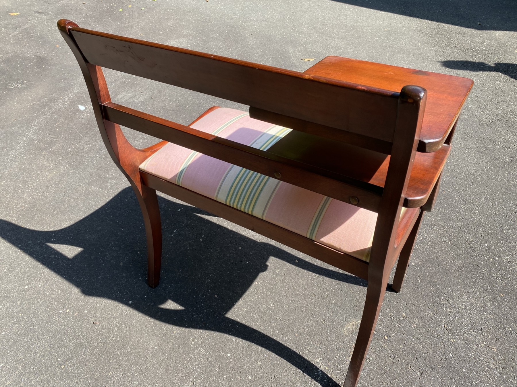 Good sturdy condition, some surface wear and light scratching to wood. Upholstery has some marks.