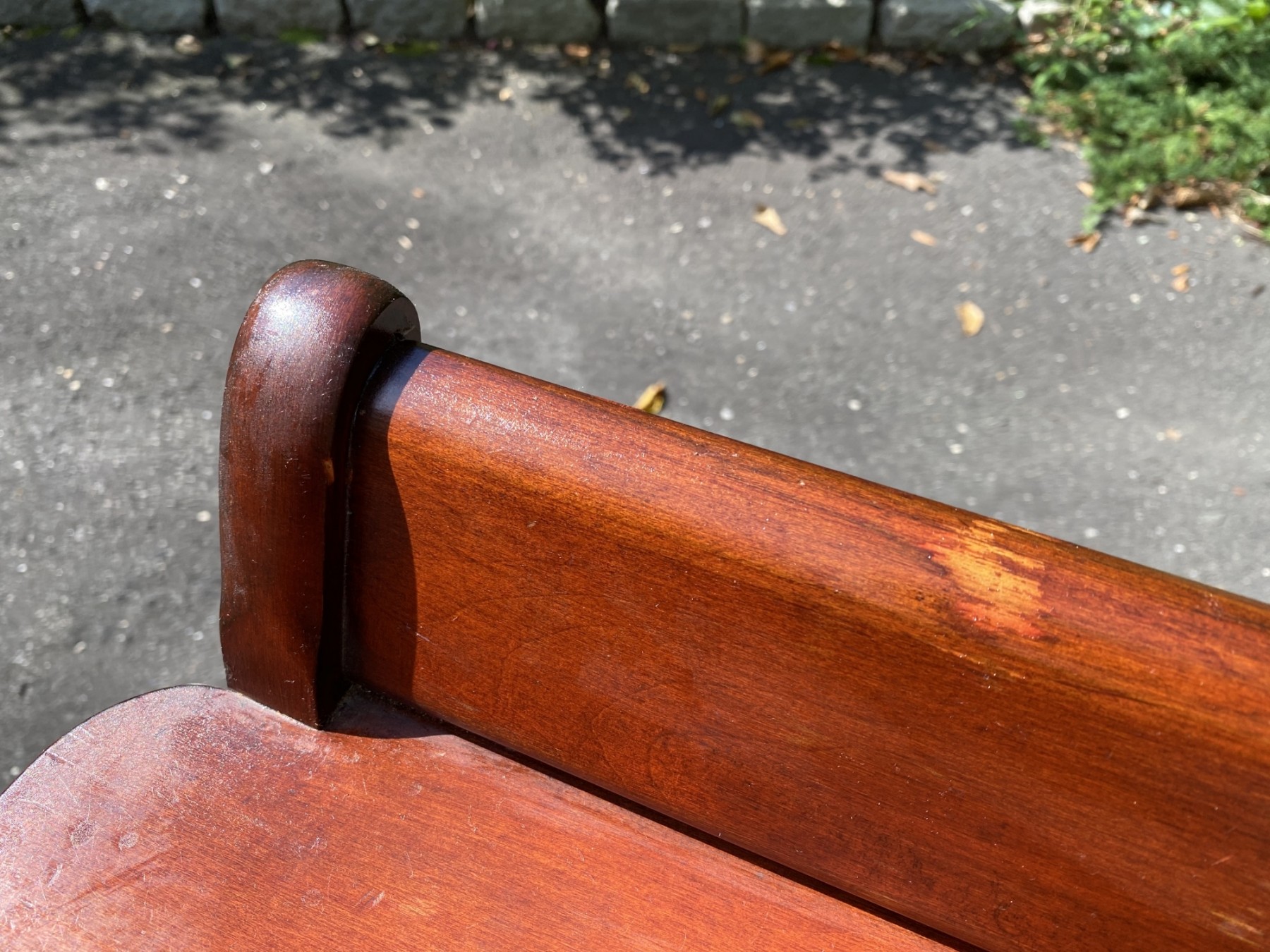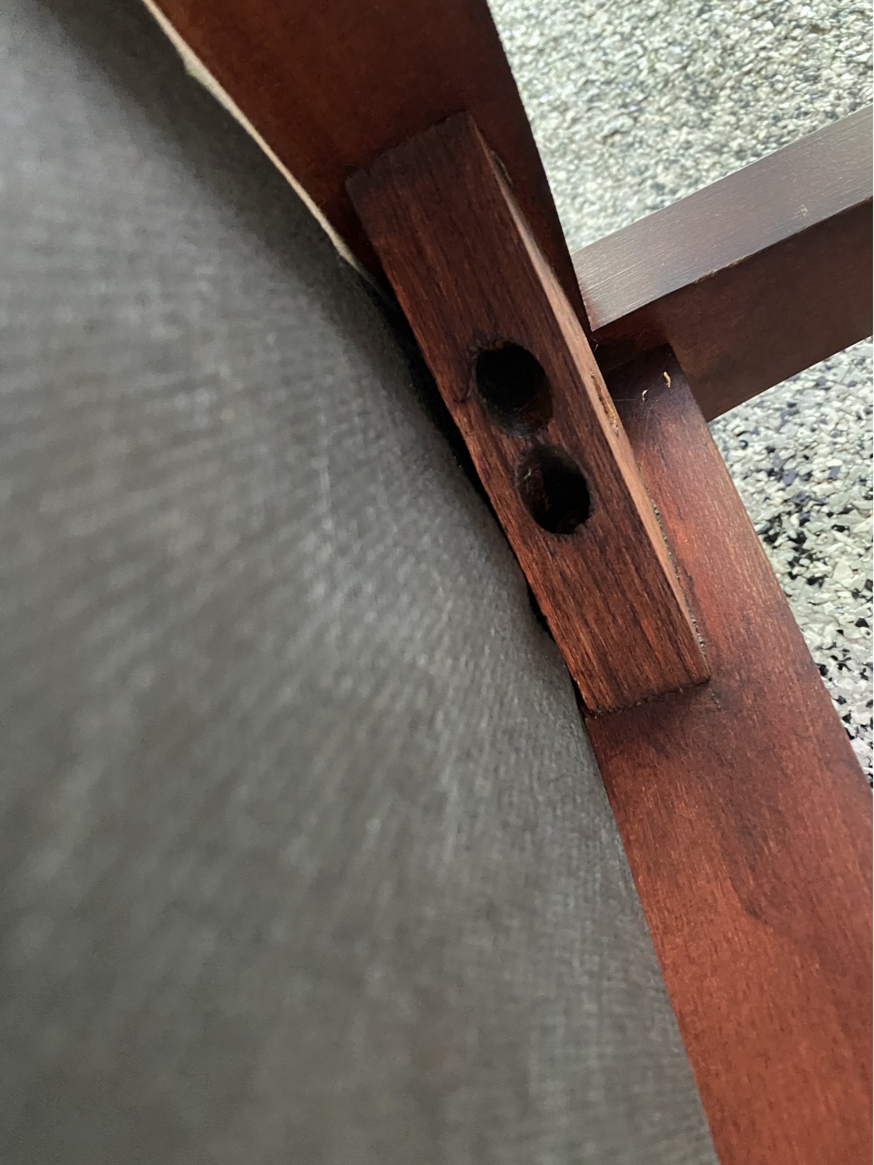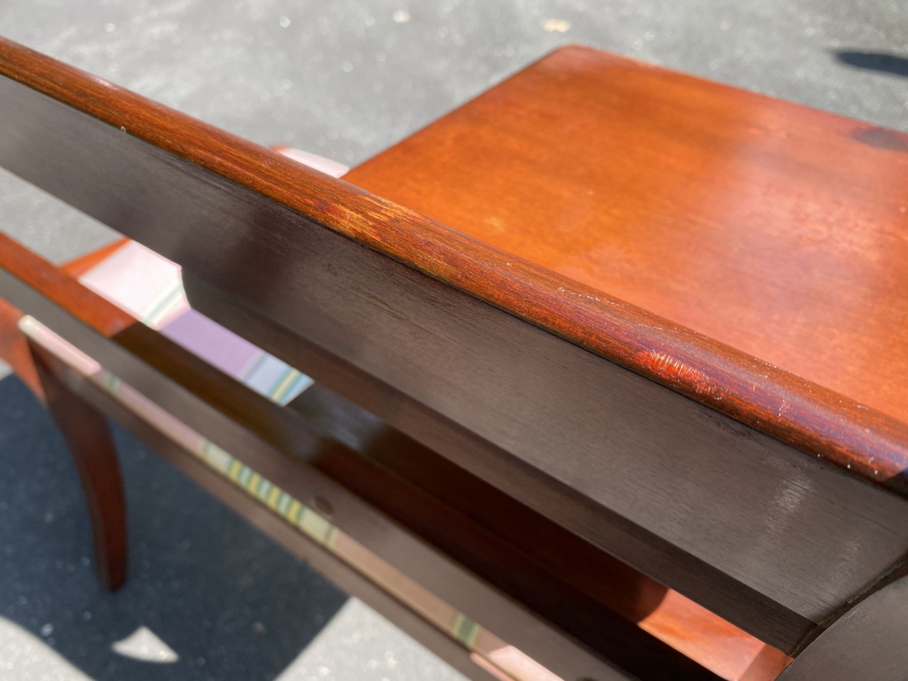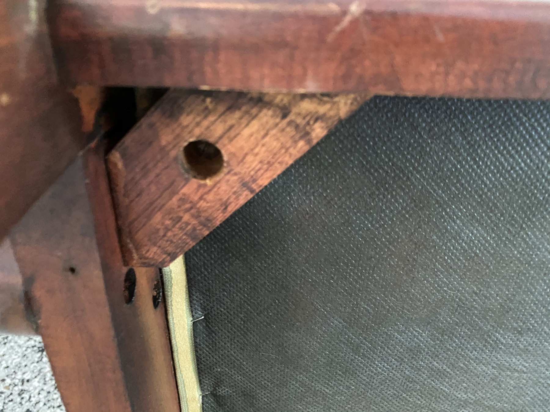 Good sturdy condition, some surface wear and light scratching to wood. Upholstery has some marks.
