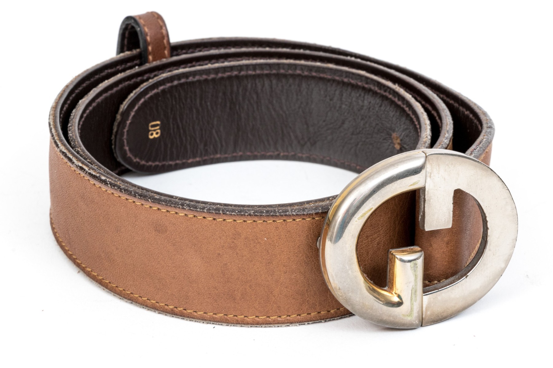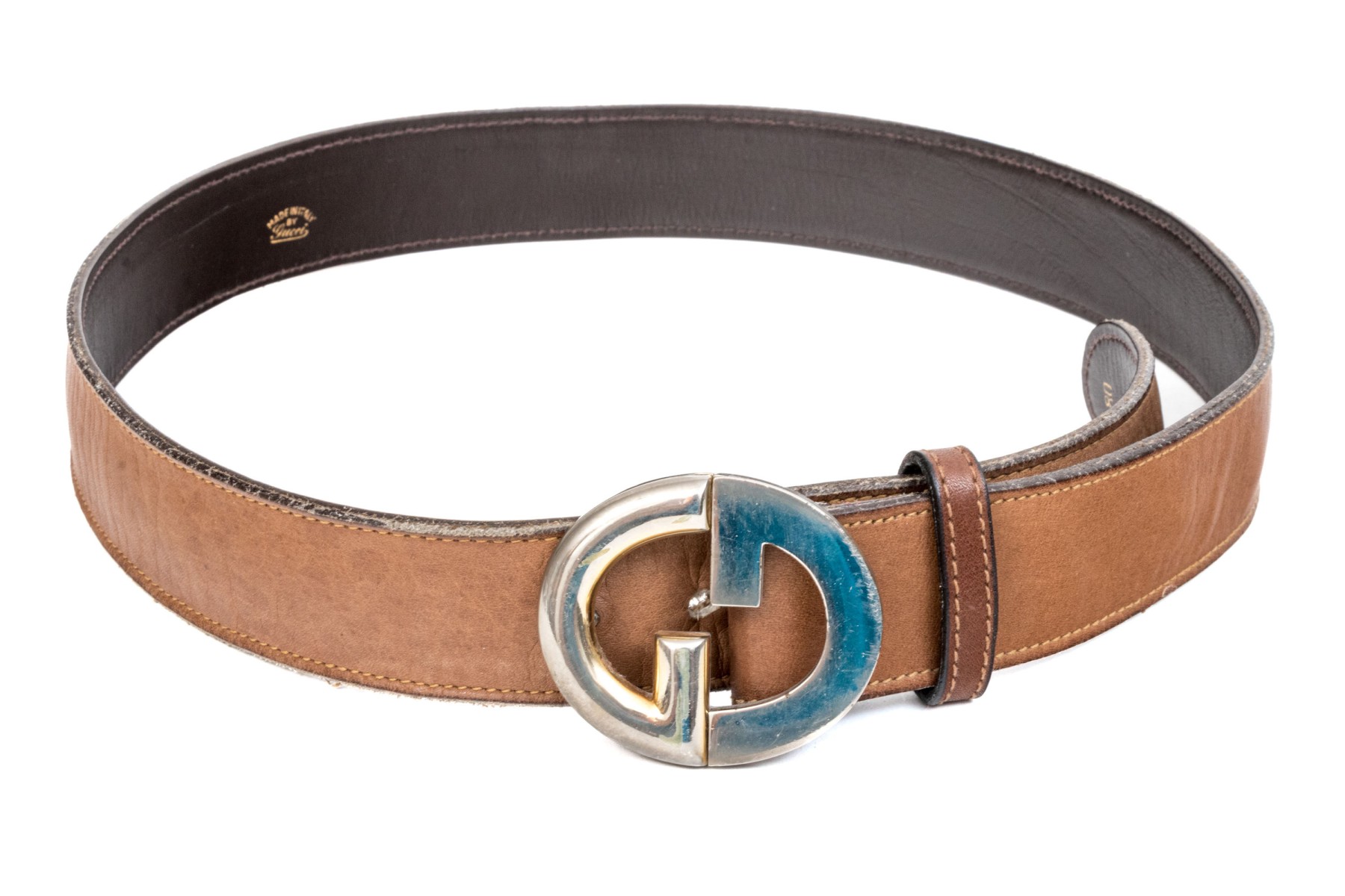 A fabulous, vintage Gucci belt in light brown leather with a dark brown interior, finished with a logo buckle.
