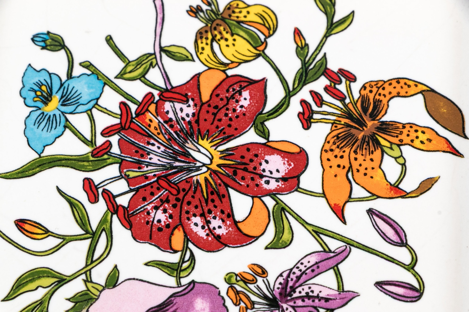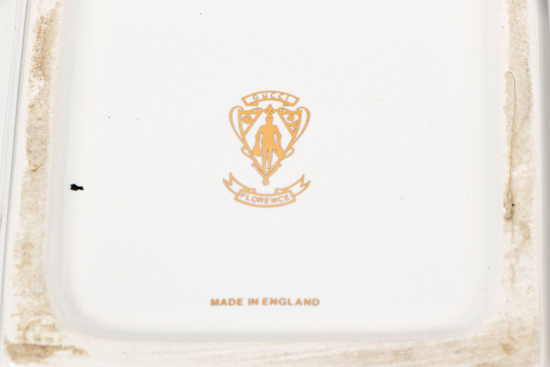 Made in England. A square ecru ashtray decorated with colorful flowers.