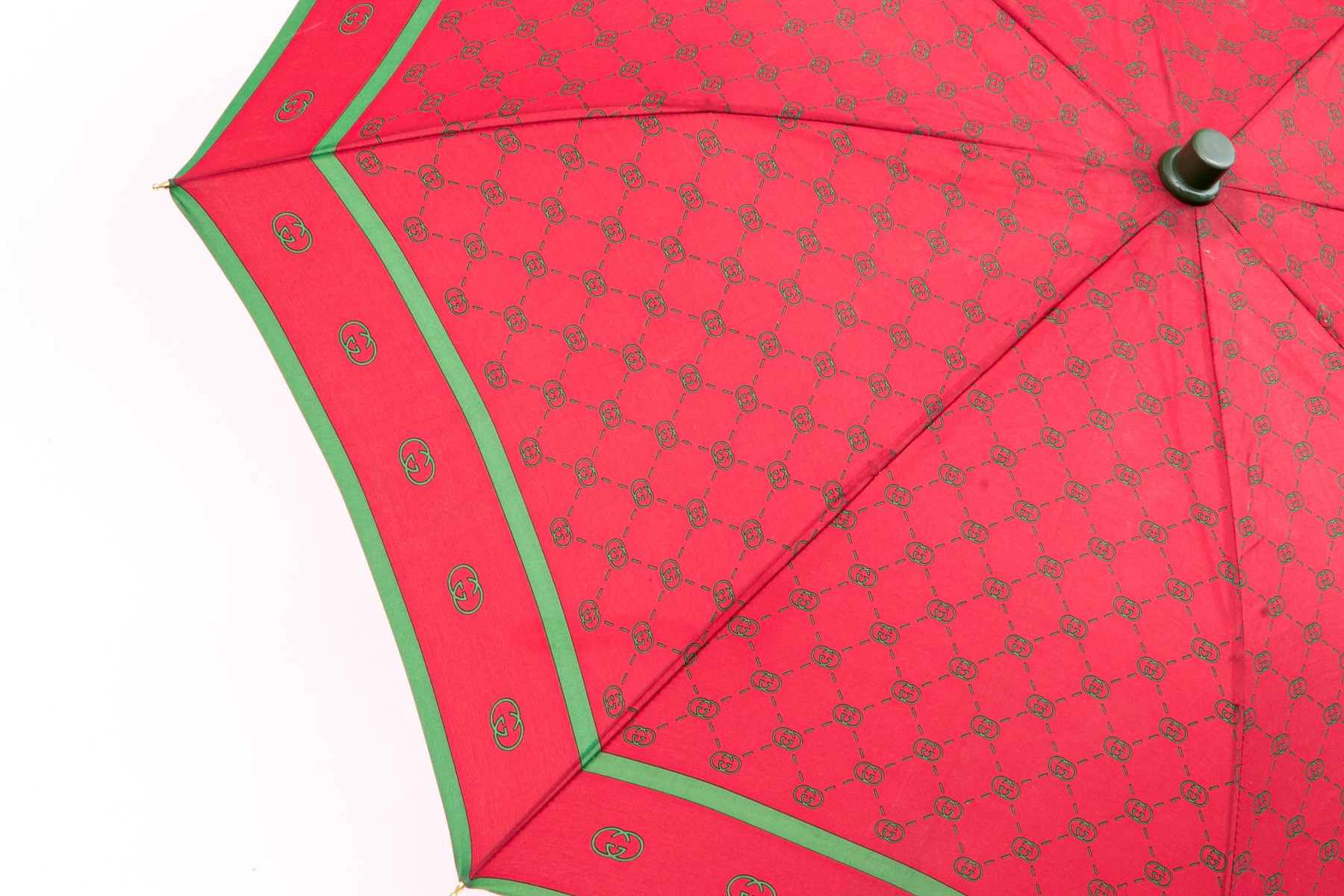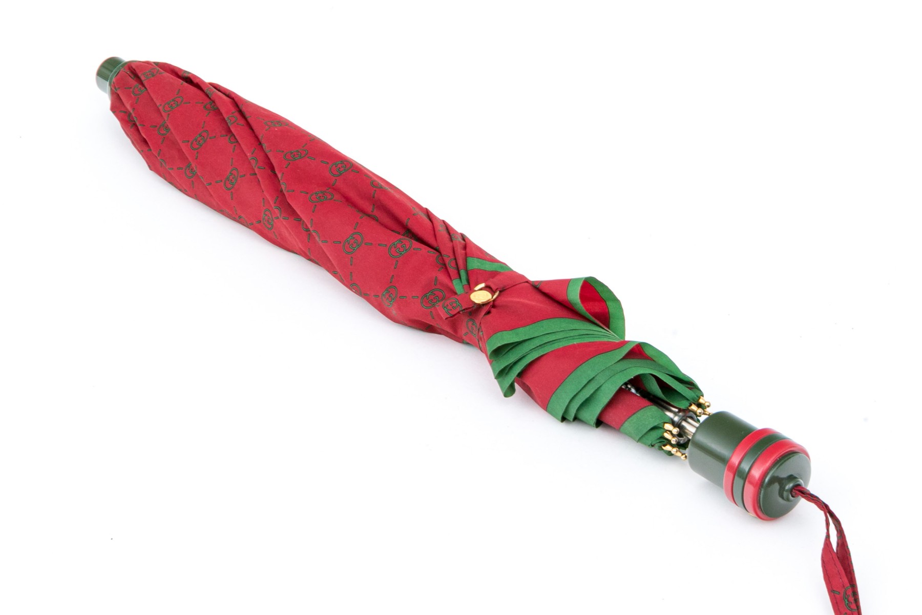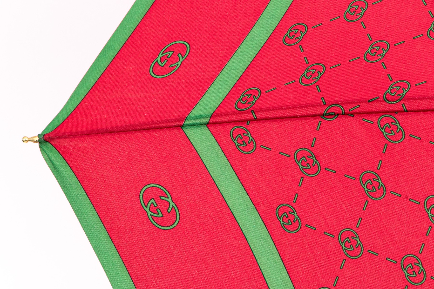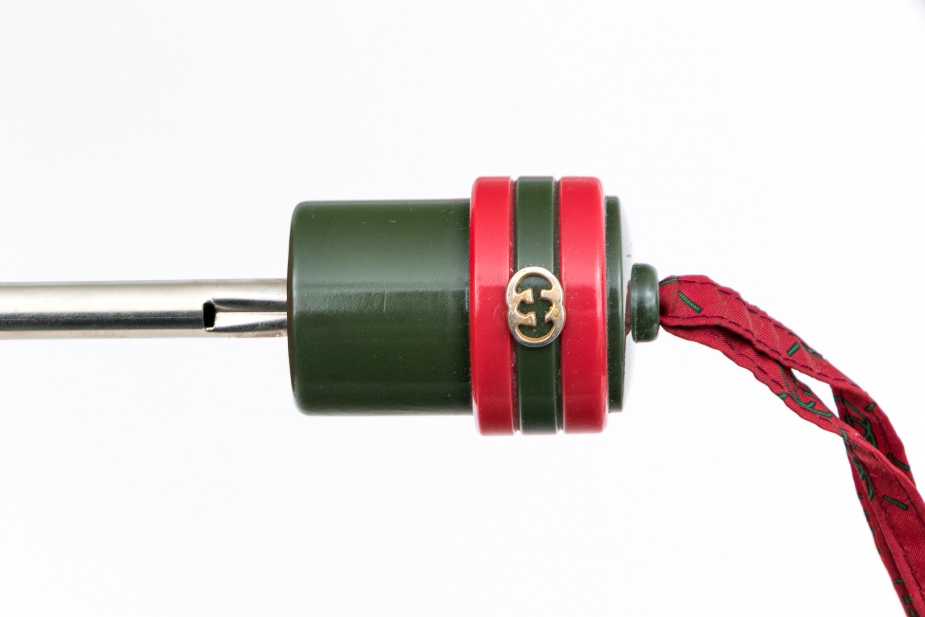 Red and green canopy with Gucci monogram decorative motif with a green and red resin handle with silk armband.