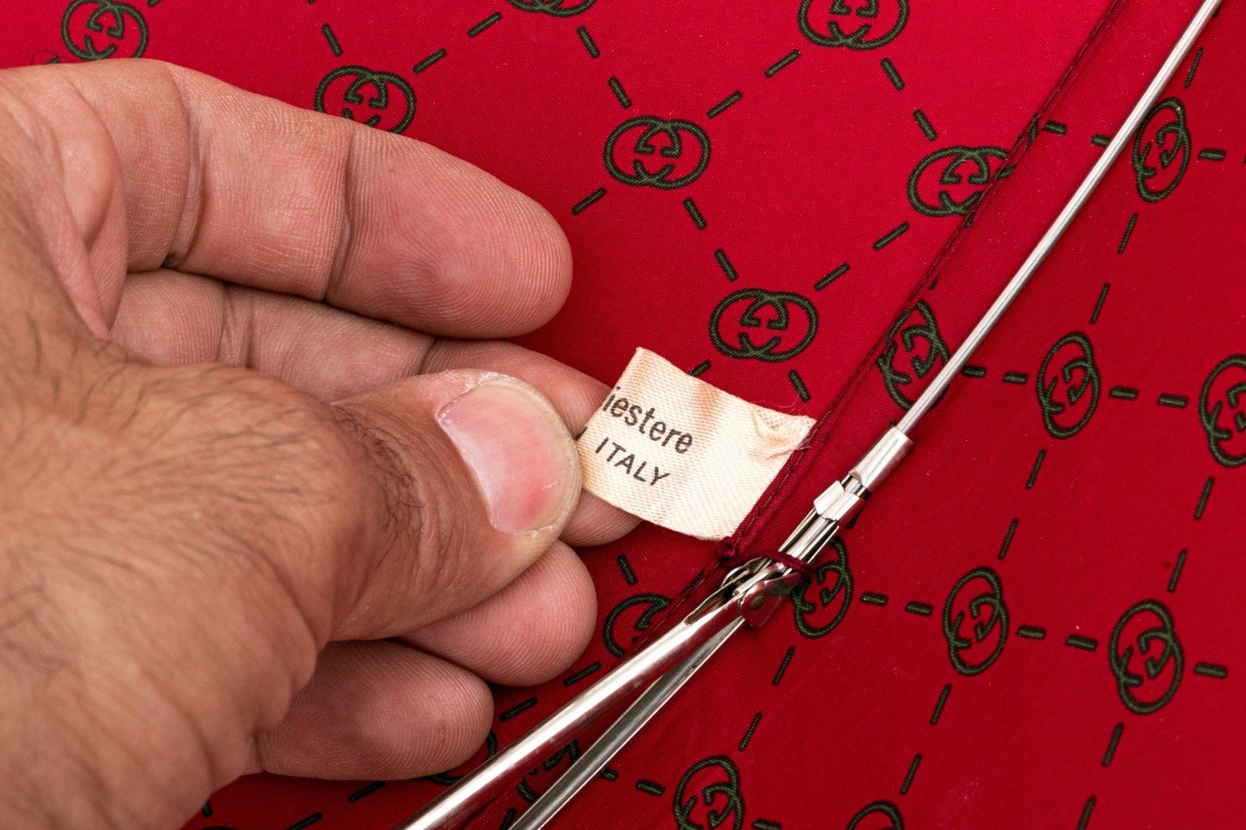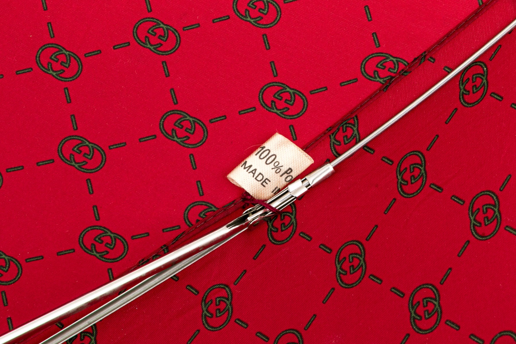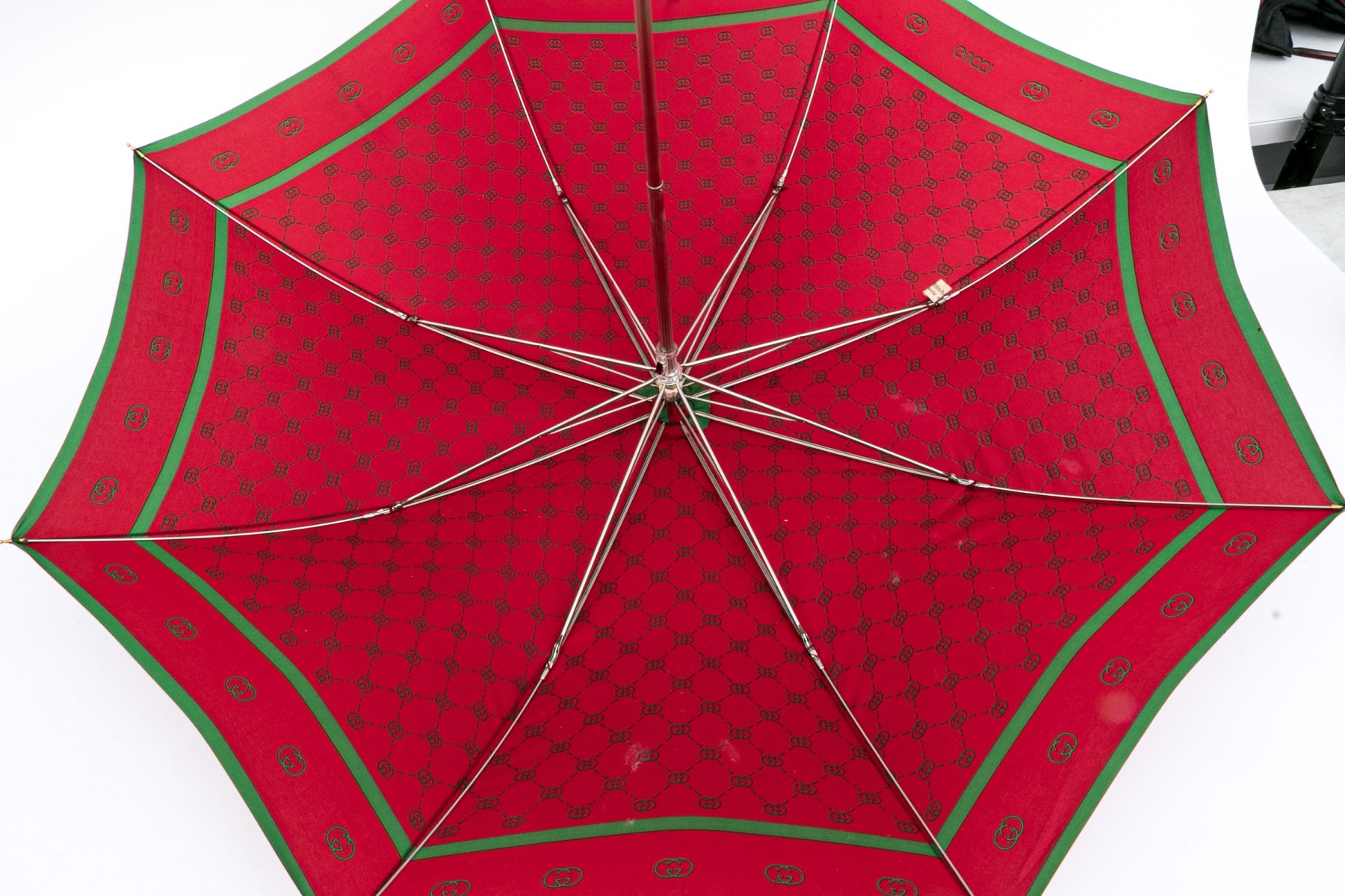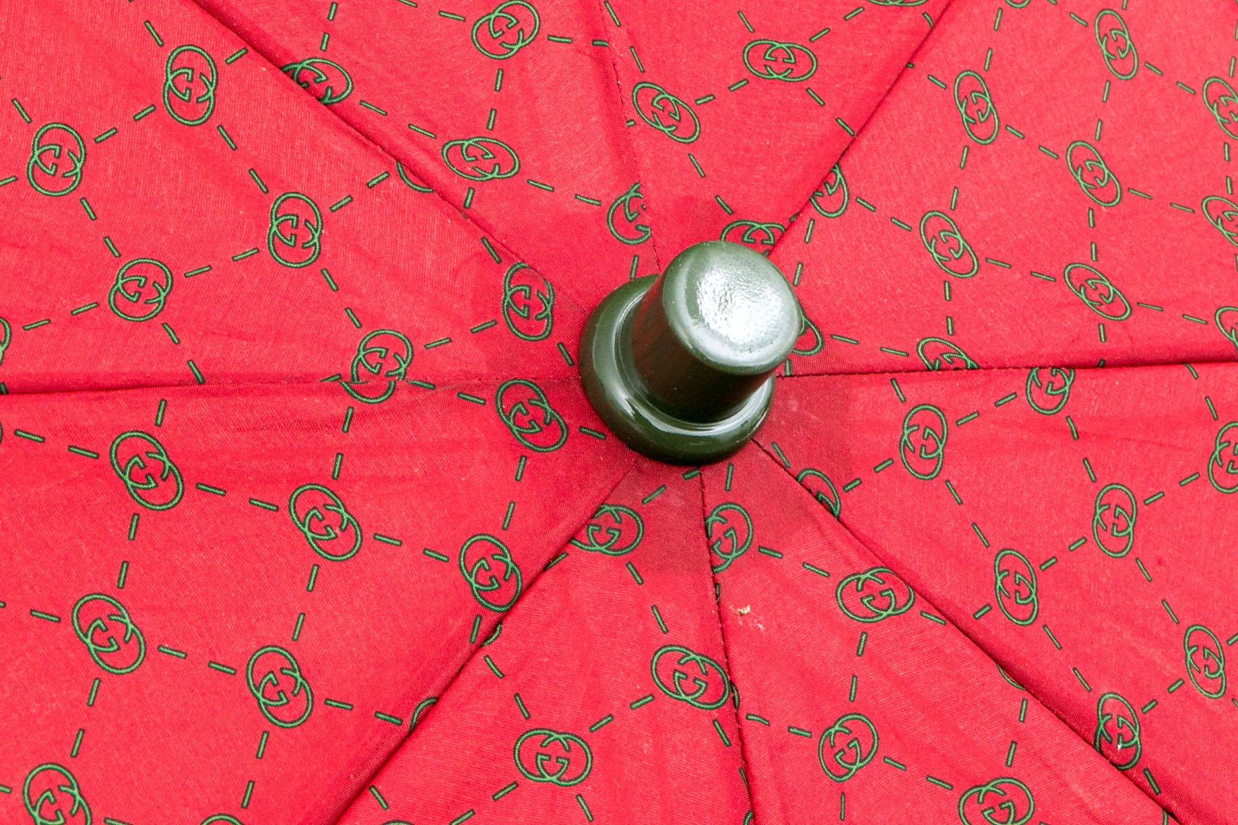 Red and green canopy with Gucci monogram decorative motif with a green and red resin handle with silk armband.
