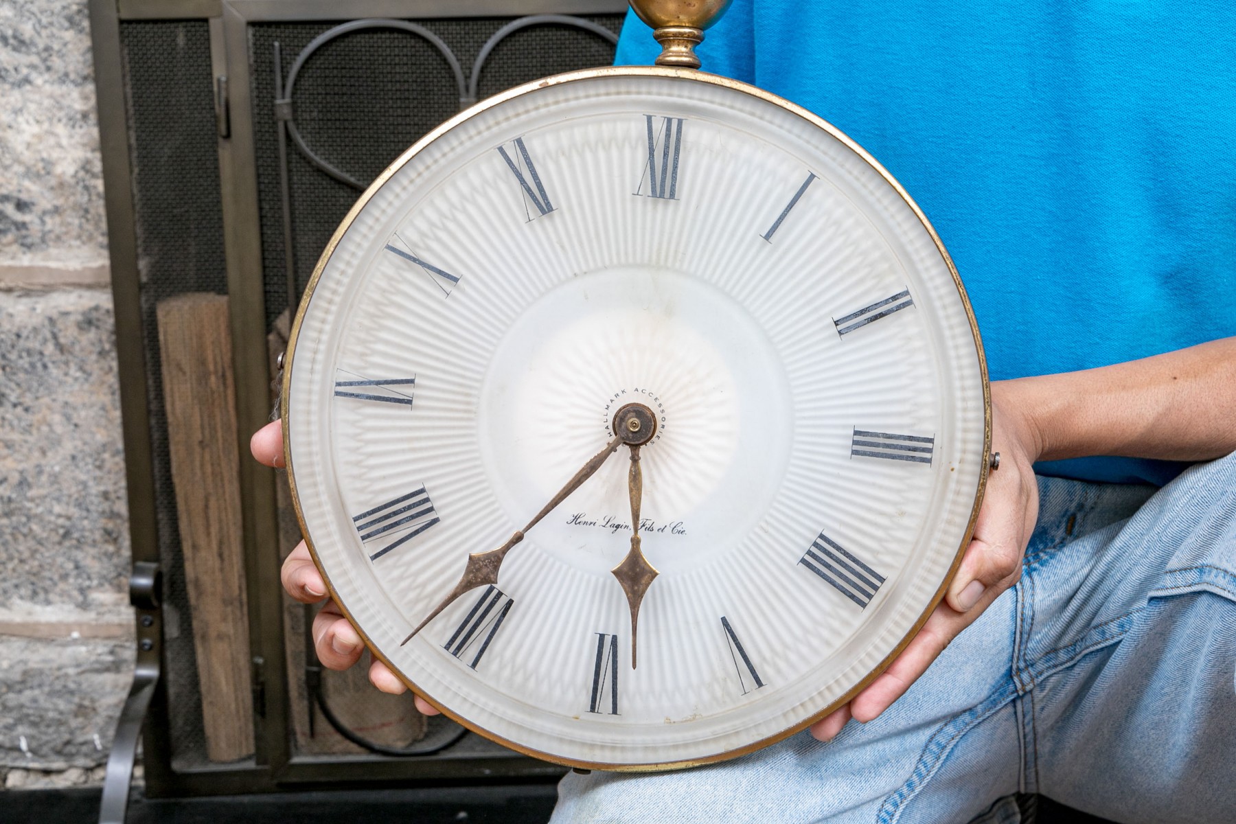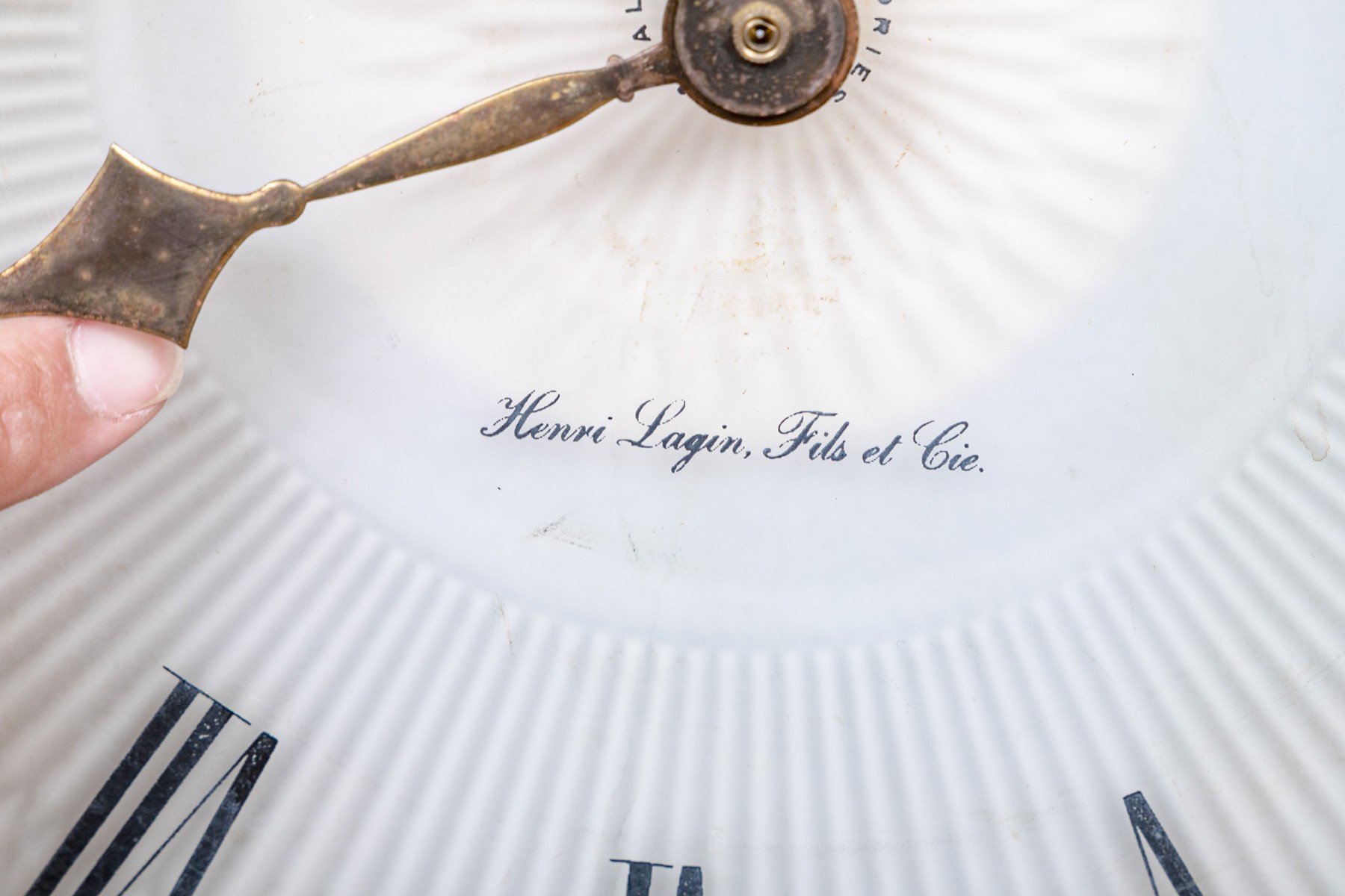 A wonderful brass and moulded glass open face pocket watch wall clock. Signed "Henri Lagin, Fils et Cie." A beautiful and intriguing wall piece for any room.