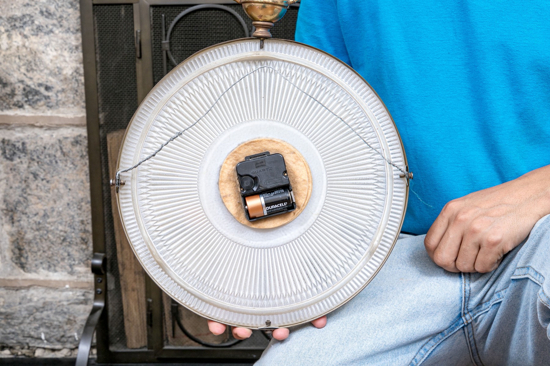 Condition: The brass cases pitted, the finial damaged, the original mechanism replaced with a battery, see images, still makes a great decorative piece