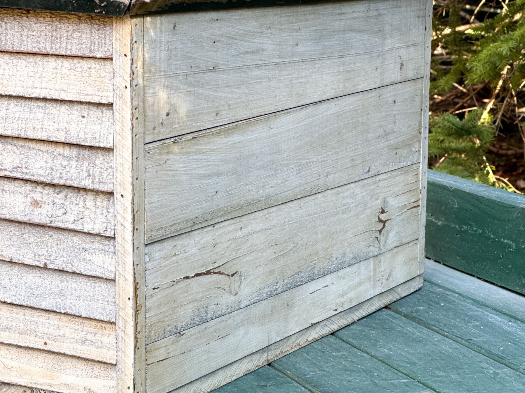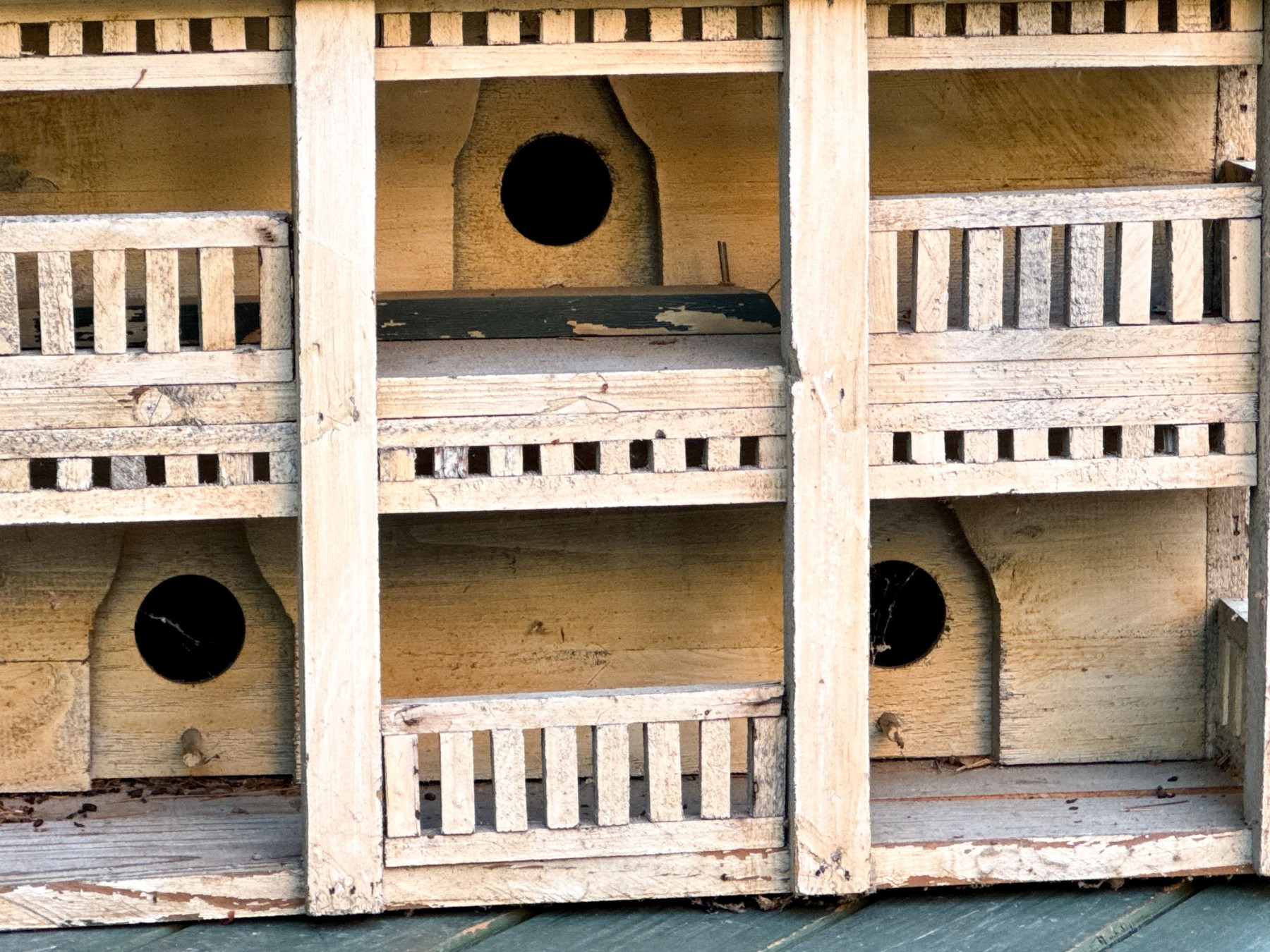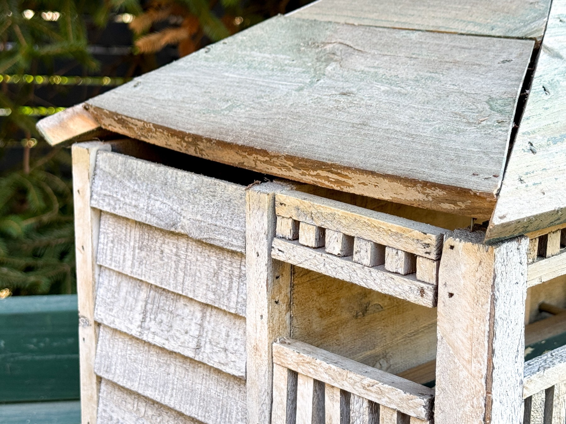 A delightful vintage wood birdhouse with a two story architectural design hand-painted white with a gray roof.
