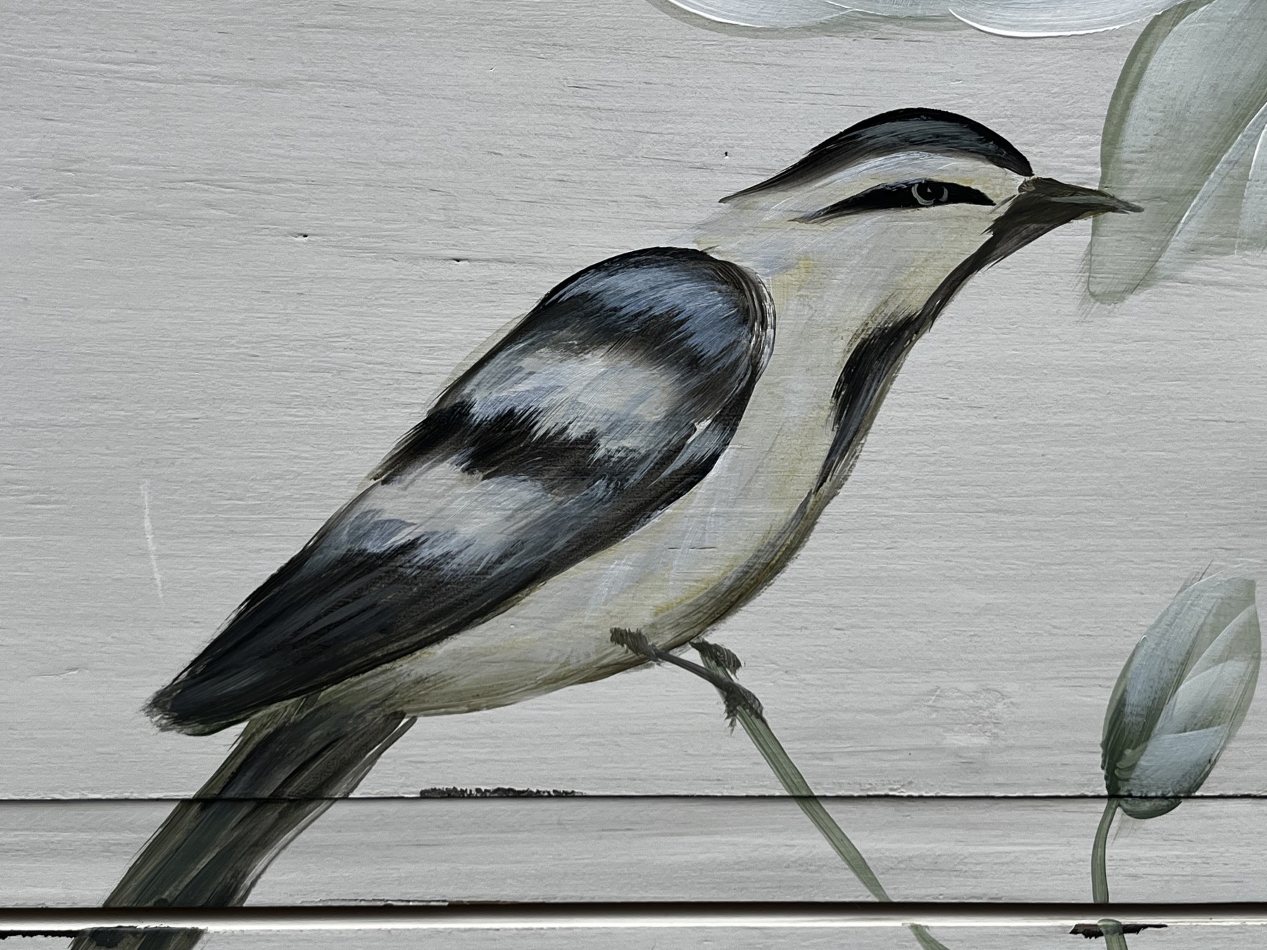 The three spacious drawers offer ample storage space for your belongings, while the unique hand-painted design adds a touch of natural beauty and elegance. The intricate details and vibrant colors of the birds, flowers, and butterflies create a mesmerizing visual display.