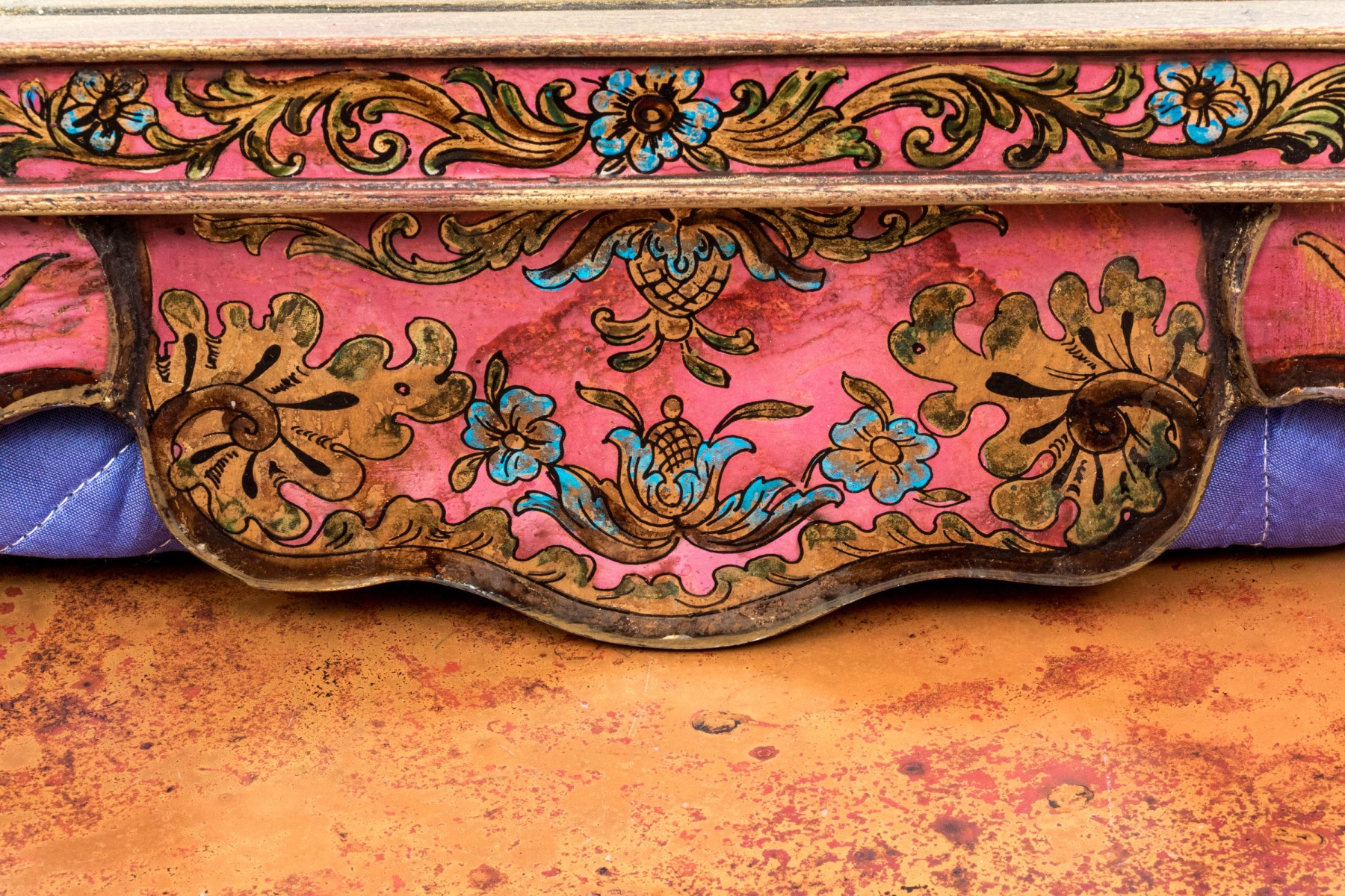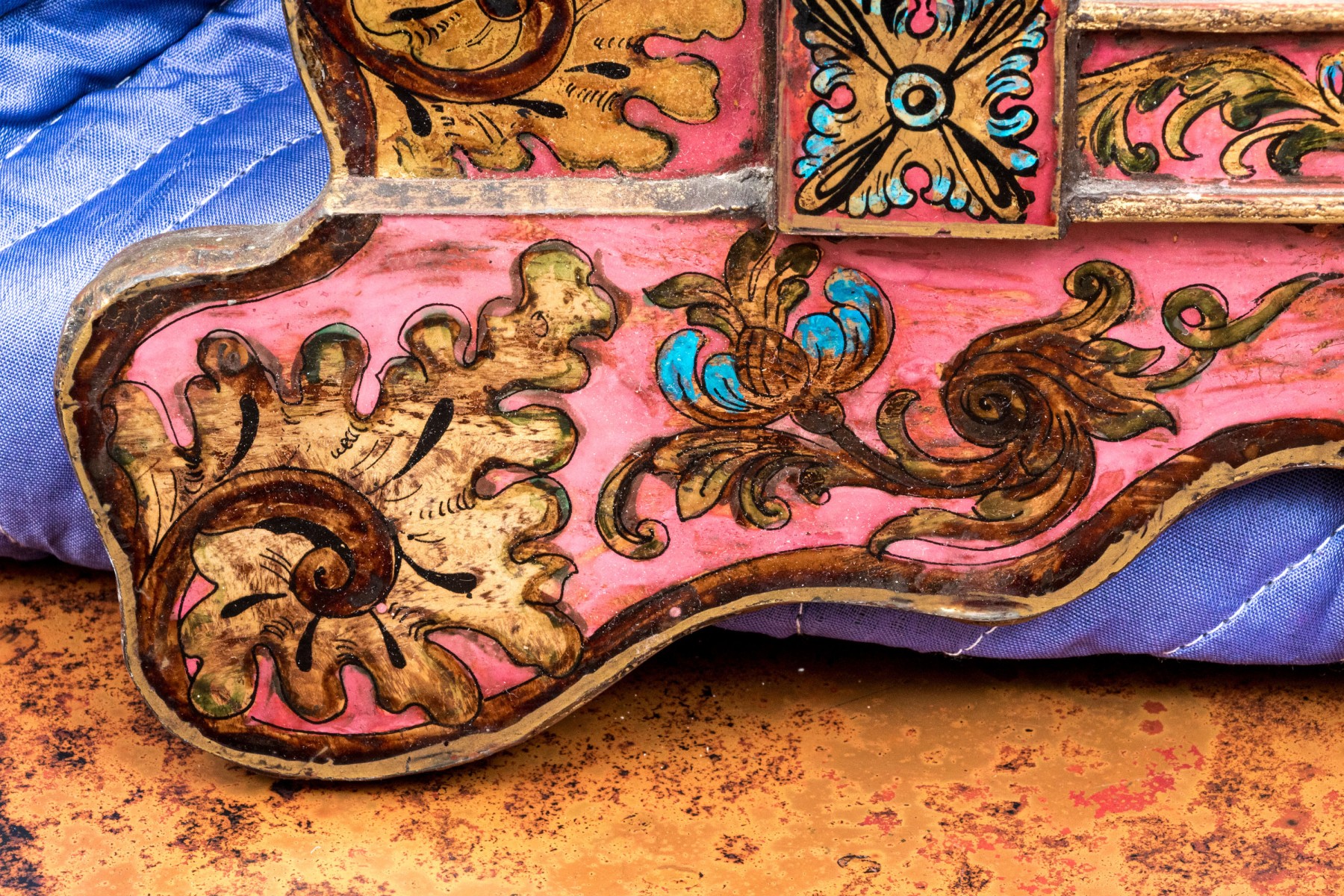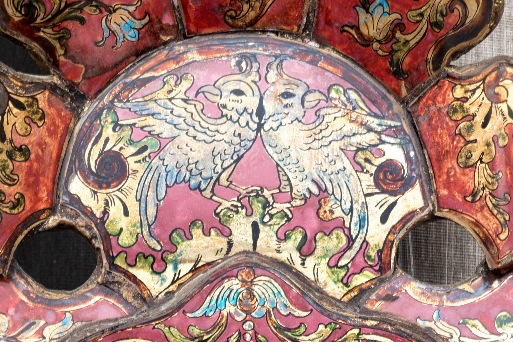 Handsomely painted with gilt scroll motif on red ground. The painted sections are below thick glass segments for protection.