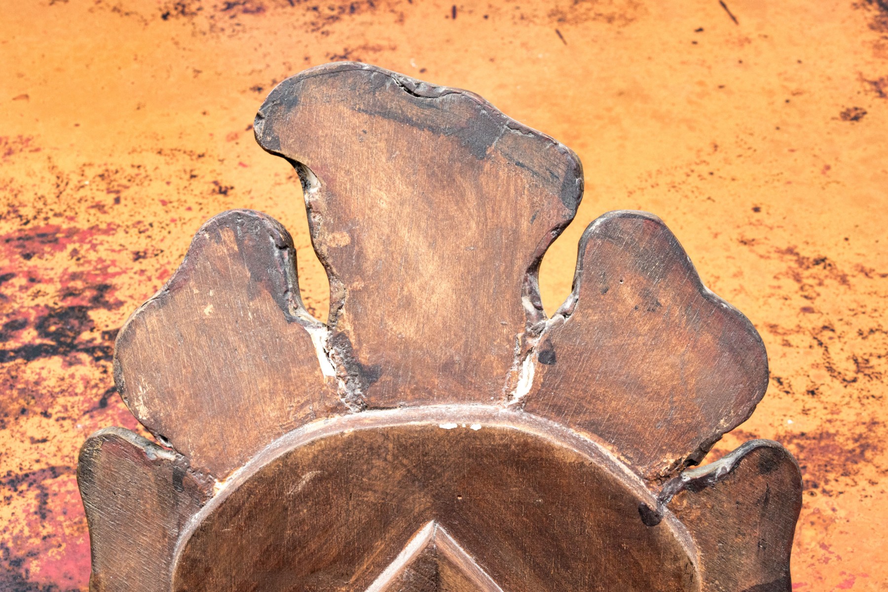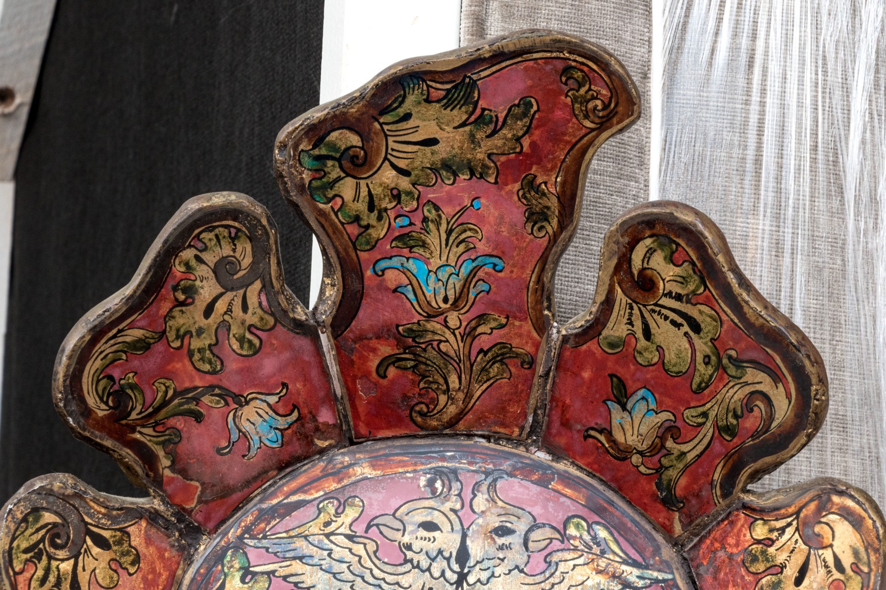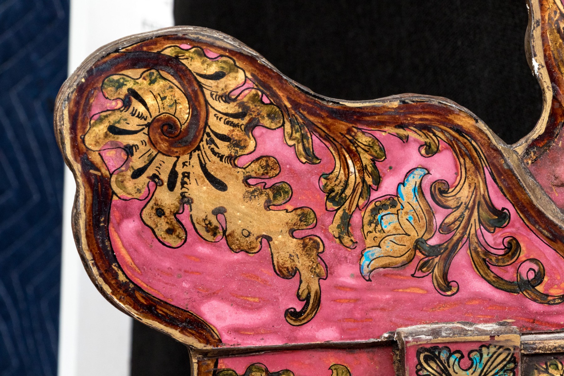 Handsomely painted with gilt scroll motif on red ground. The painted sections are below thick glass segments for protection.