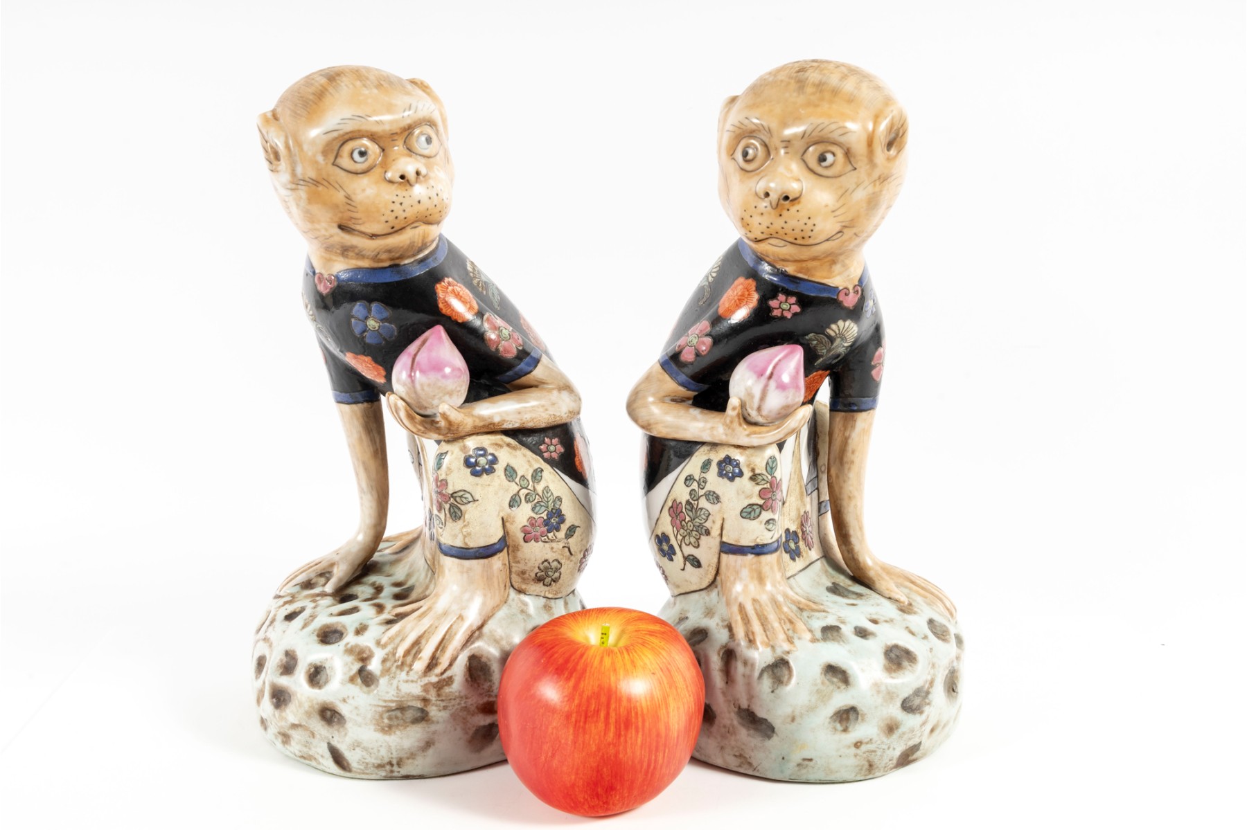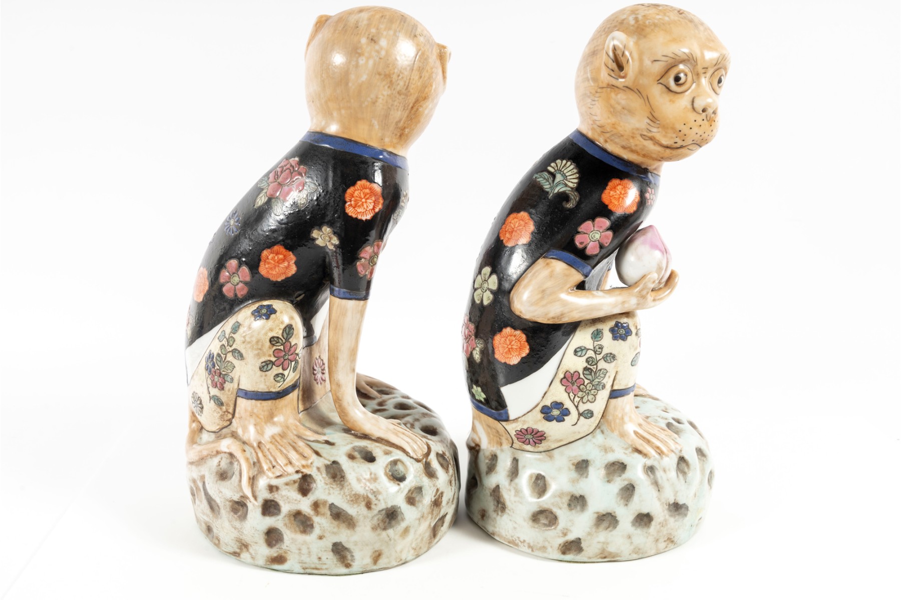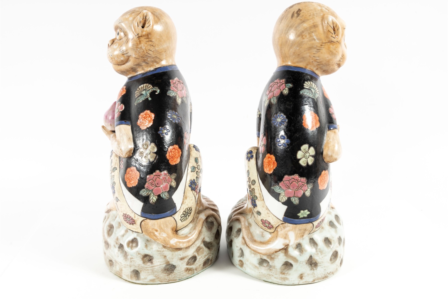 A pair of decorative Chinese monkey statues crafted of fine porcelain, hand-painted with outlined facial features and dawning floral clothing. Each example is stamped with an indistinct red seal at the bottom. Circa late Qing Dynasty.