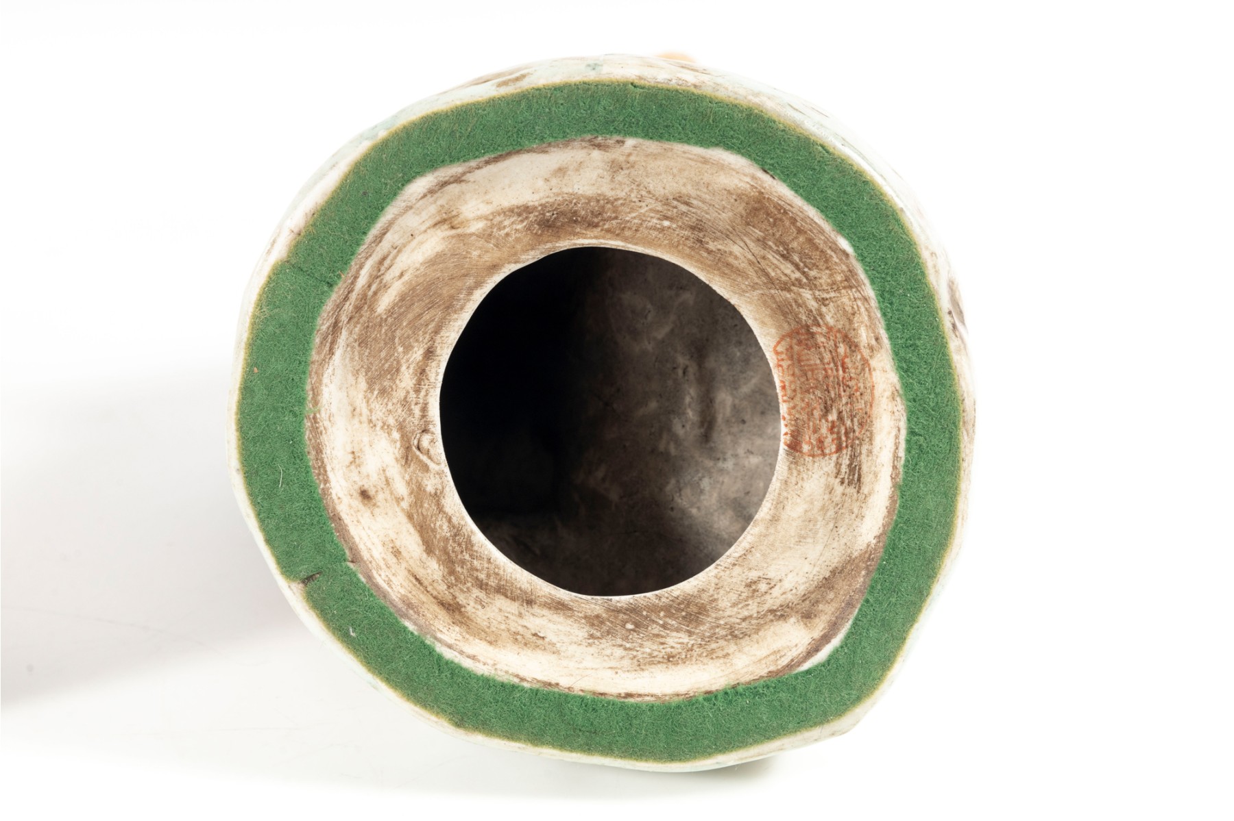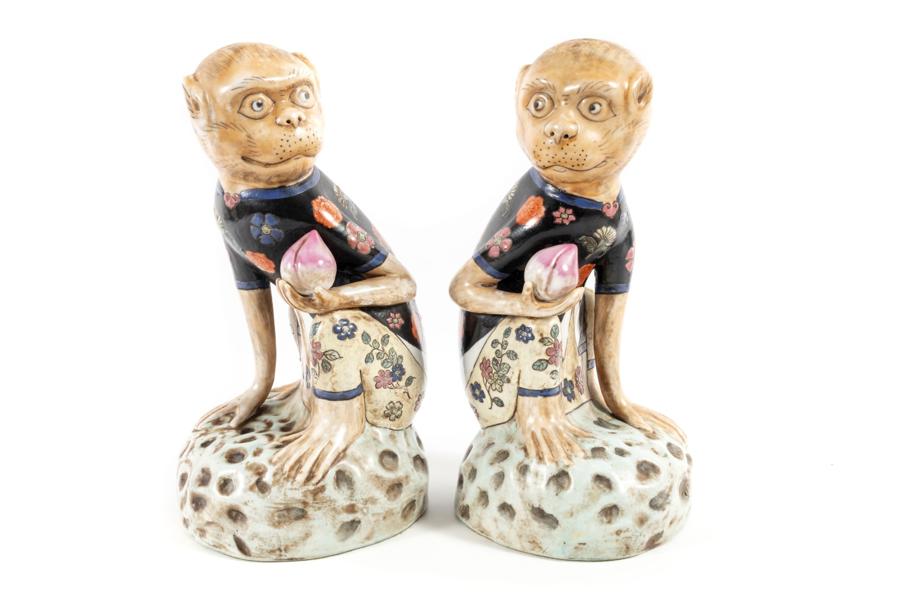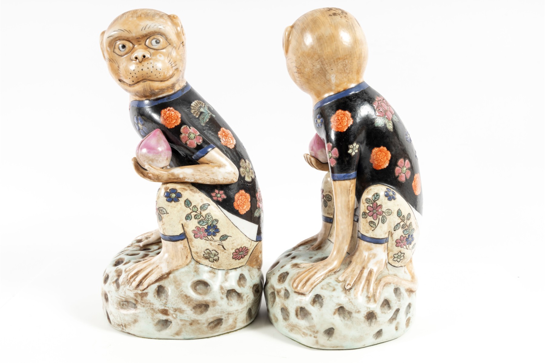 A pair of decorative Chinese monkey statues crafted of fine porcelain, hand-painted with outlined facial features and dawning floral clothing. Each example is stamped with an indistinct red seal at the bottom. Circa late Qing Dynasty.