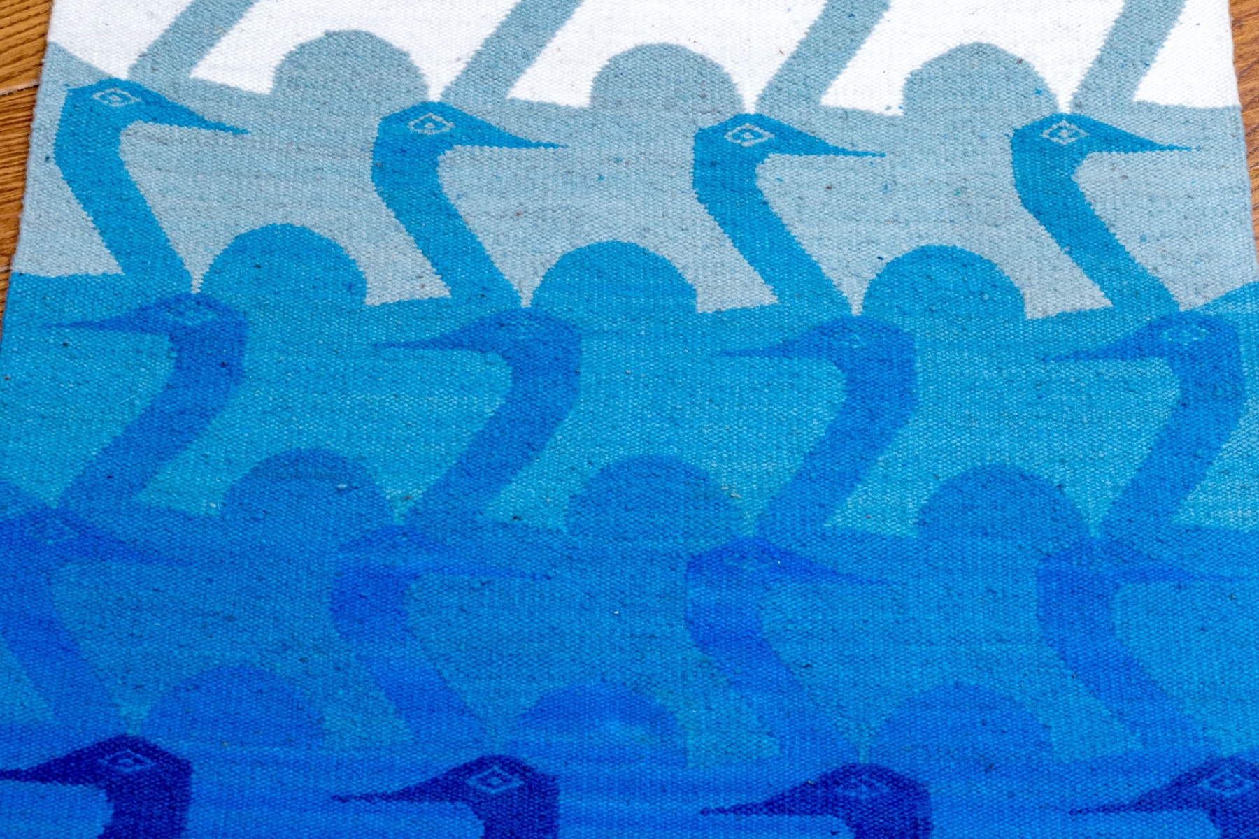 Depicting pelican in an ombre ivory to blue to black color way with tassels and loped accents on each end.