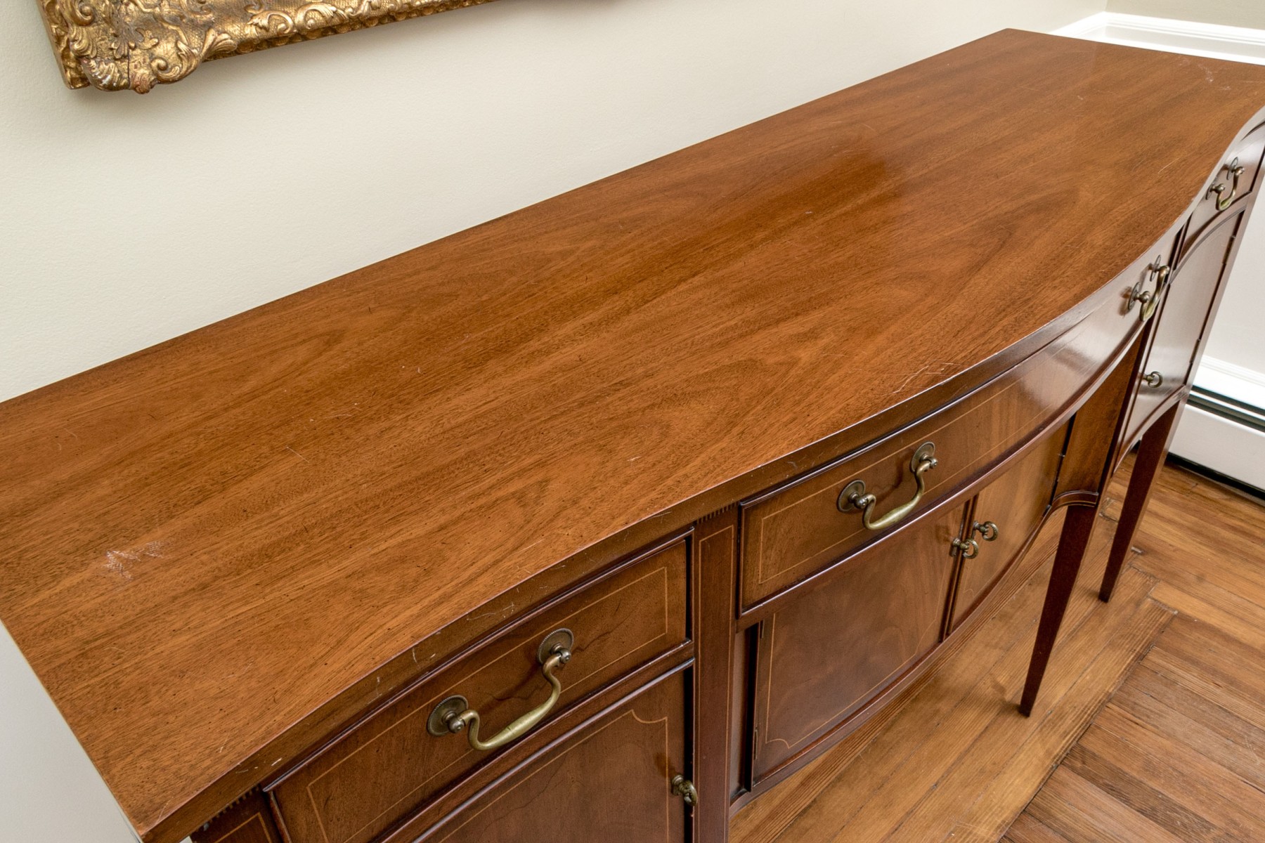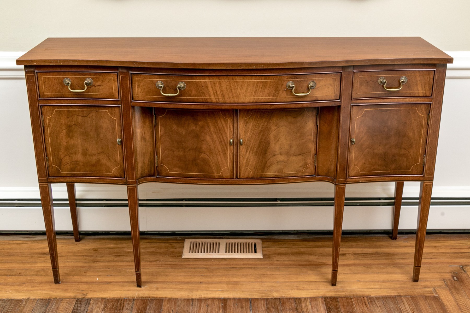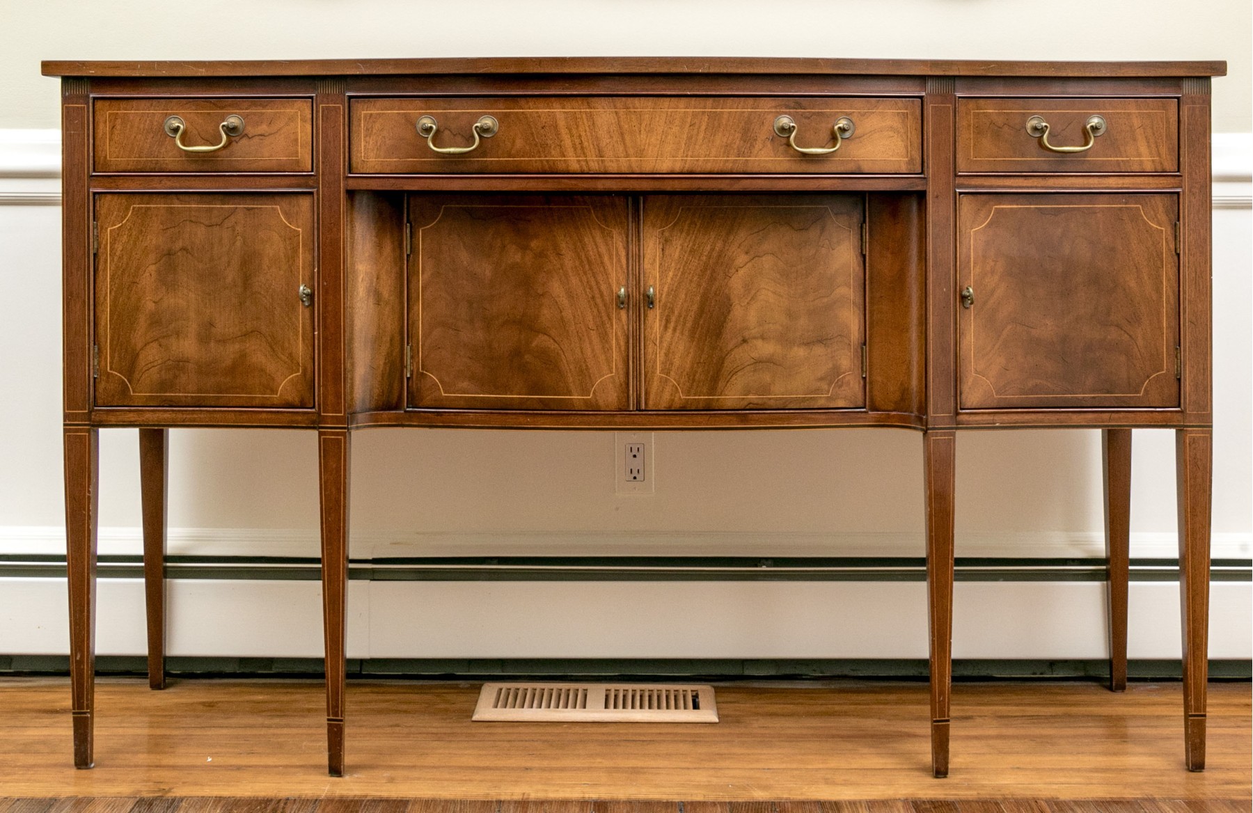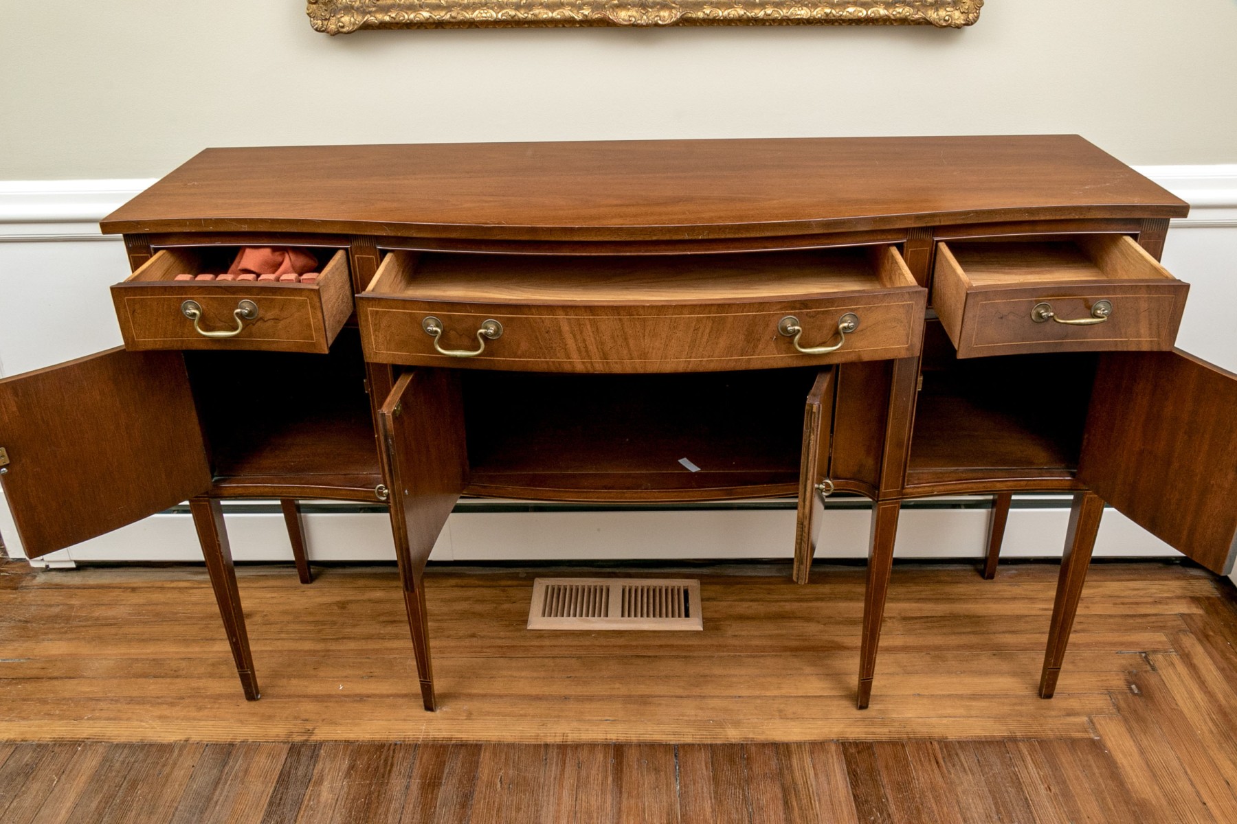 A vintage Hickory Chair Co. sideboard in gorgeous honeyed medium brown mahogany with fine inlaid borders. Features a subtle serpentine bowfront over three upper drawers, leading to single door cabinets flanking a central recessed double door cabinet opening to a spacious interior. The top left drawer is fitted with a salmon pink silverware liner.