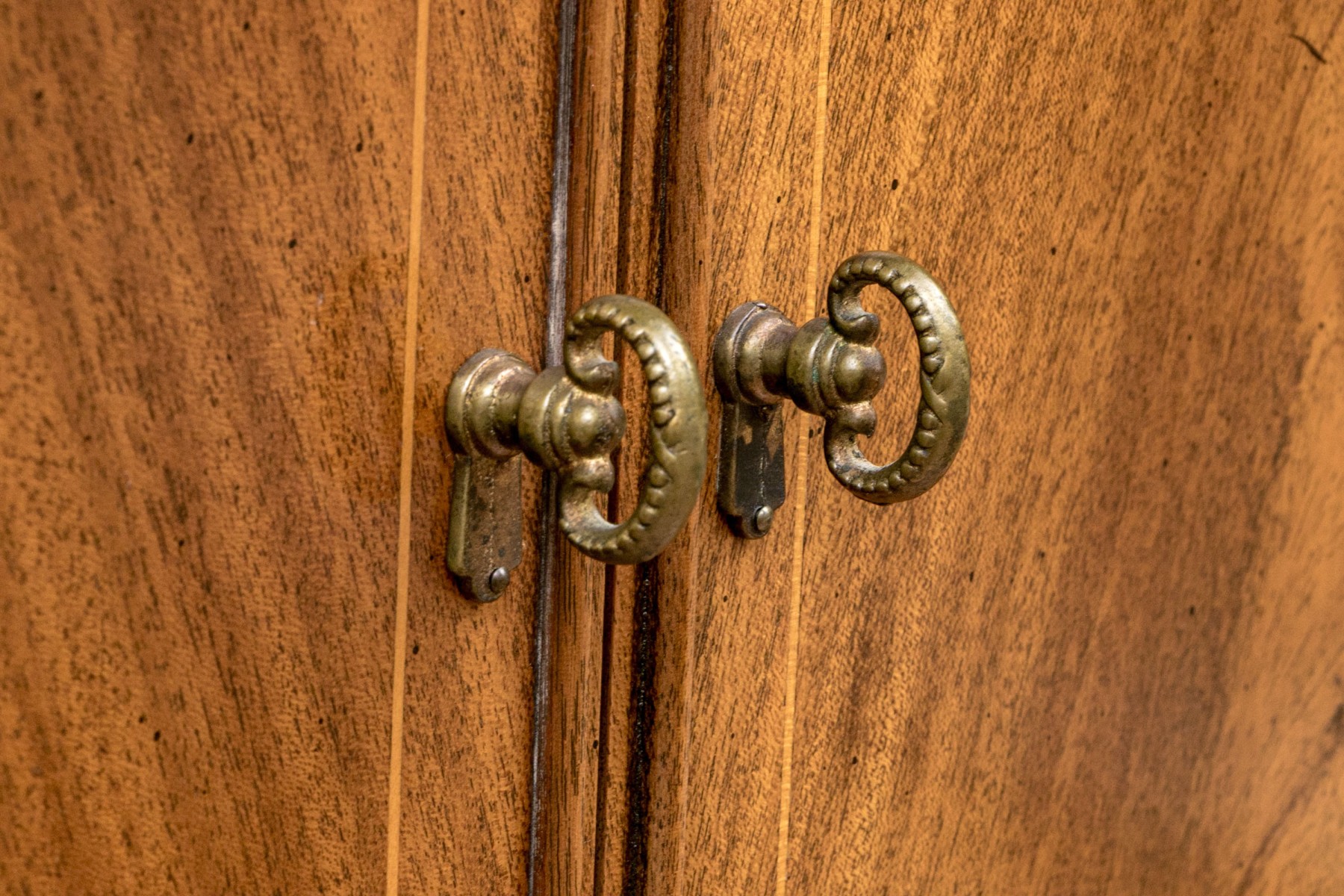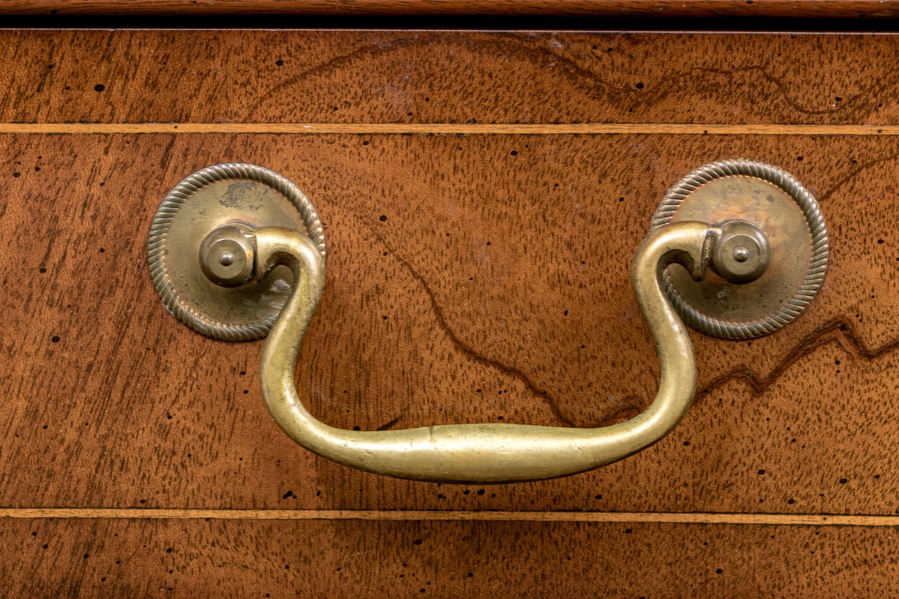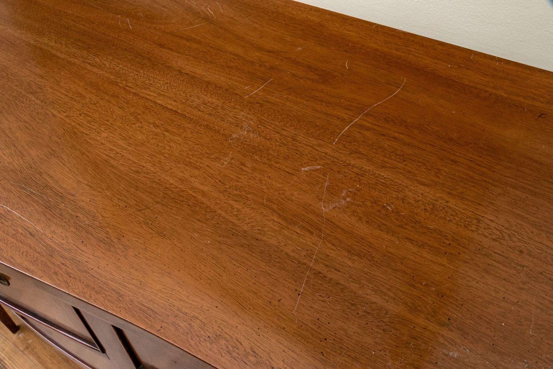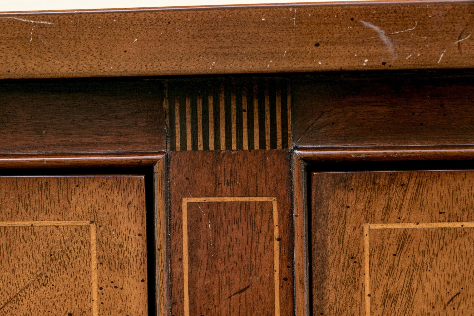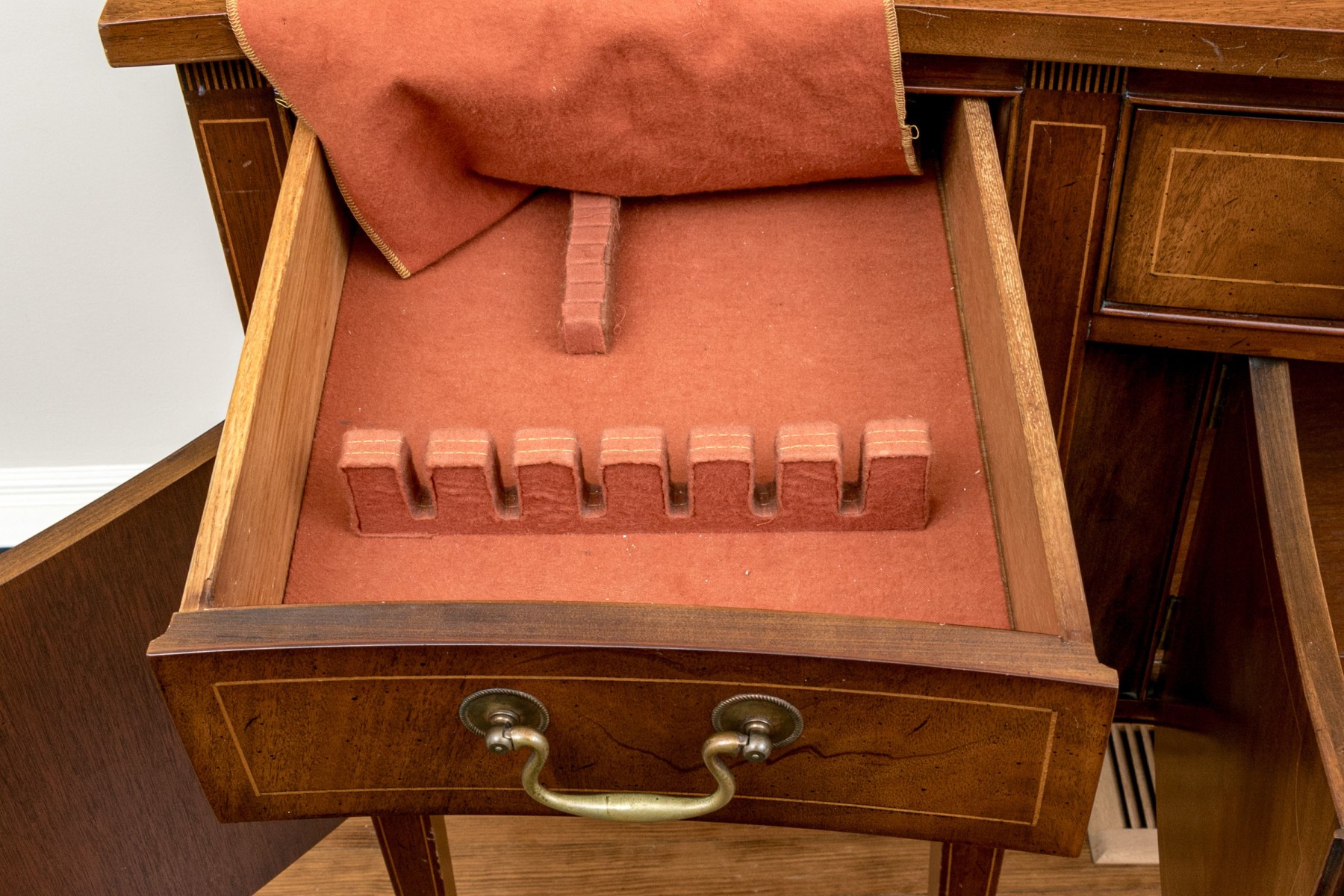 A vintage Hickory Chair Co. sideboard in gorgeous honeyed medium brown mahogany with fine inlaid borders. Features a subtle serpentine bowfront over three upper drawers, leading to single door cabinets flanking a central recessed double door cabinet opening to a spacious interior. The top left drawer is fitted with a salmon pink silverware liner.