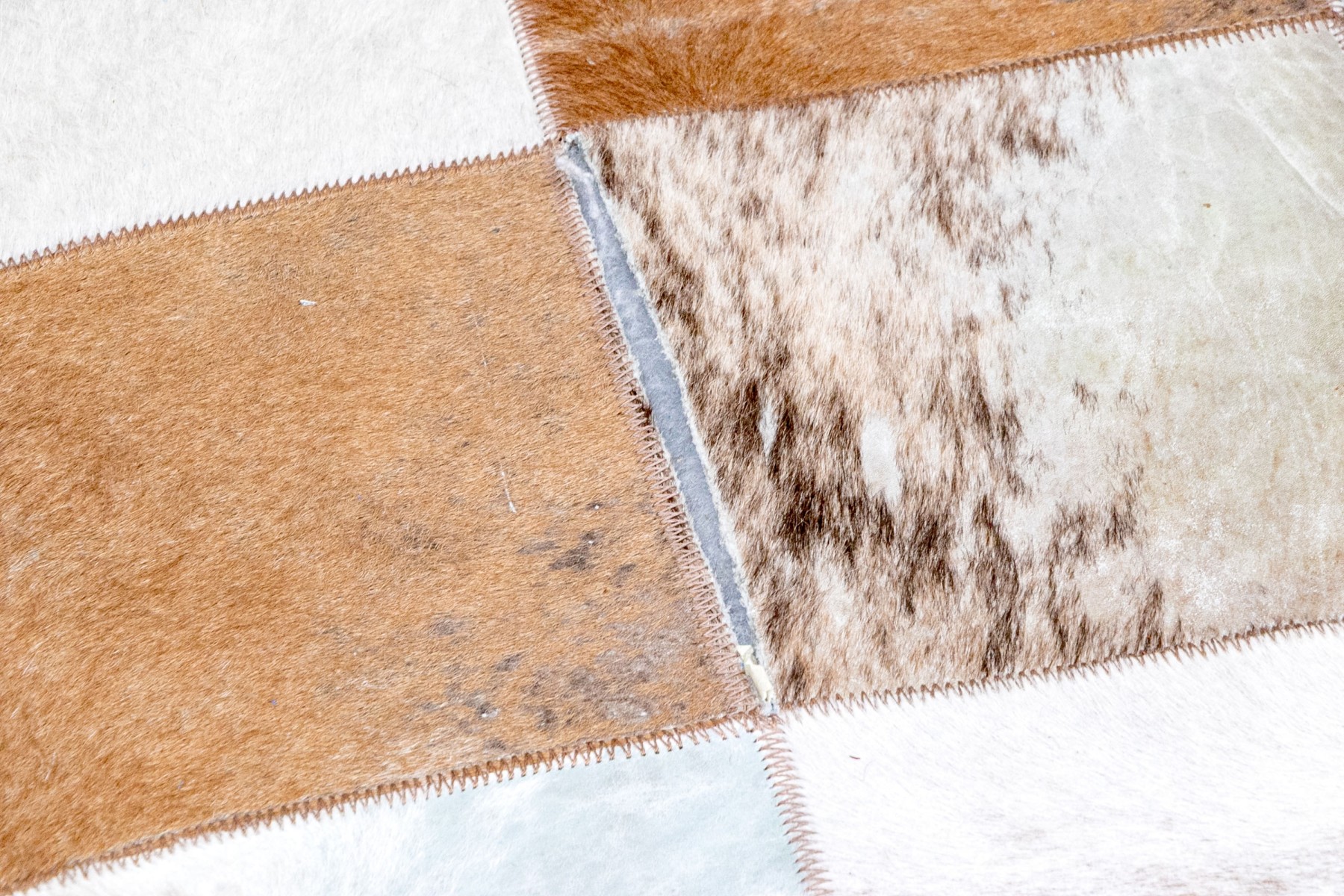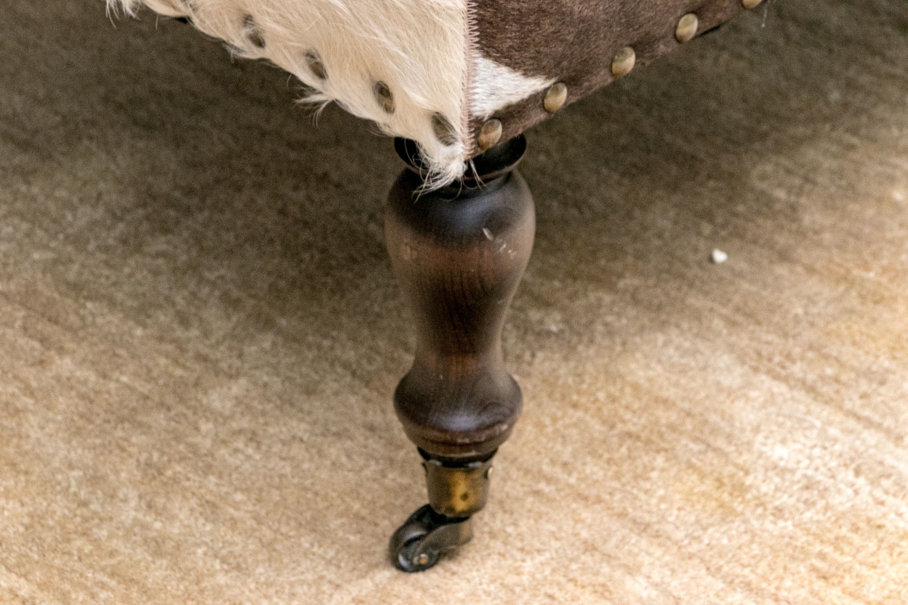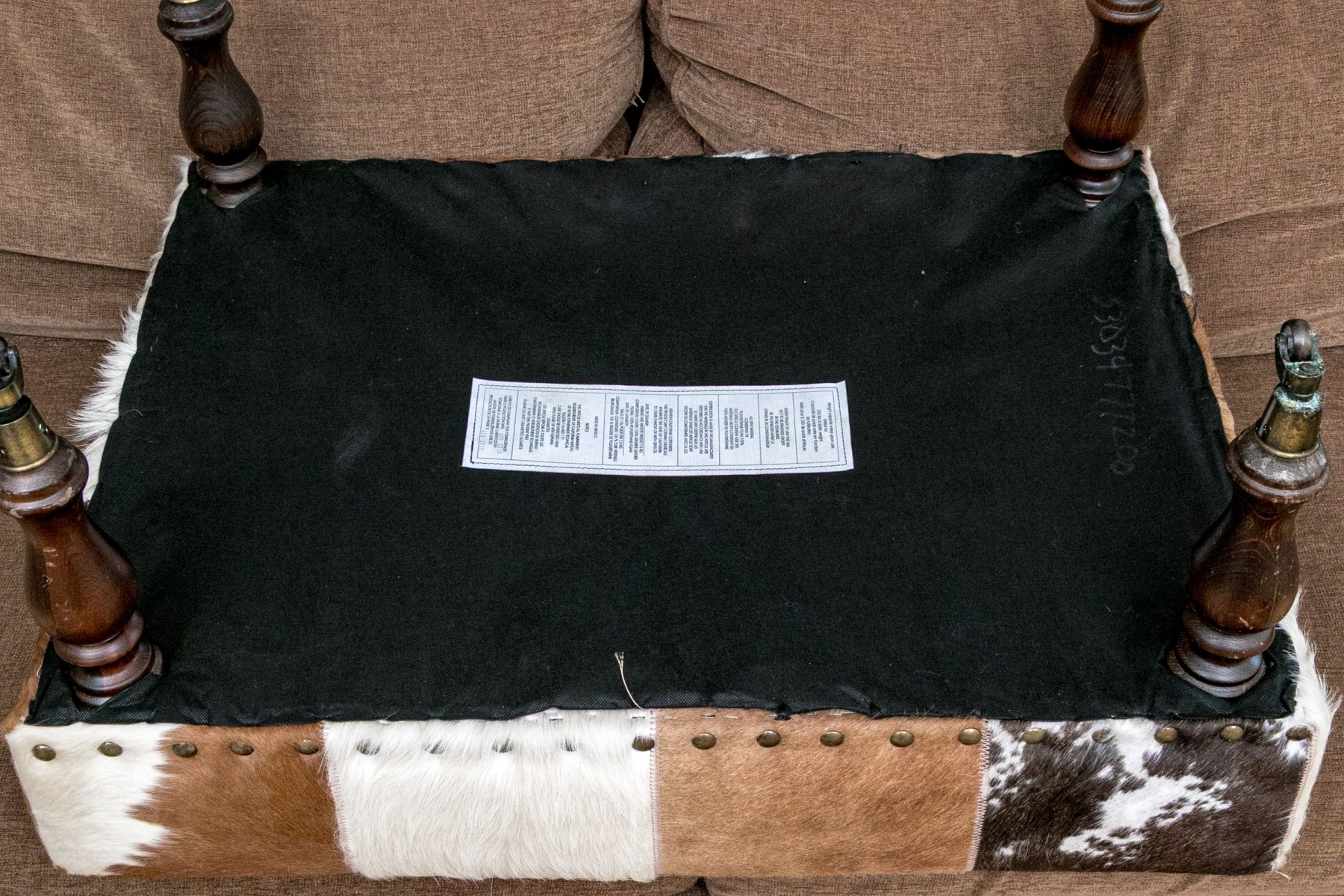 Tear along on seam to the hide on the top upholstered seat cushion. Some hide panels with heavier wear to the fur. Overall a handsome piece.